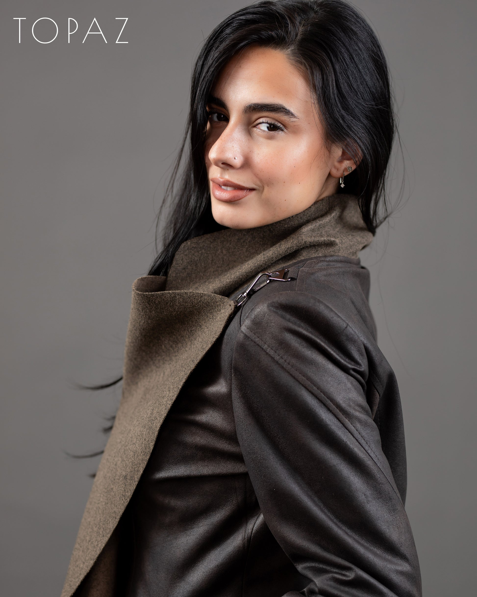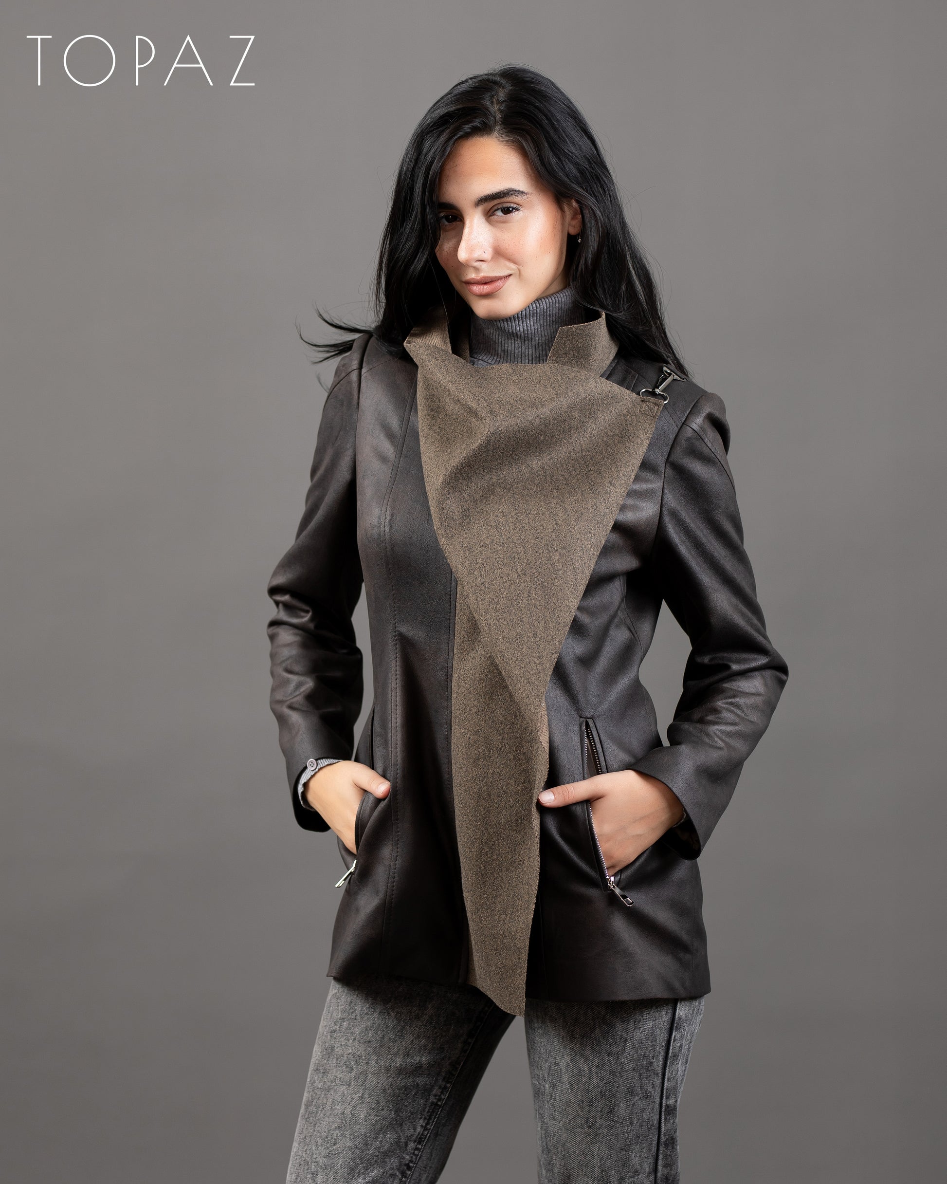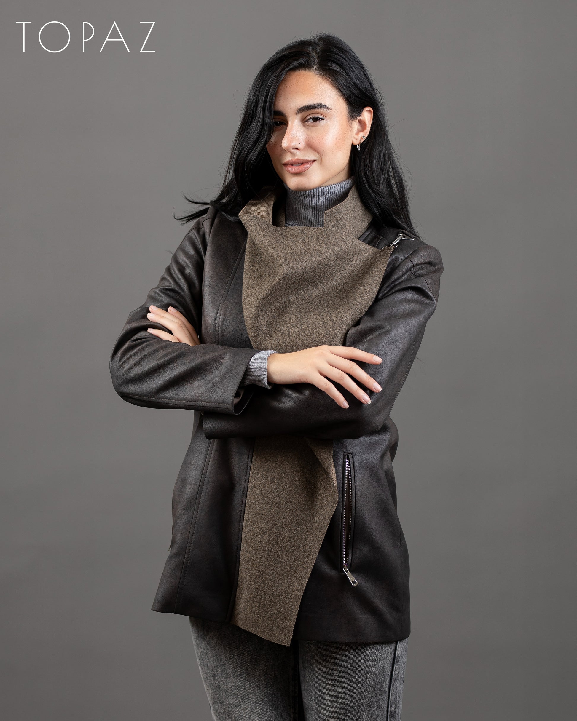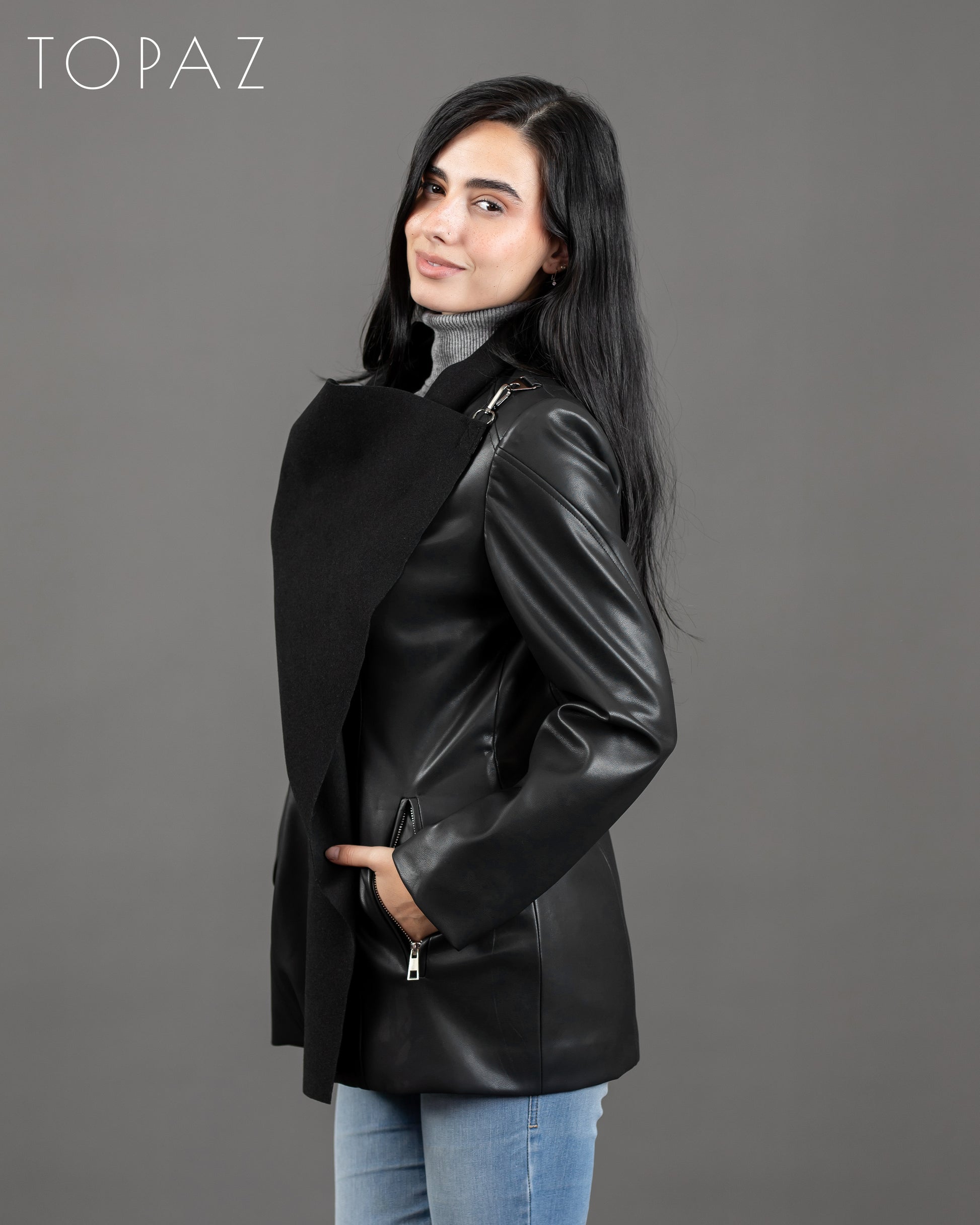 Jacket featuring an imported faux-leather fabric and soft wool paneling.