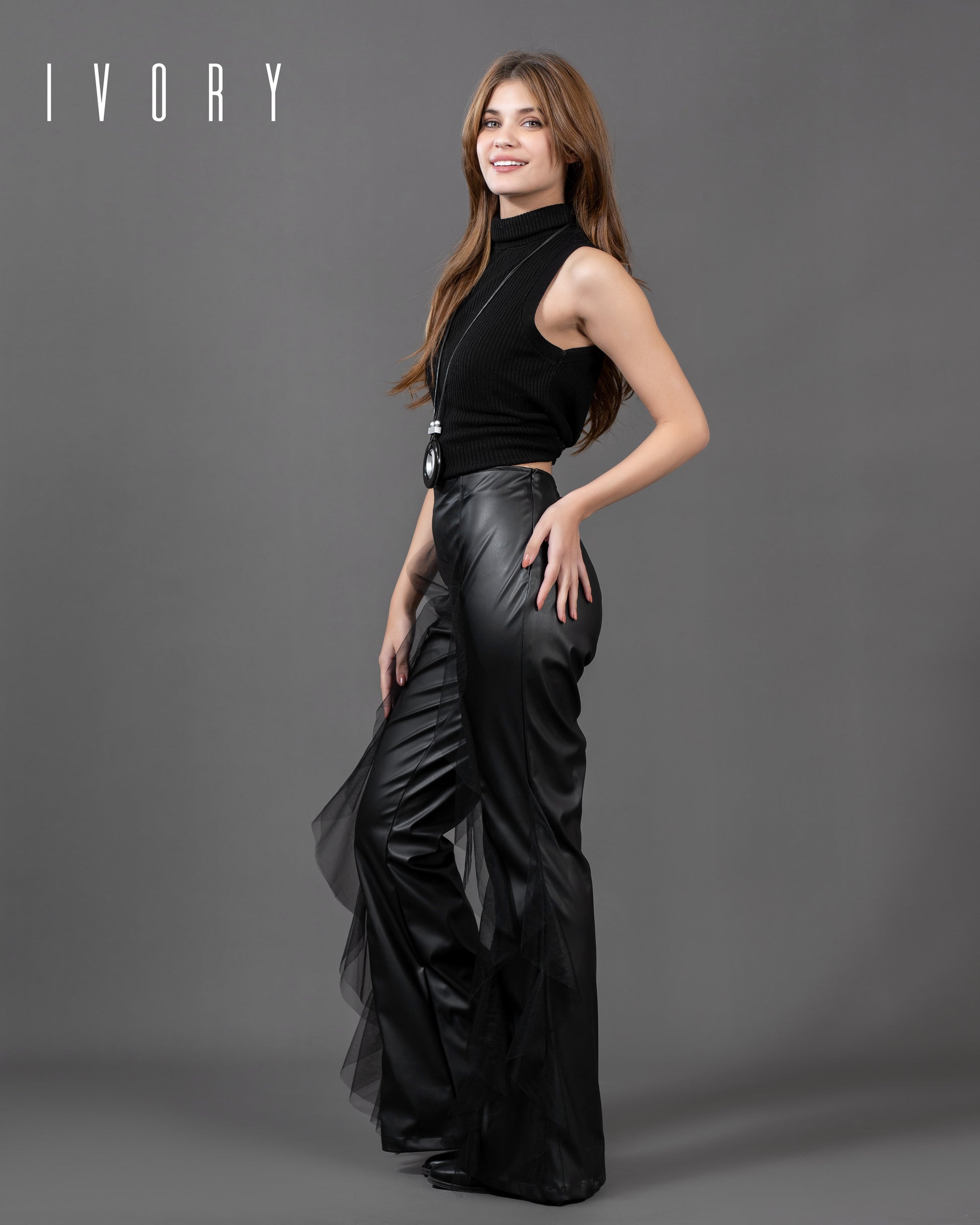 Pants featuring an imported leather fabric and tulle ruffle detailing.