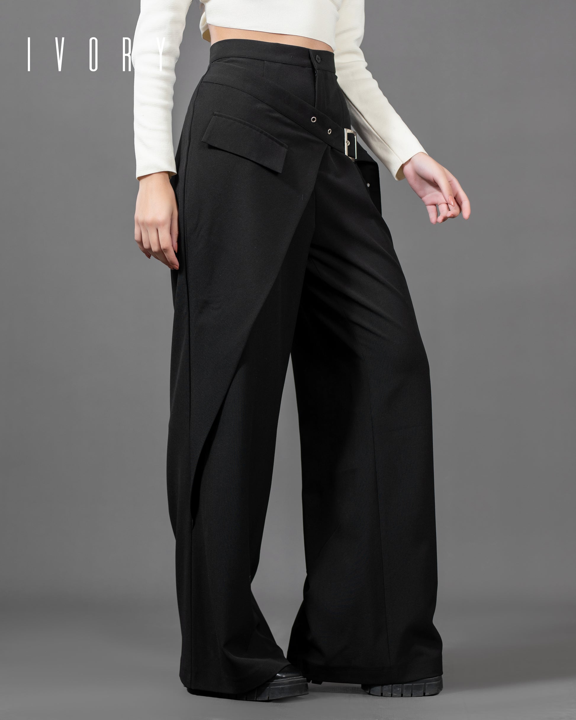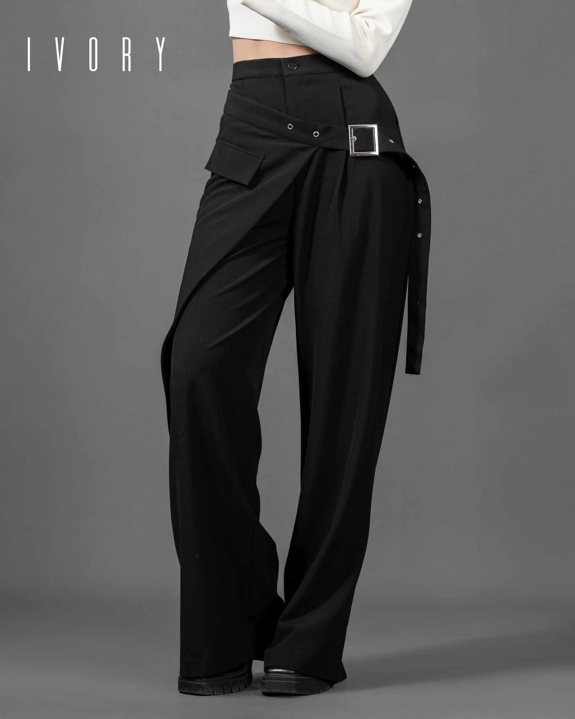 Pants featuring an imported TR fabric, panel and silver hardware detailing attached to a belt.