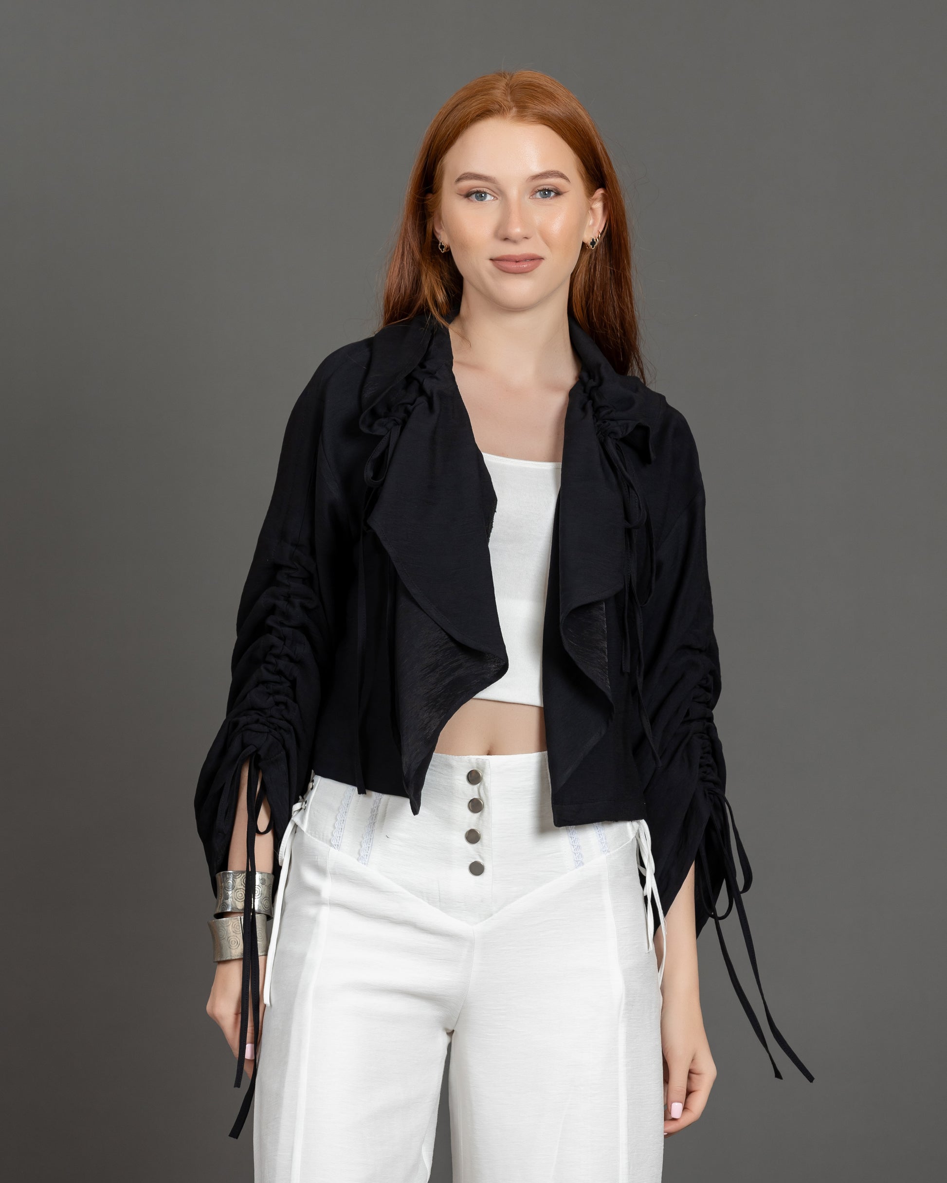 A ruffled jacket featuring an imported soft linen fabric, and ruche detailing on the collar and sleeves.