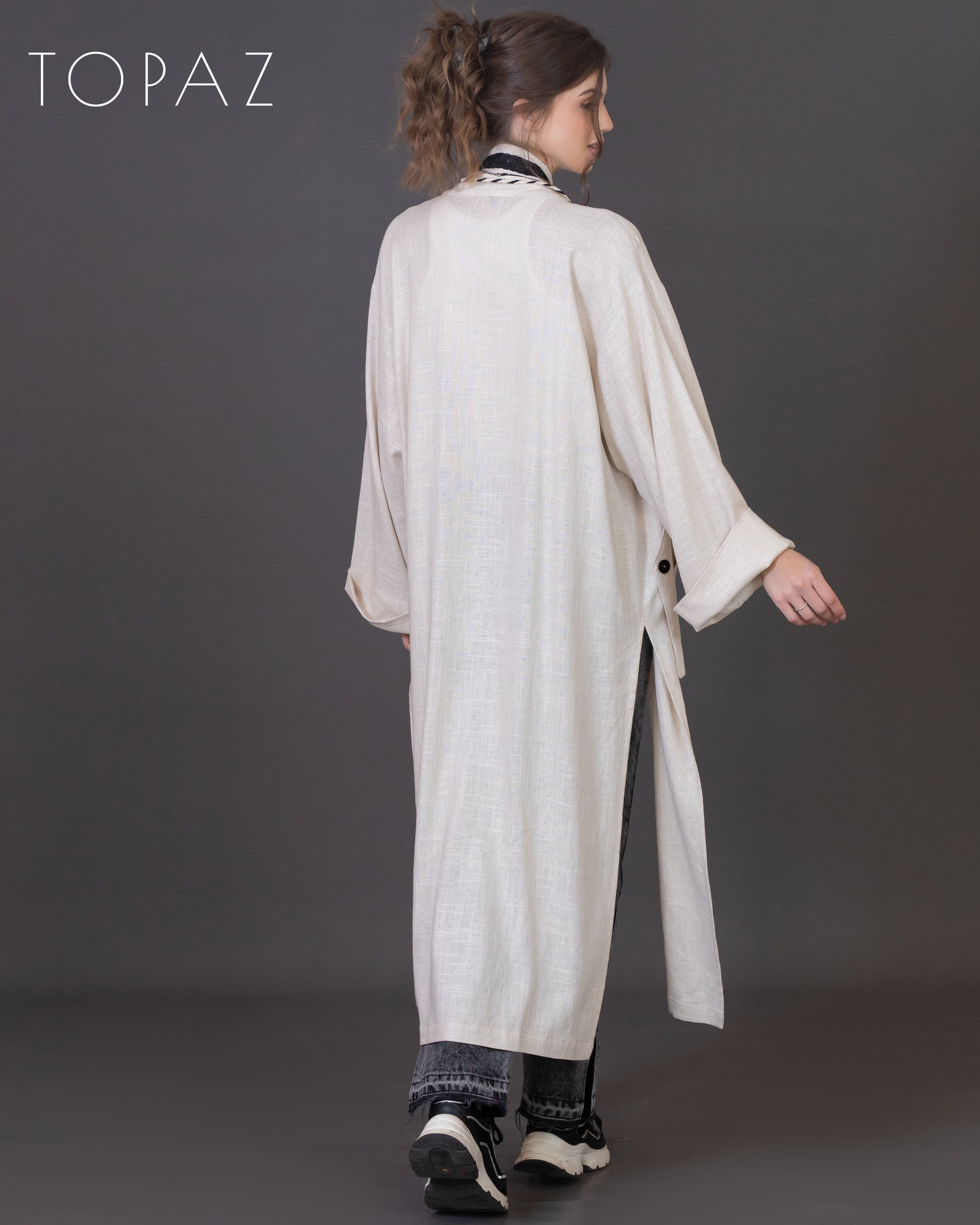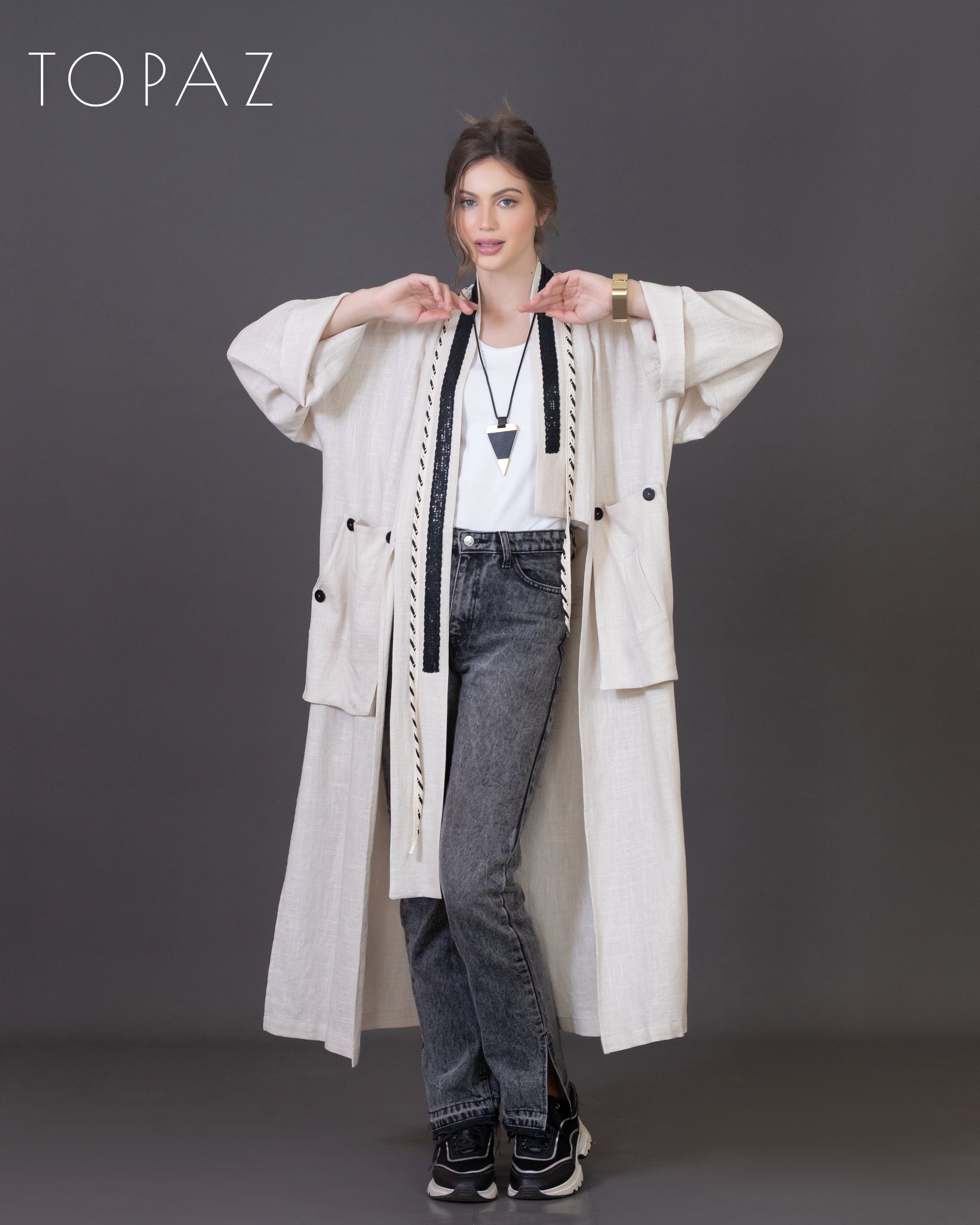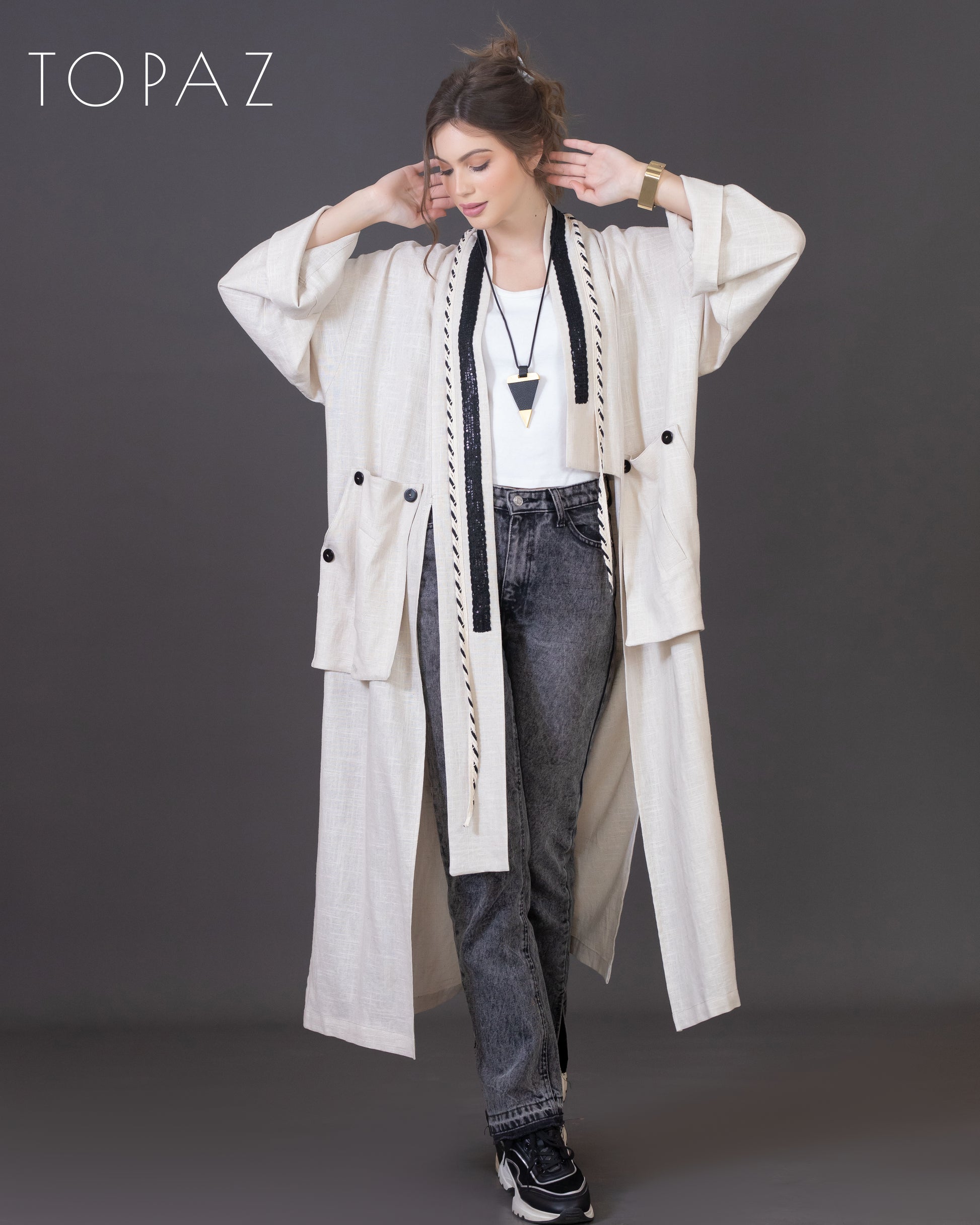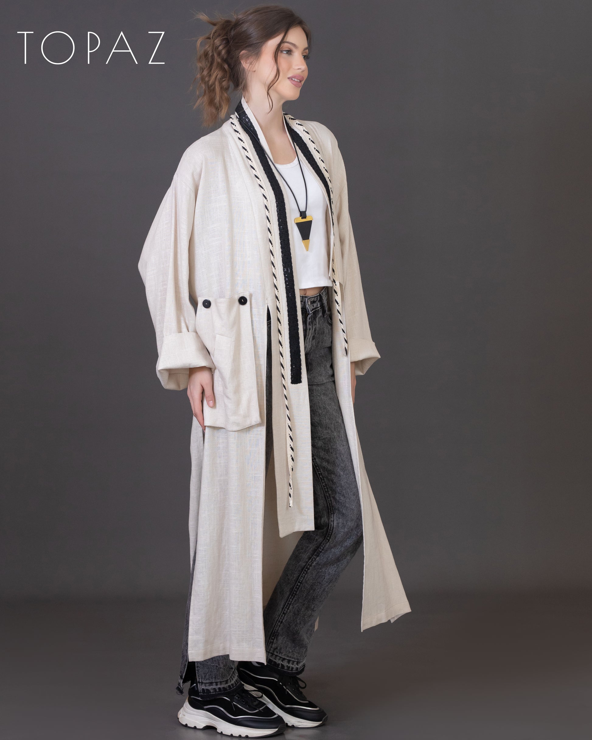 Cardigan featuring an imported soft linen fabric and sequin detailing.