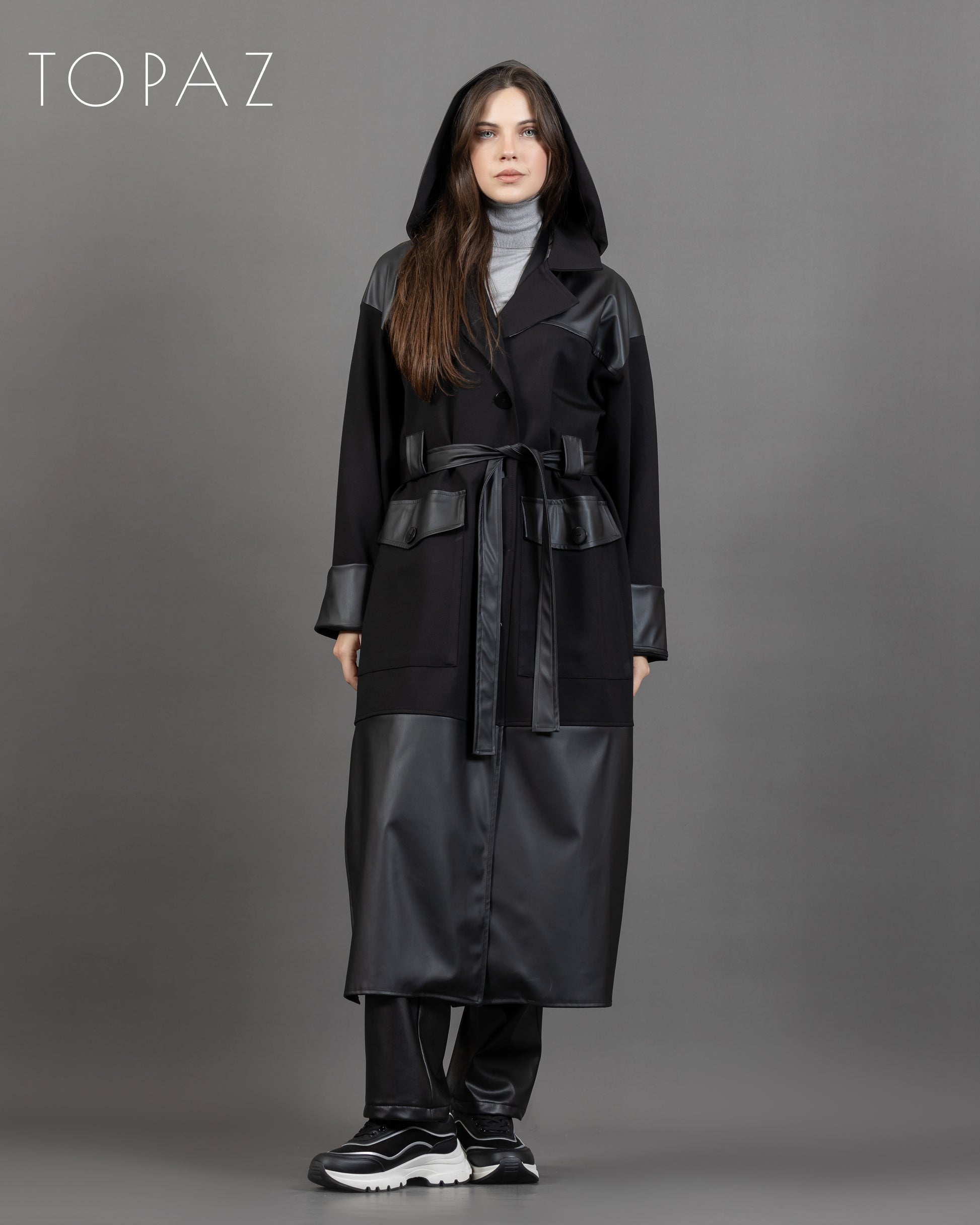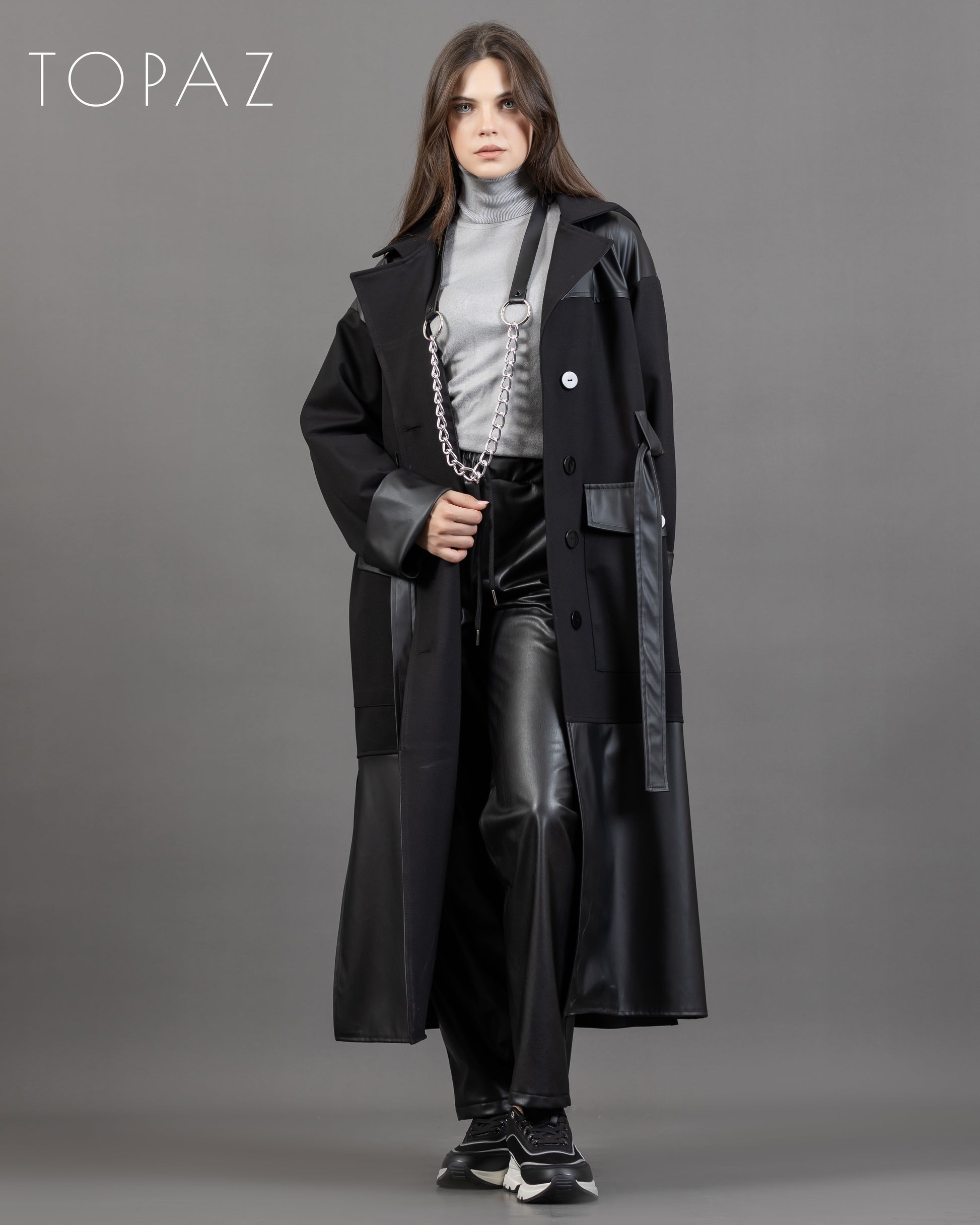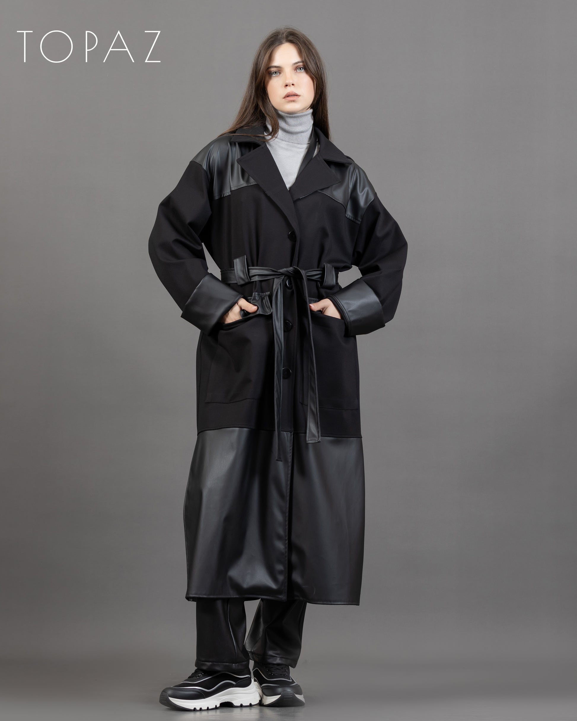 Coat featuring an imported soft wool fabric and leather panel detailing.