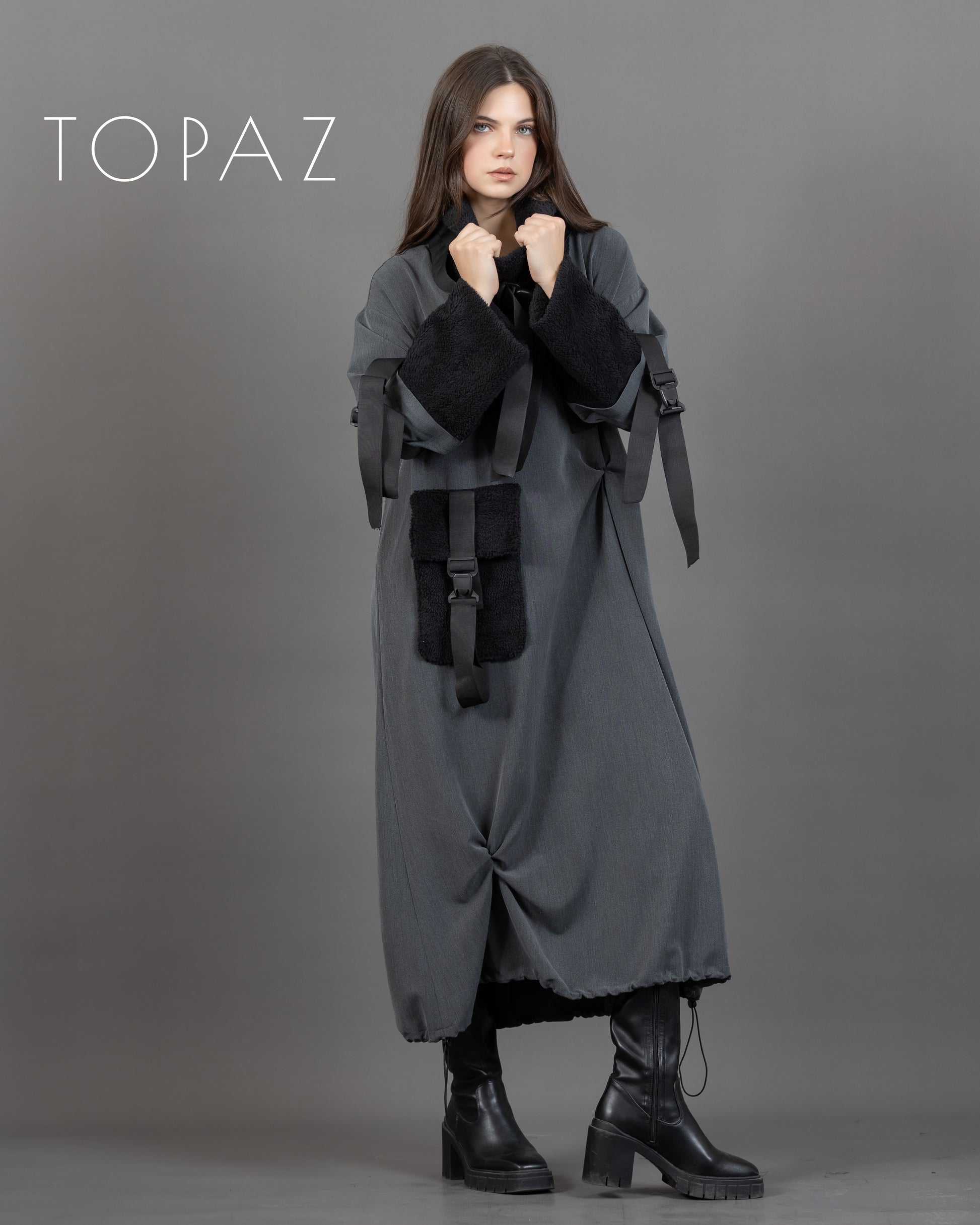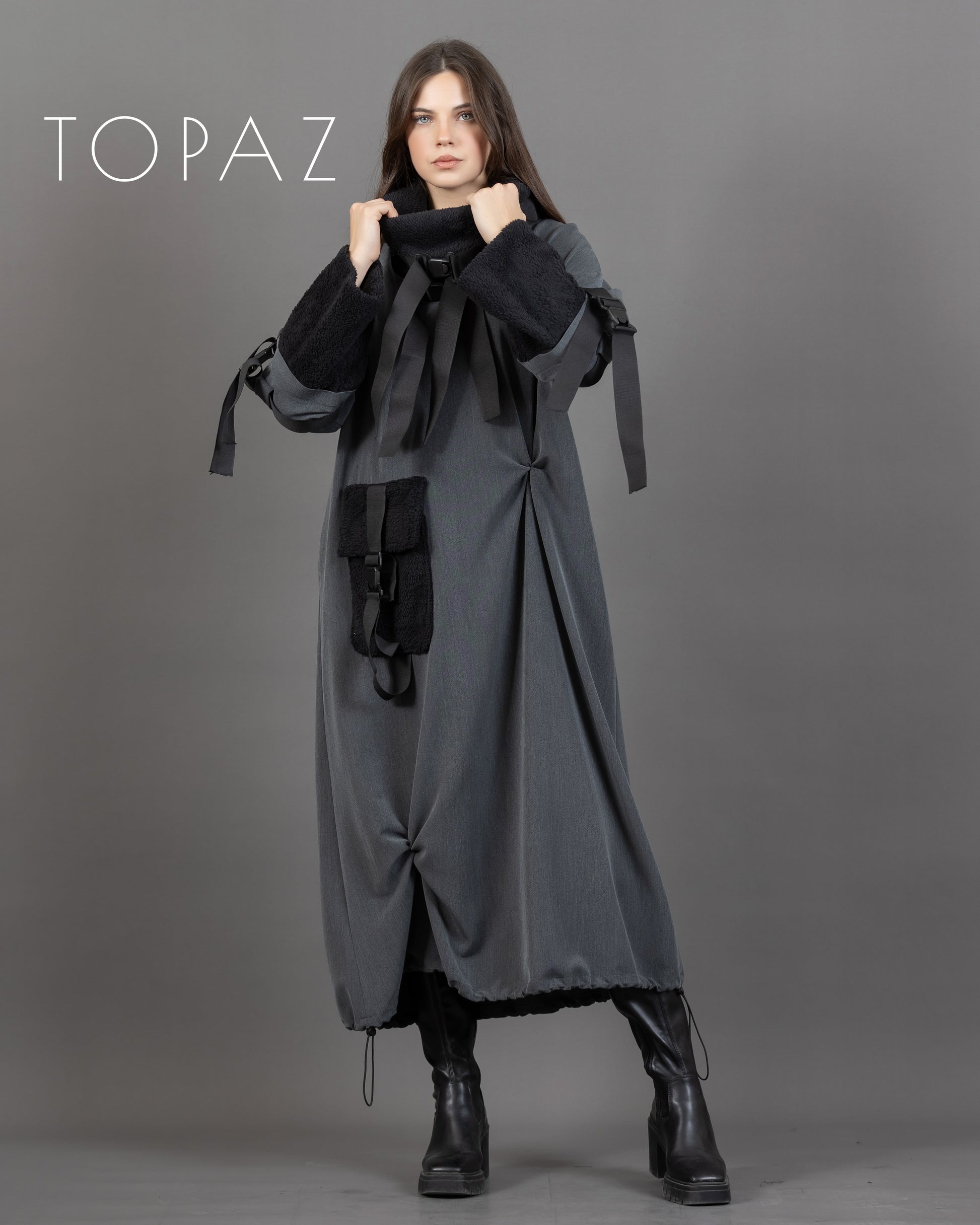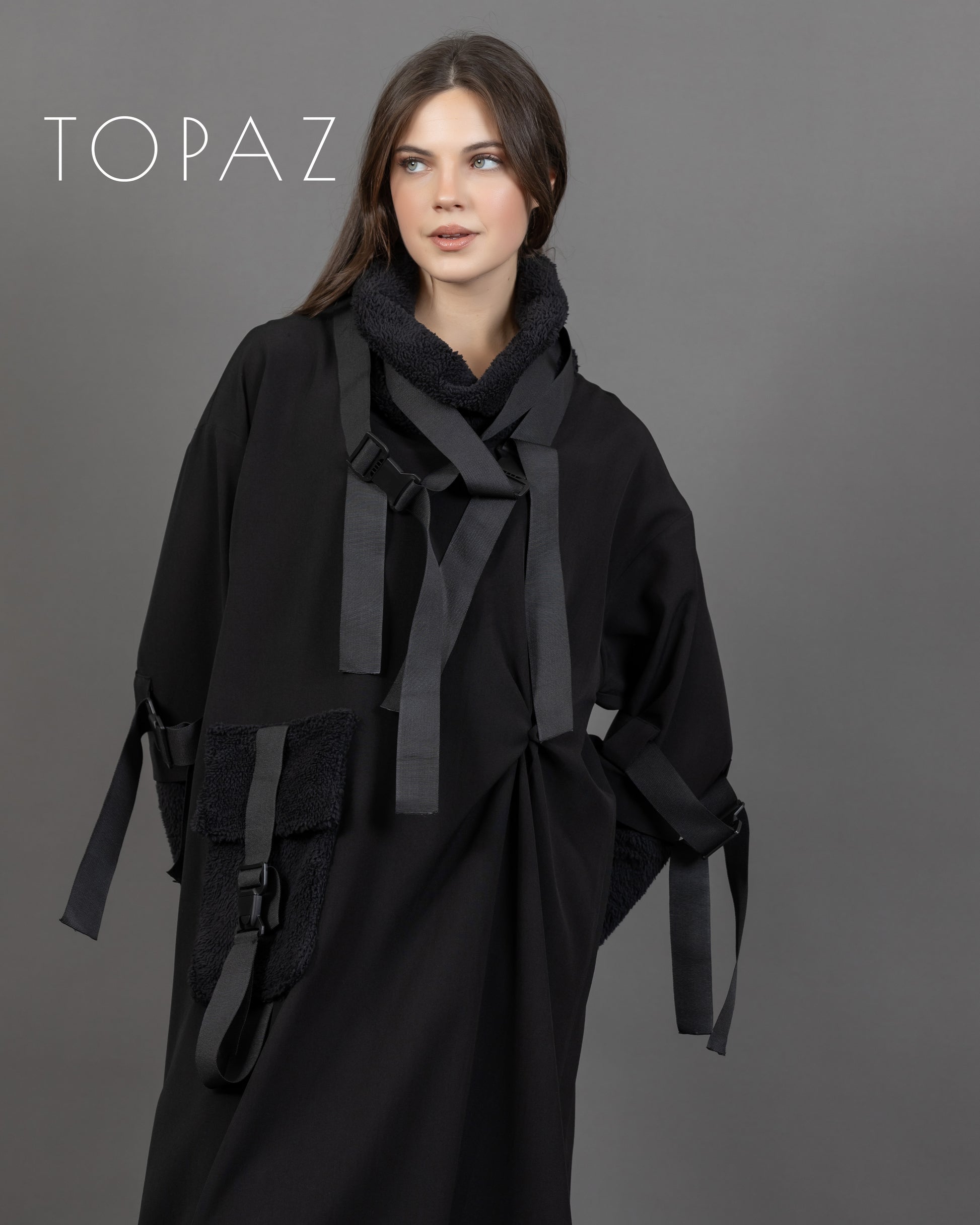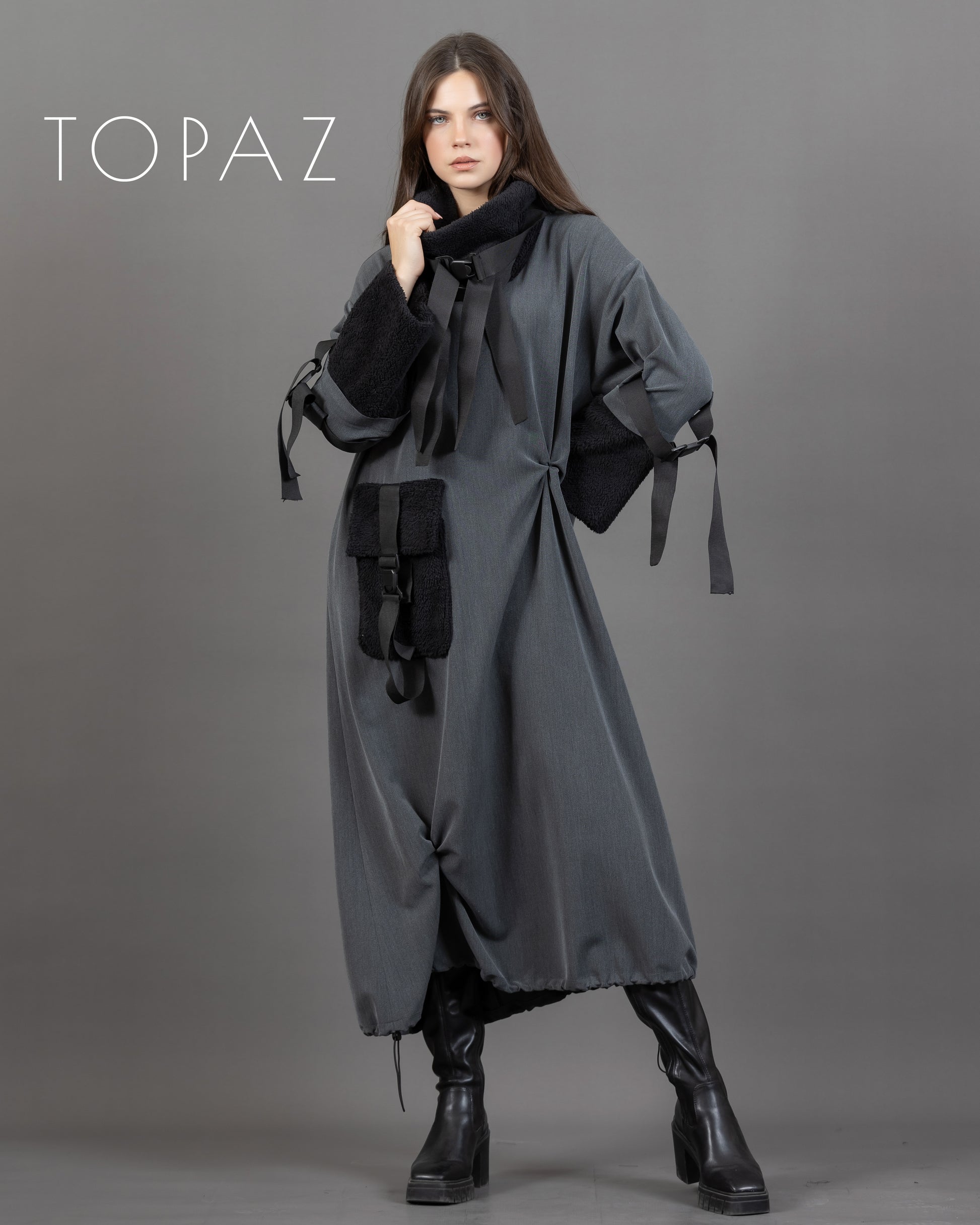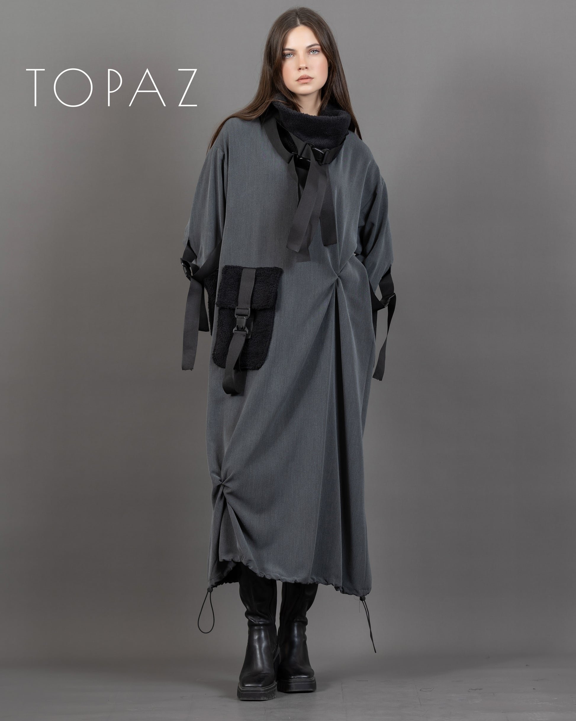 Dress featuring an imported Lycra winter fabric and buckle detailing.