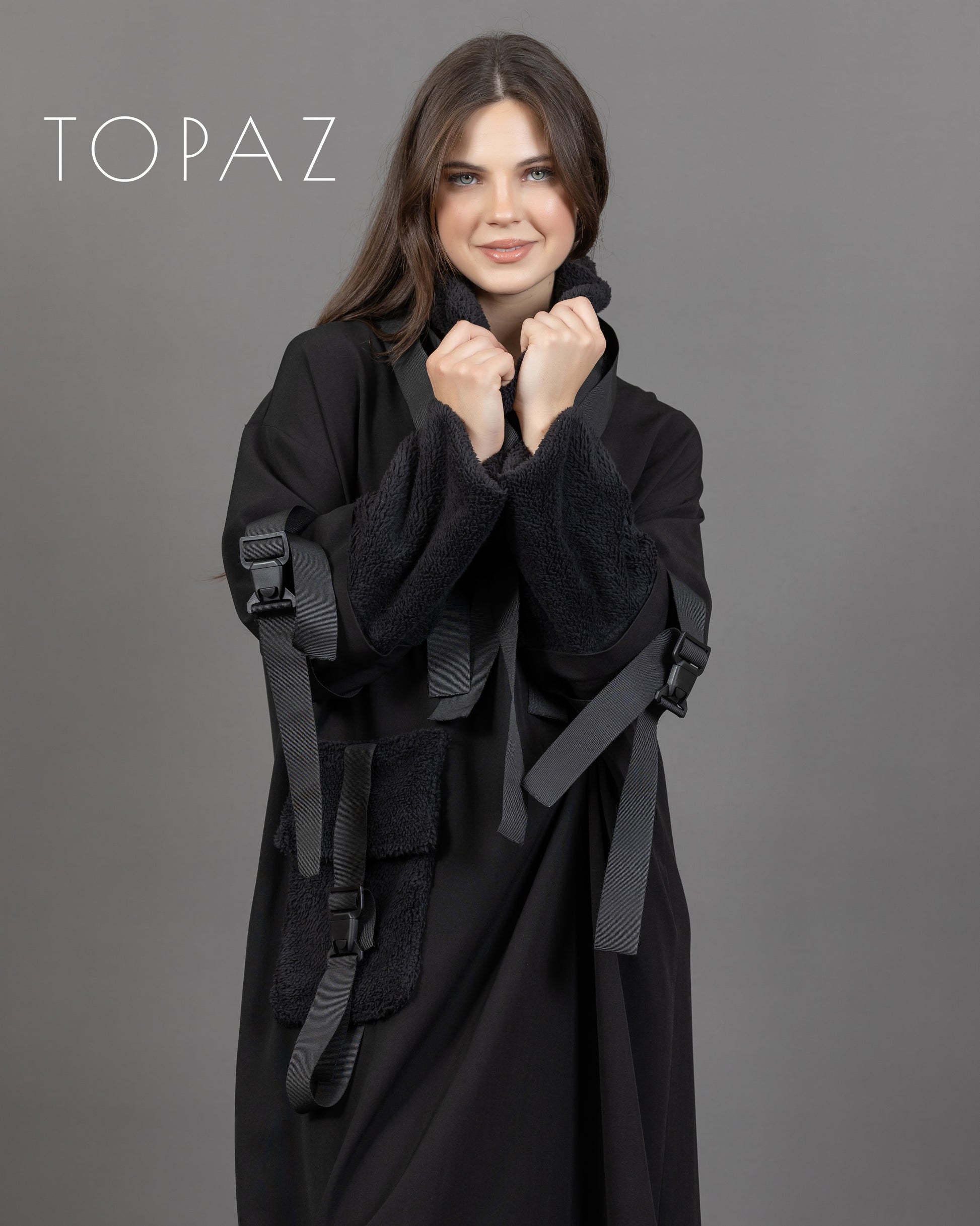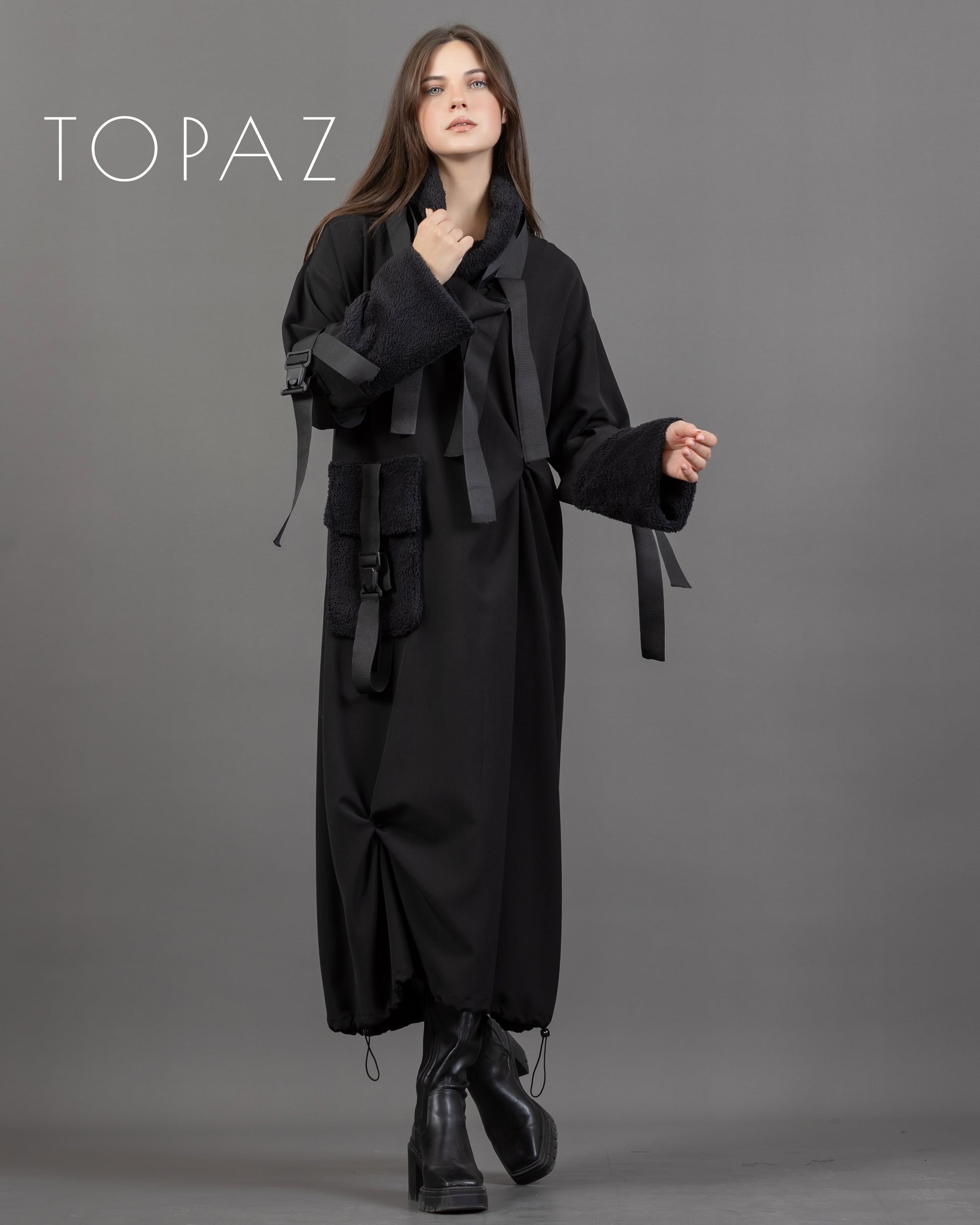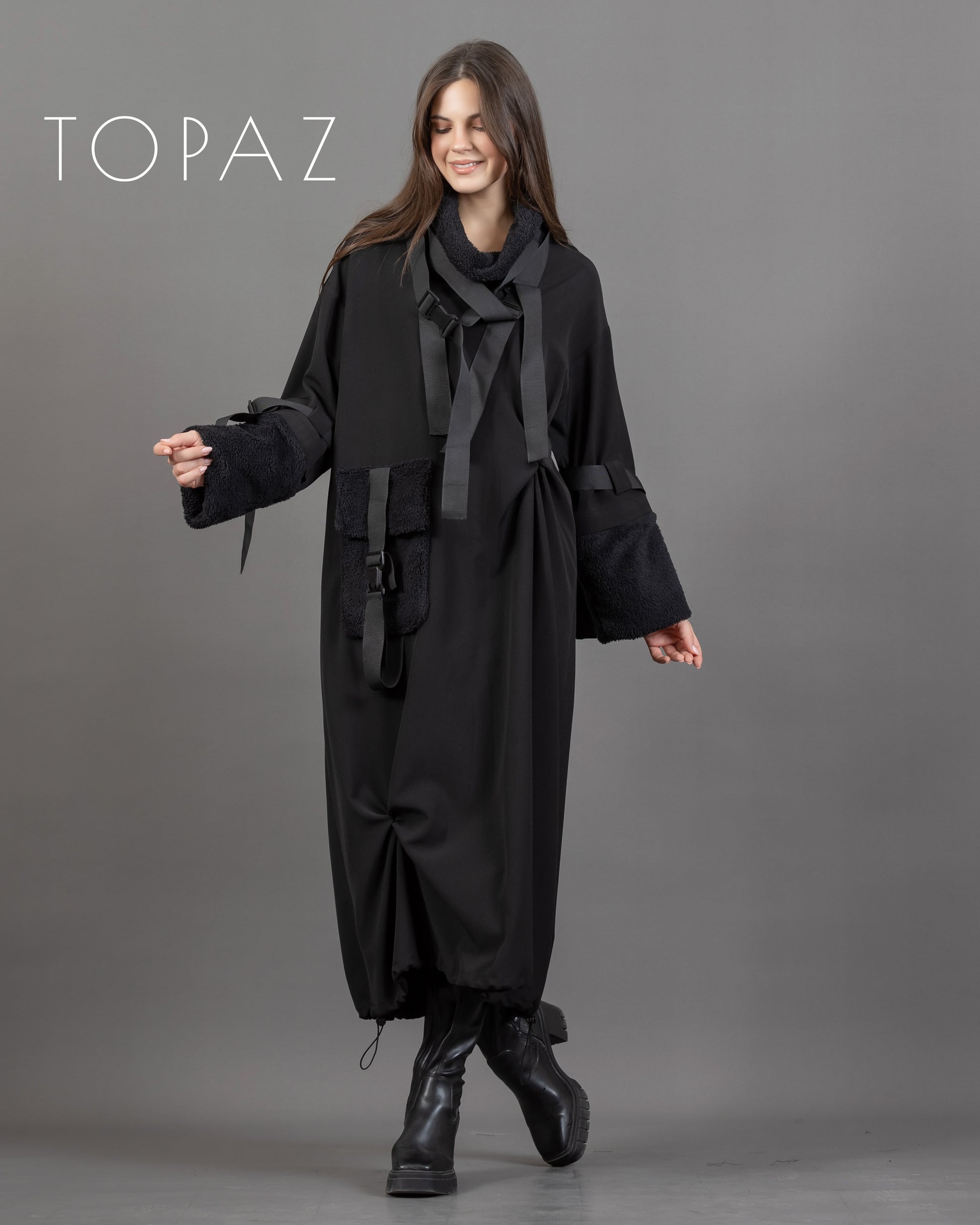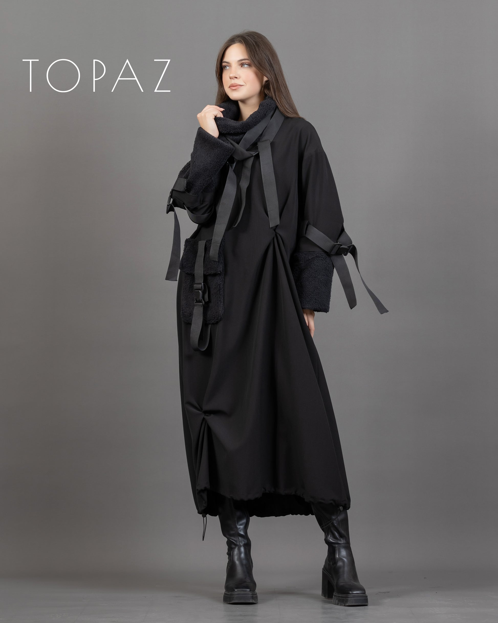 Dress featuring an imported Lycra winter fabric and buckle detailing.