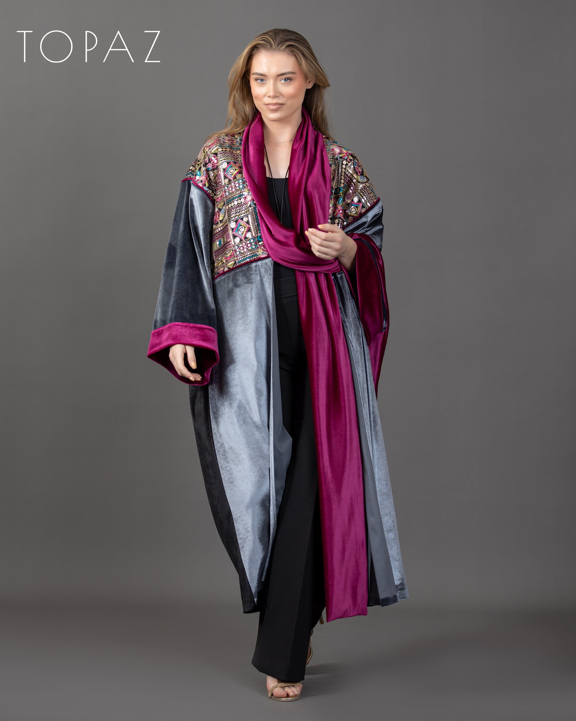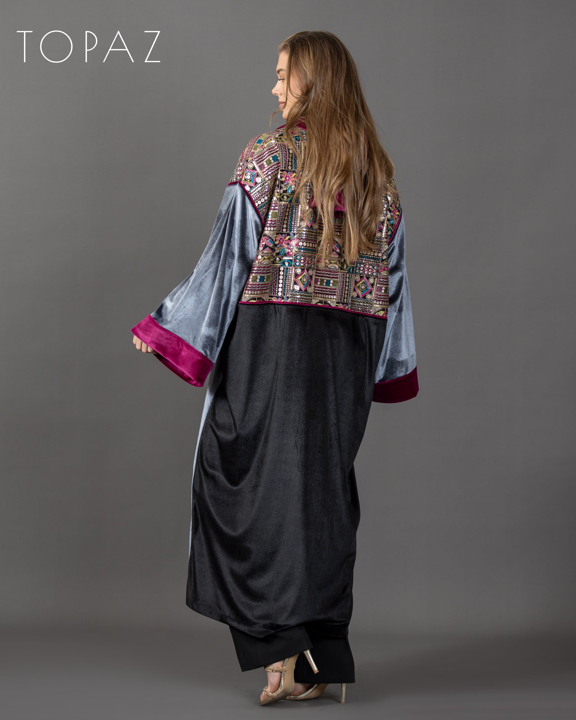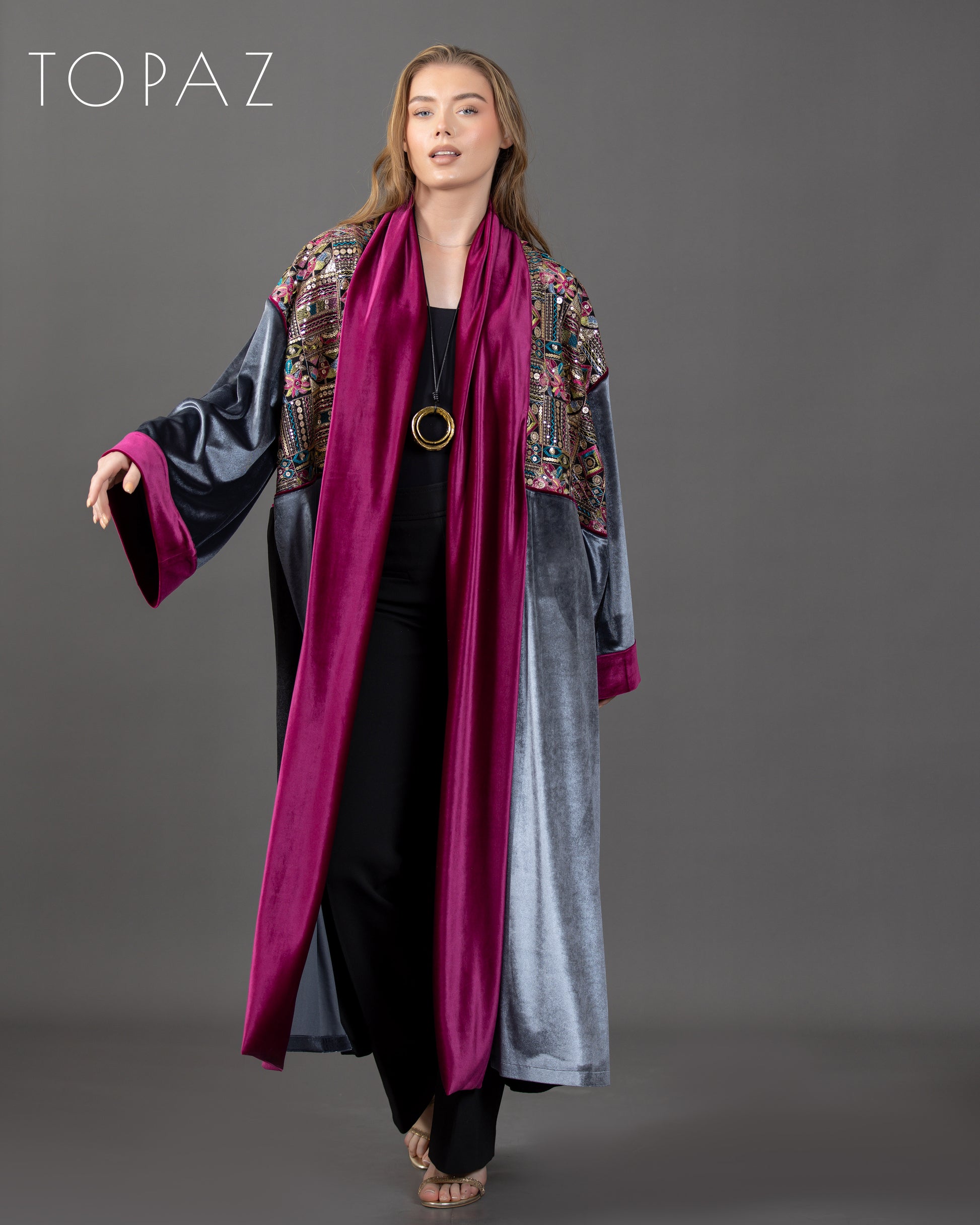 Kaftan featuring an imported embroidered fabric, pink lining, and gold accessories.