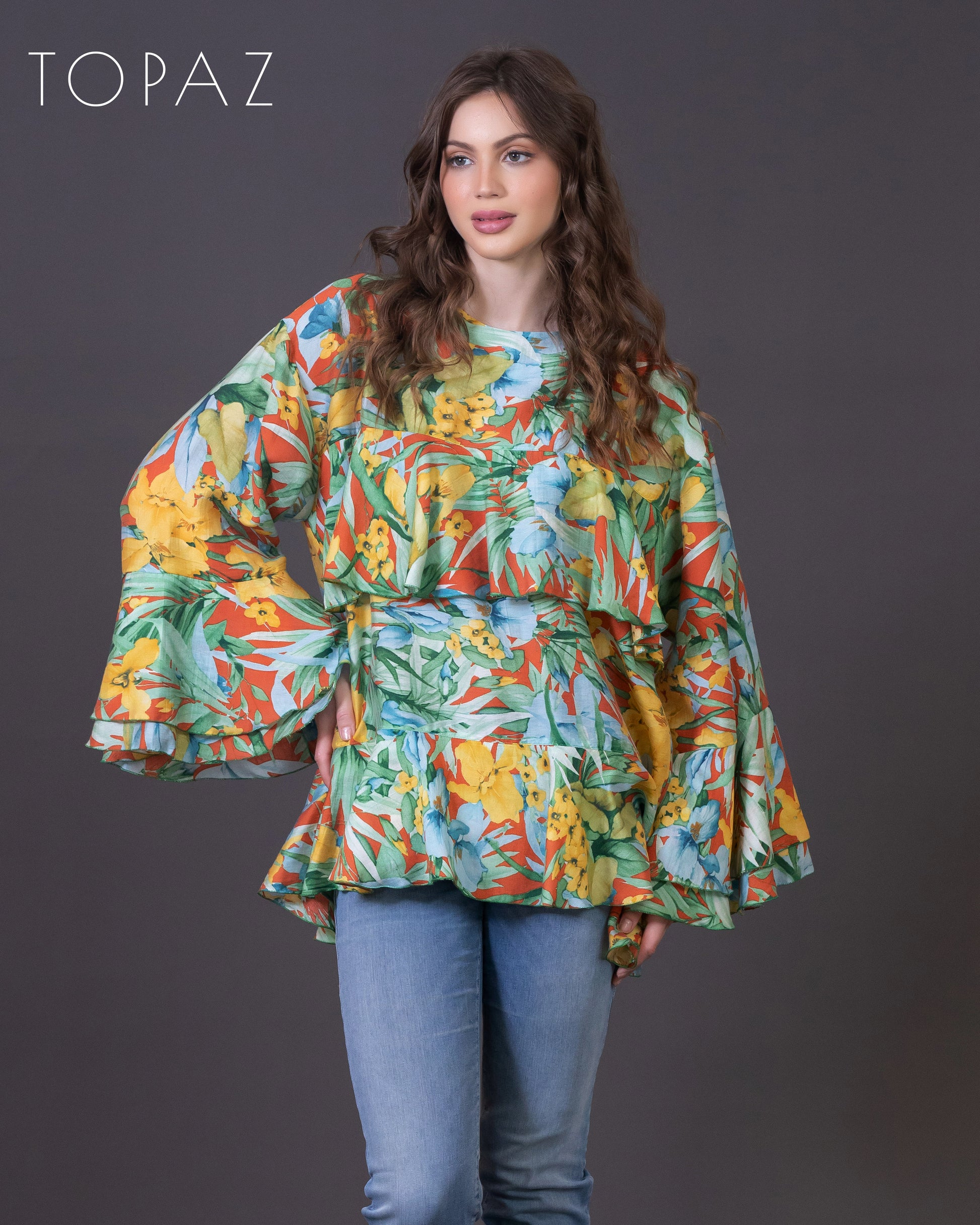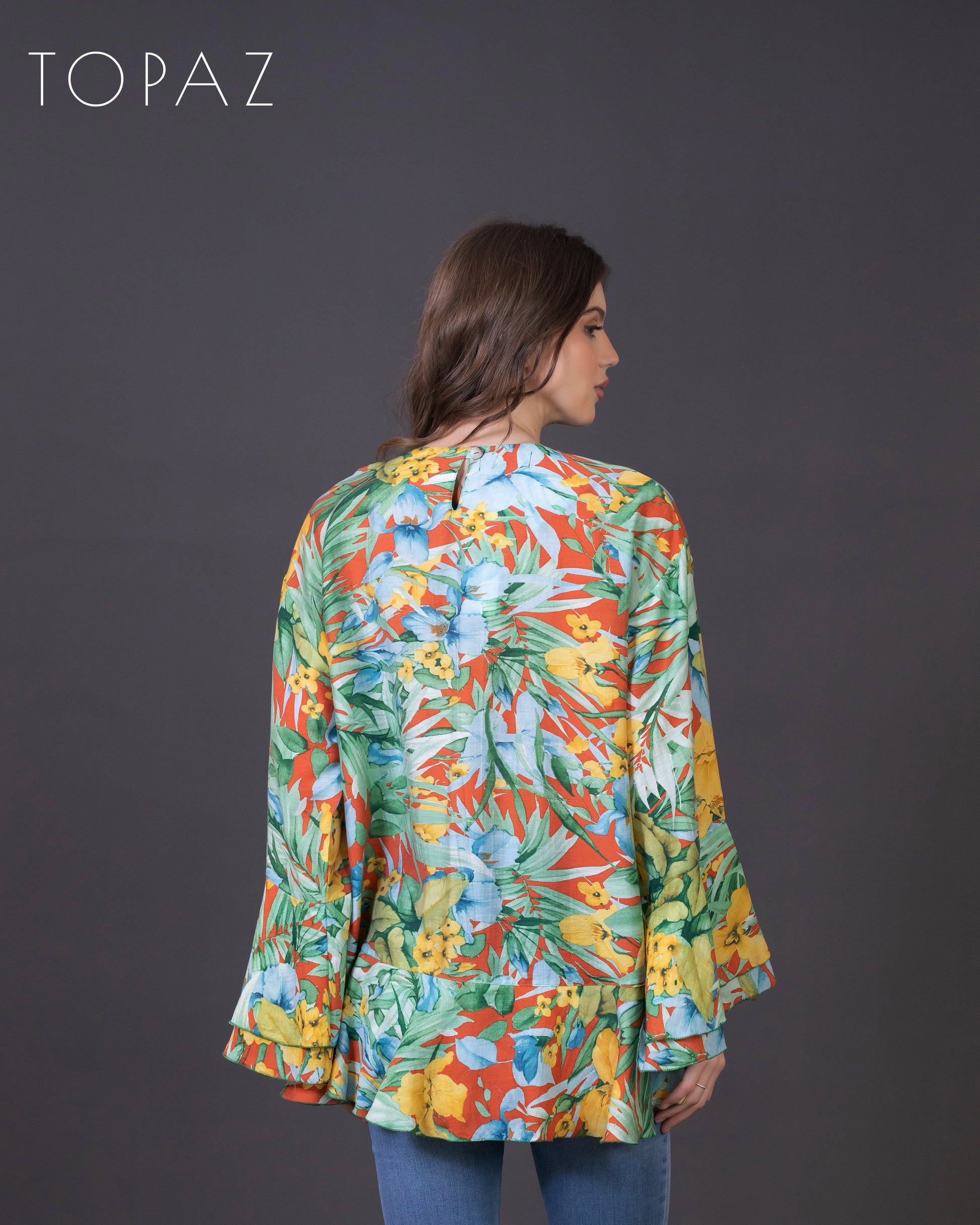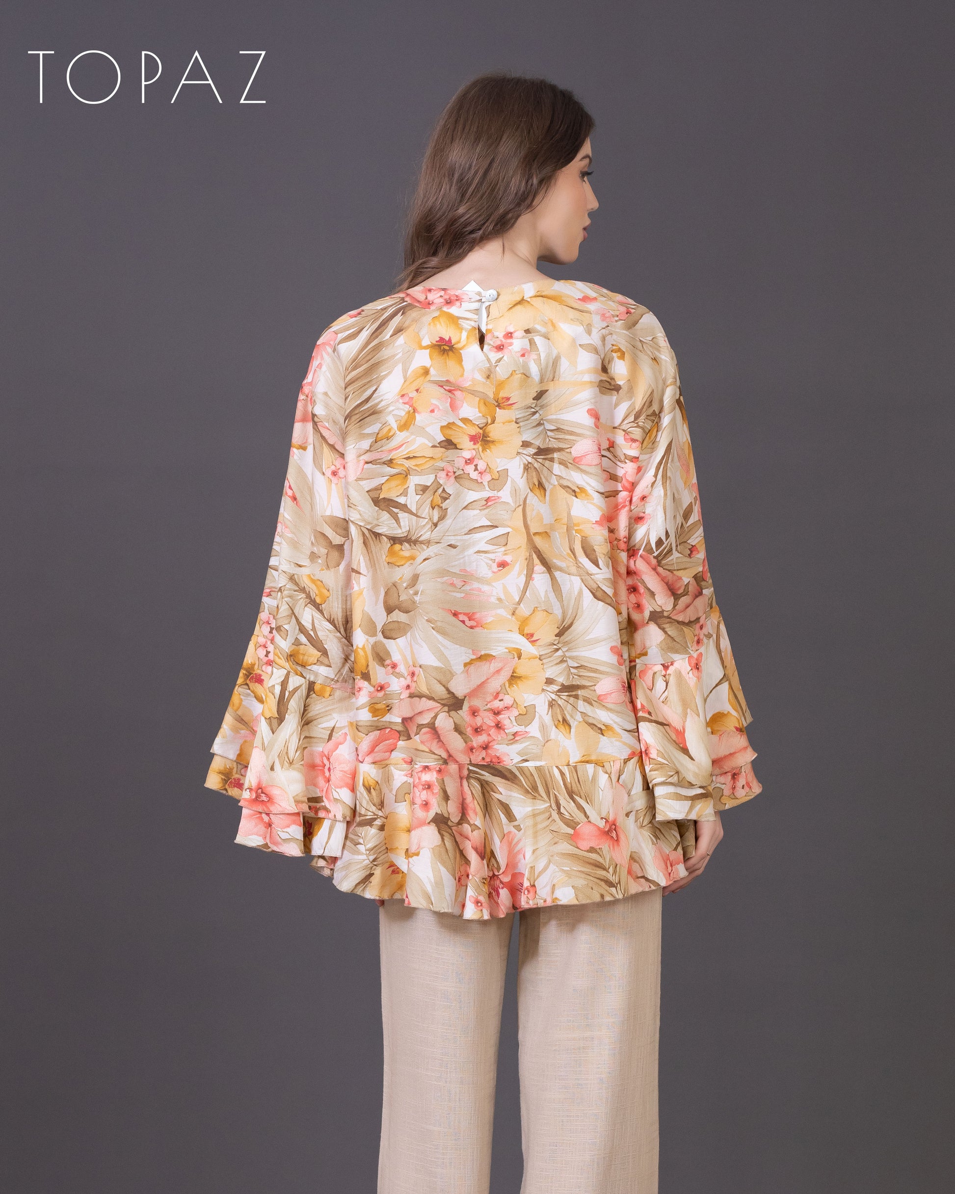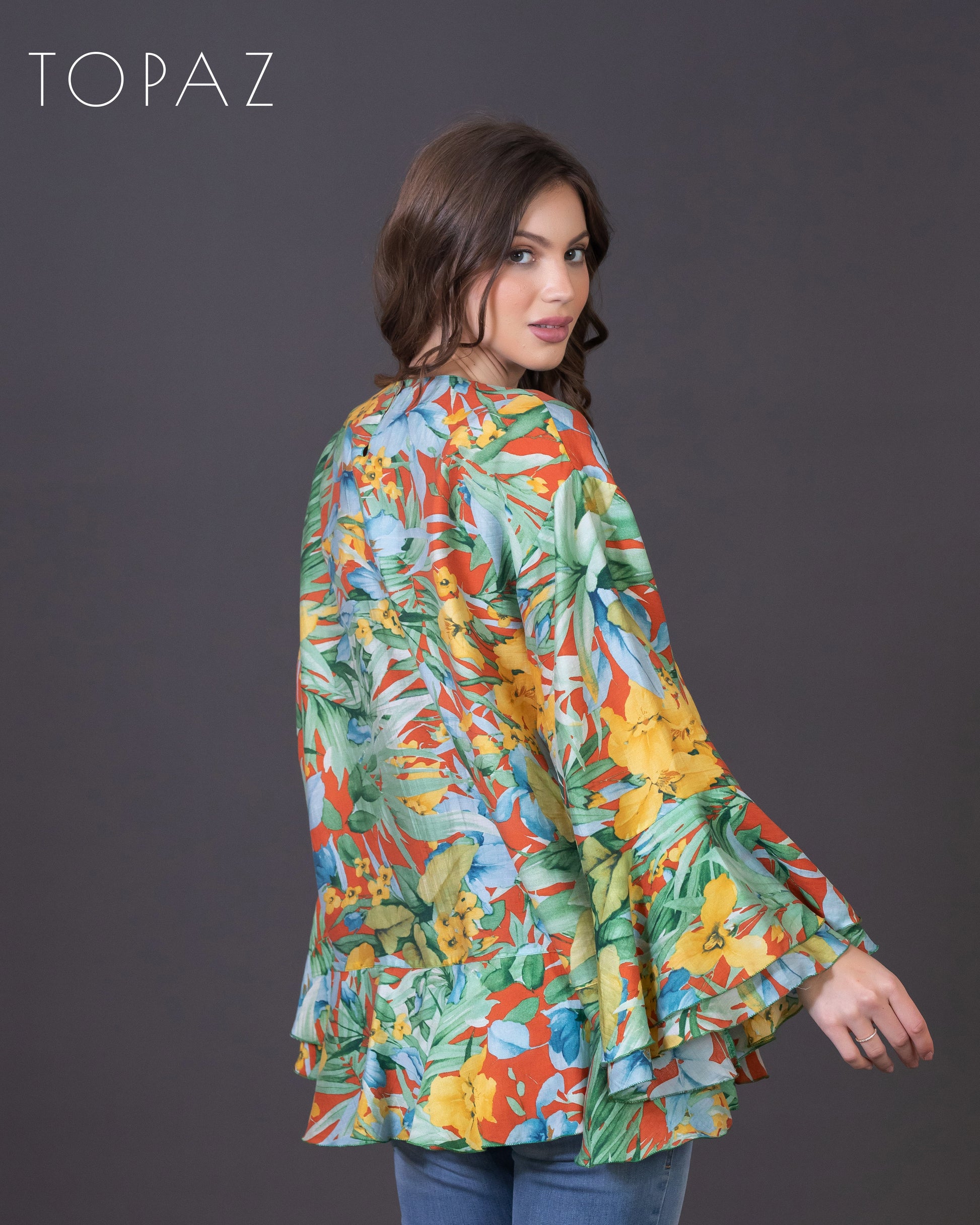Top featuring an imported floral fabric and ruffle detailing.