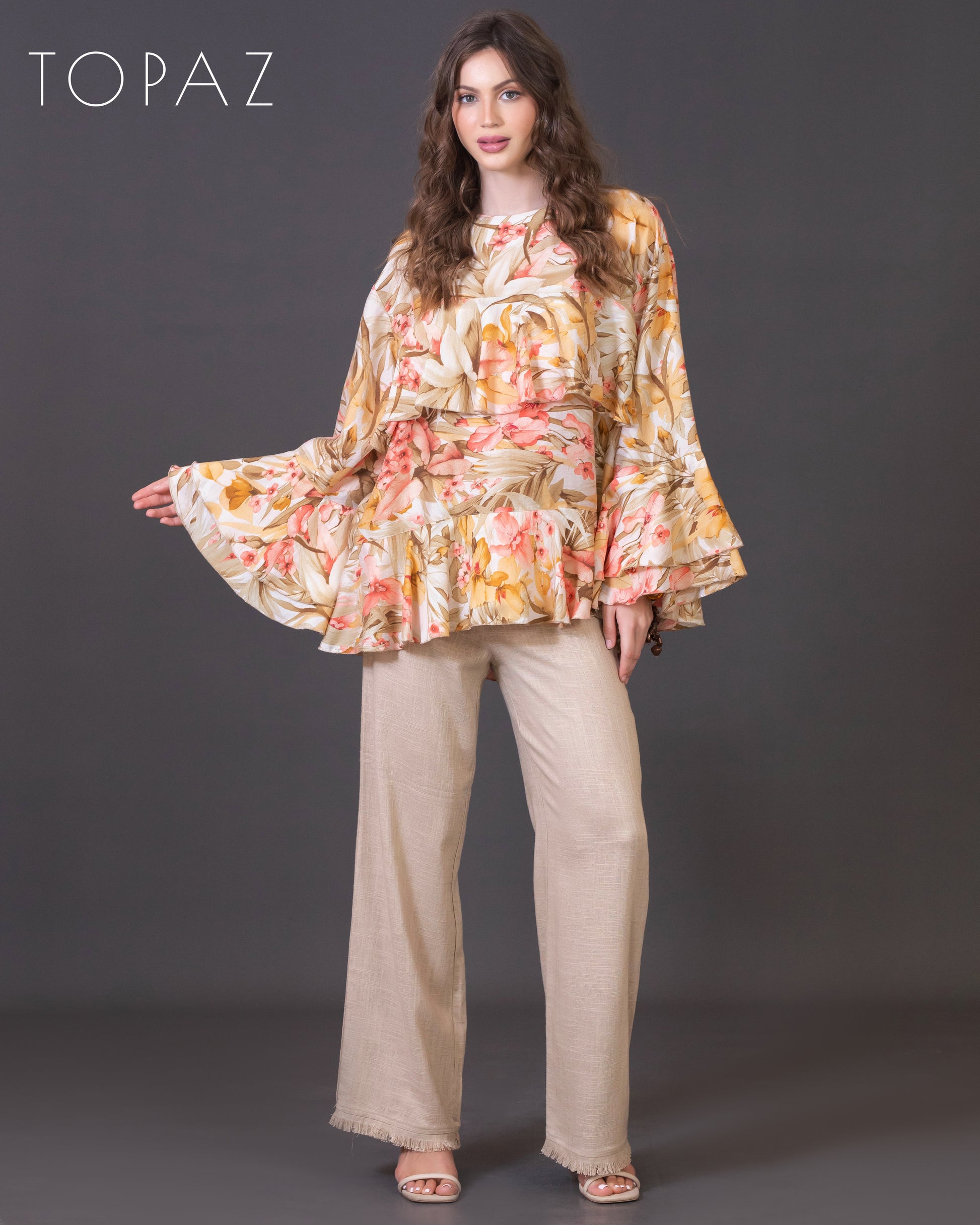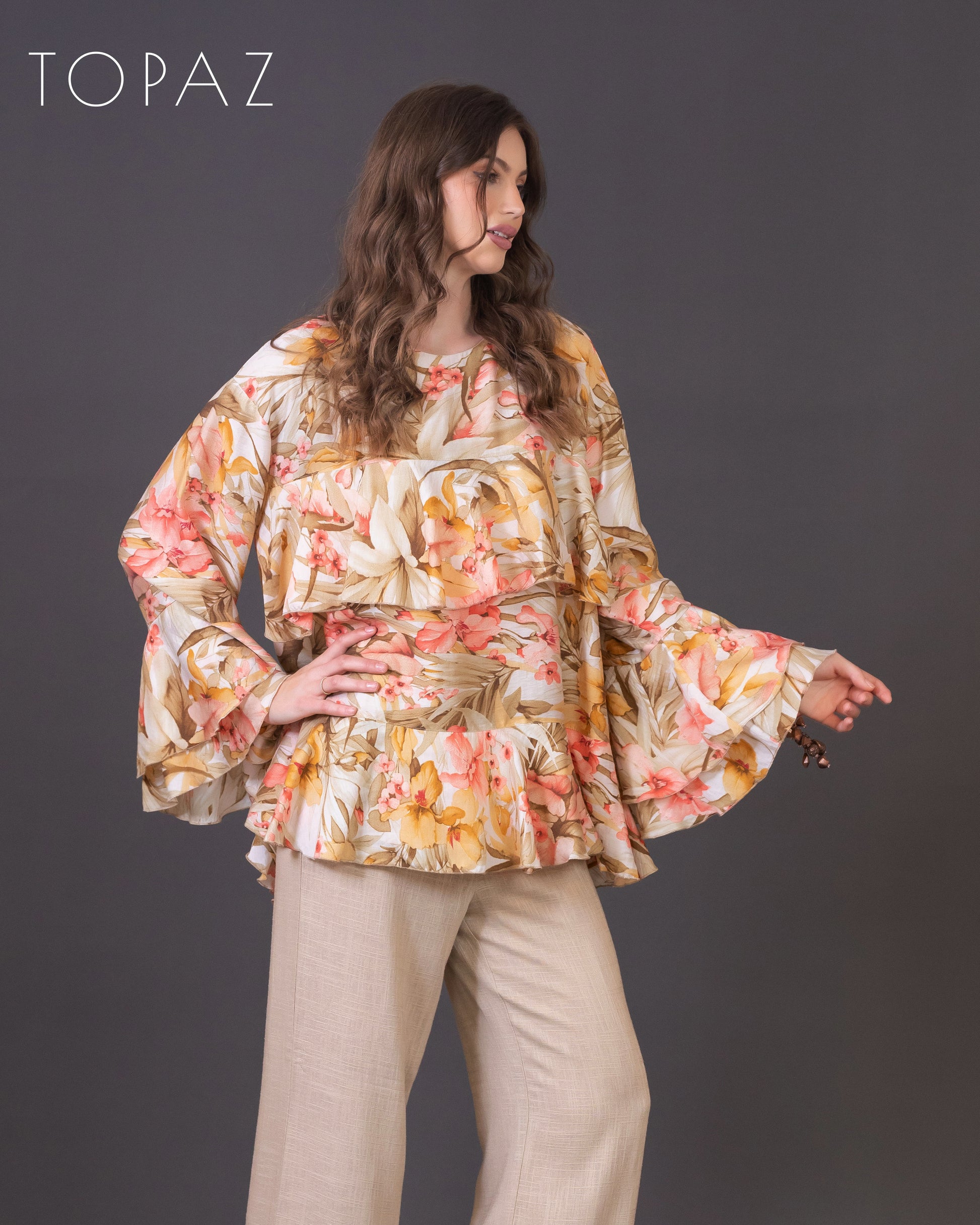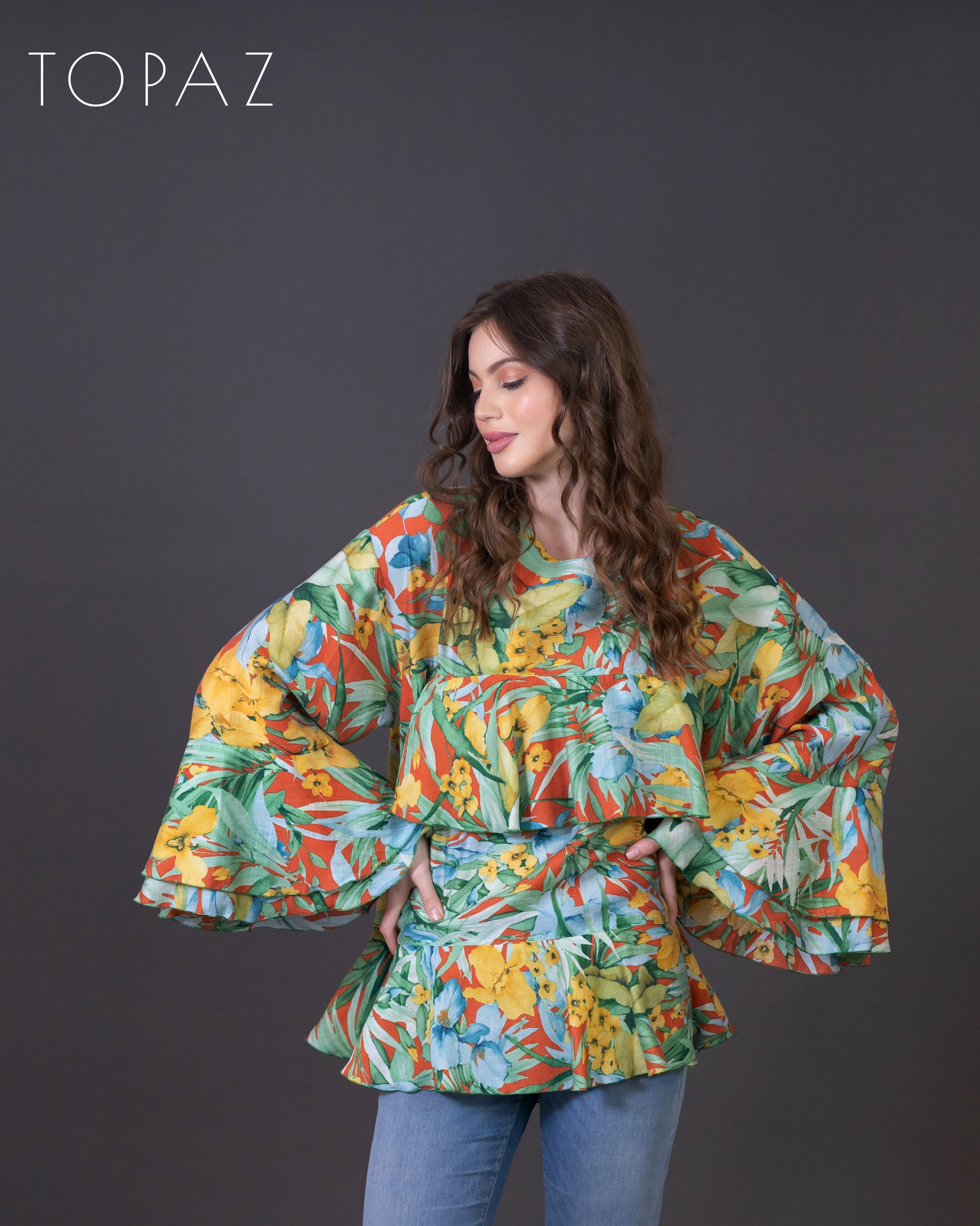 Top featuring an imported floral fabric and ruffle detailing.