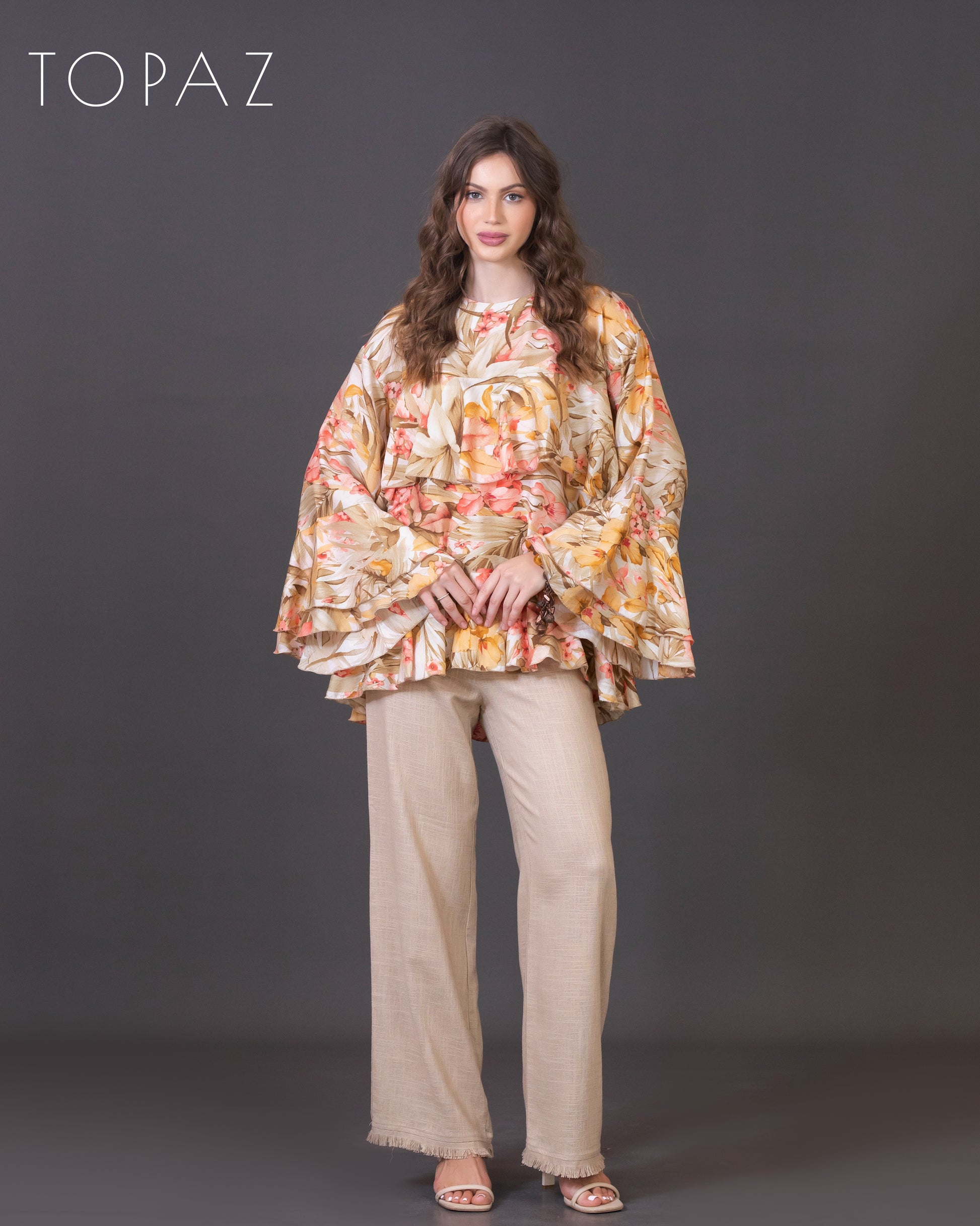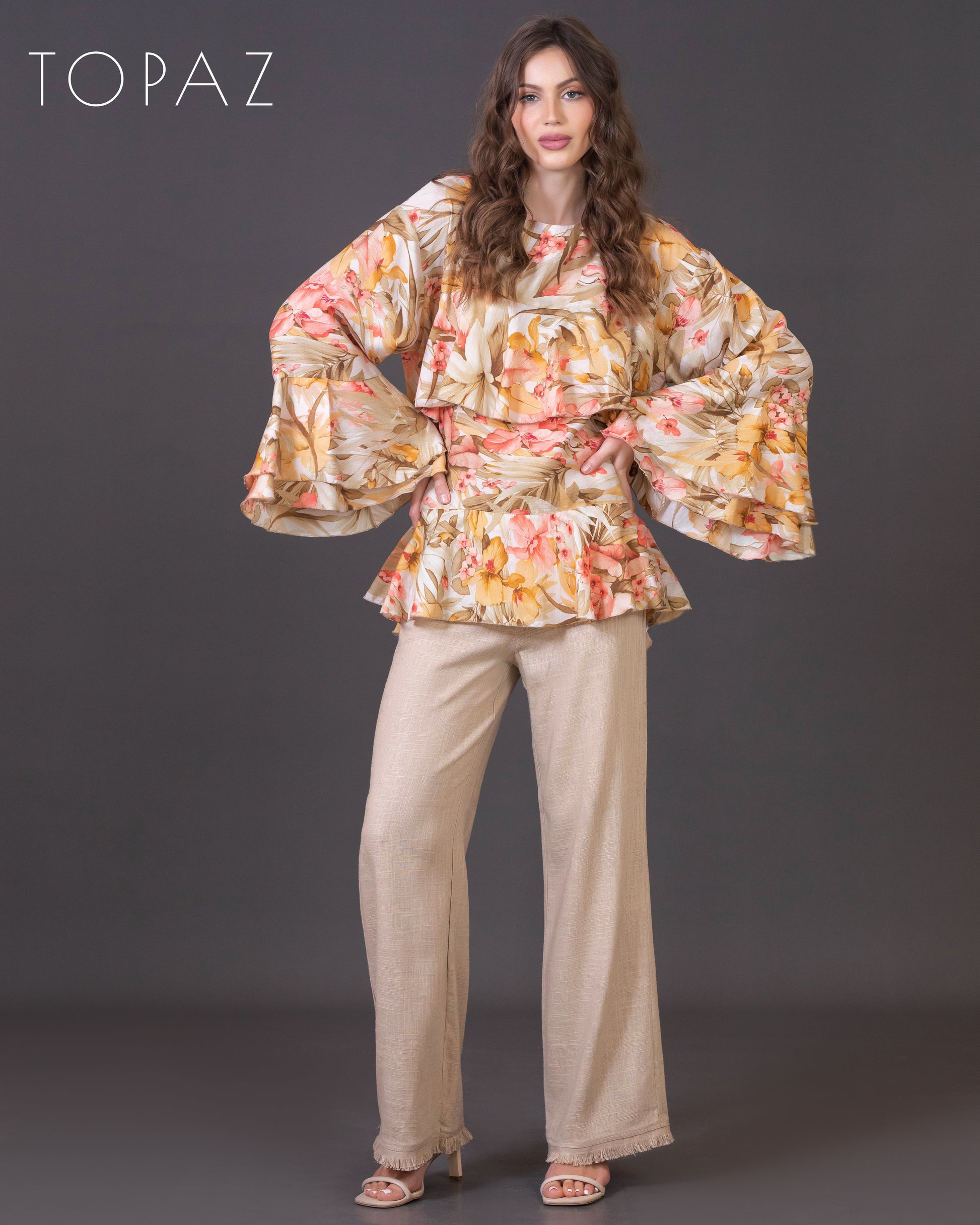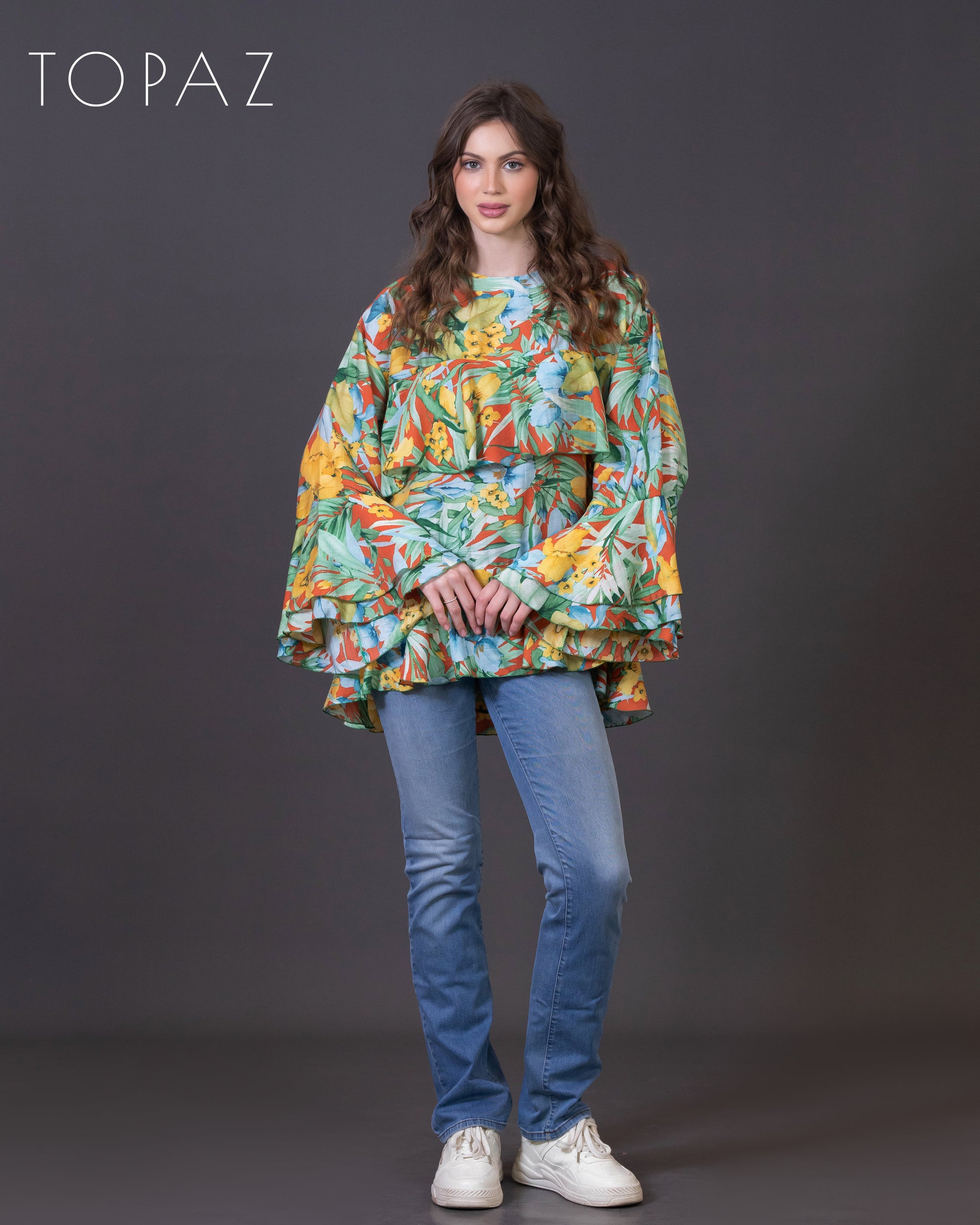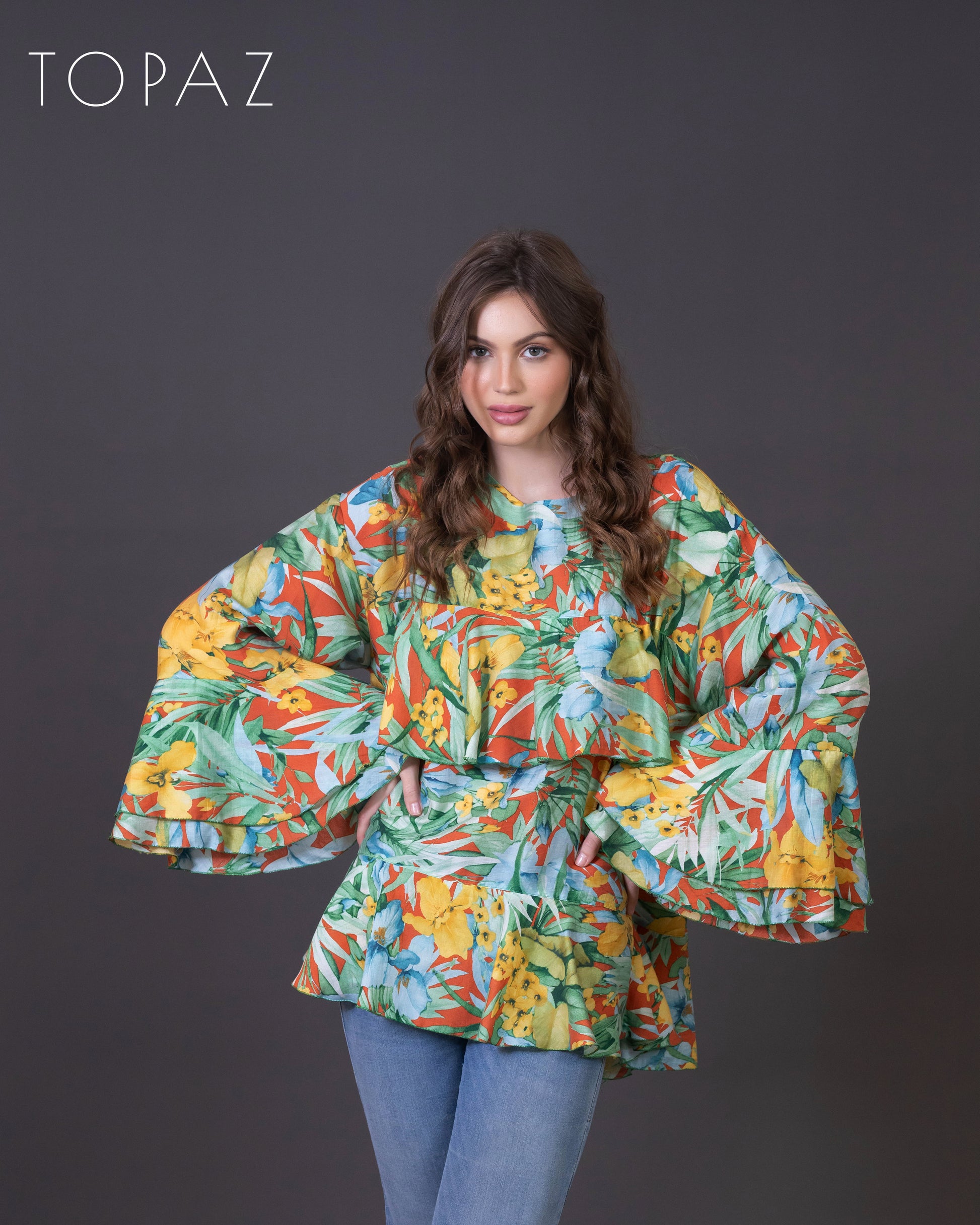 Top featuring an imported floral fabric and ruffle detailing.