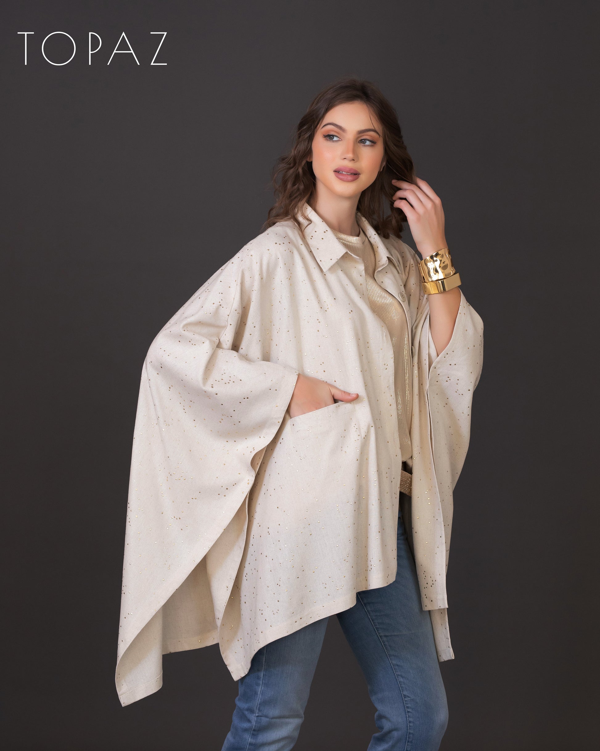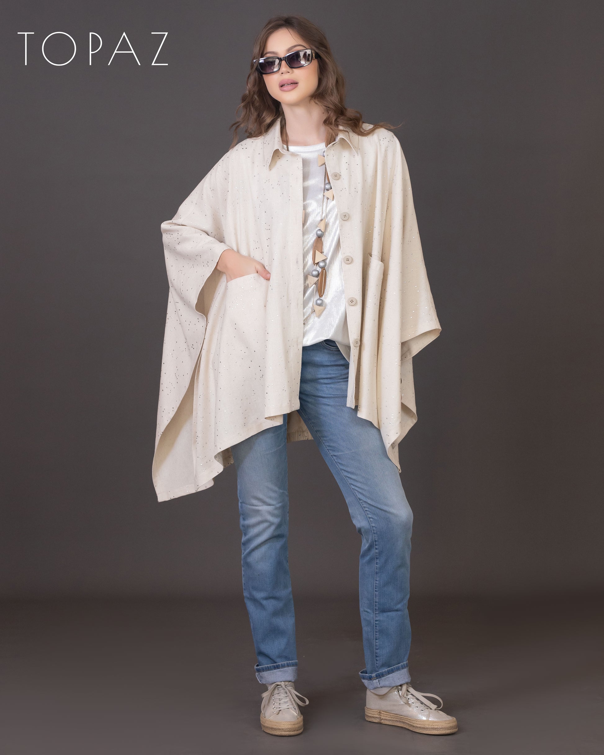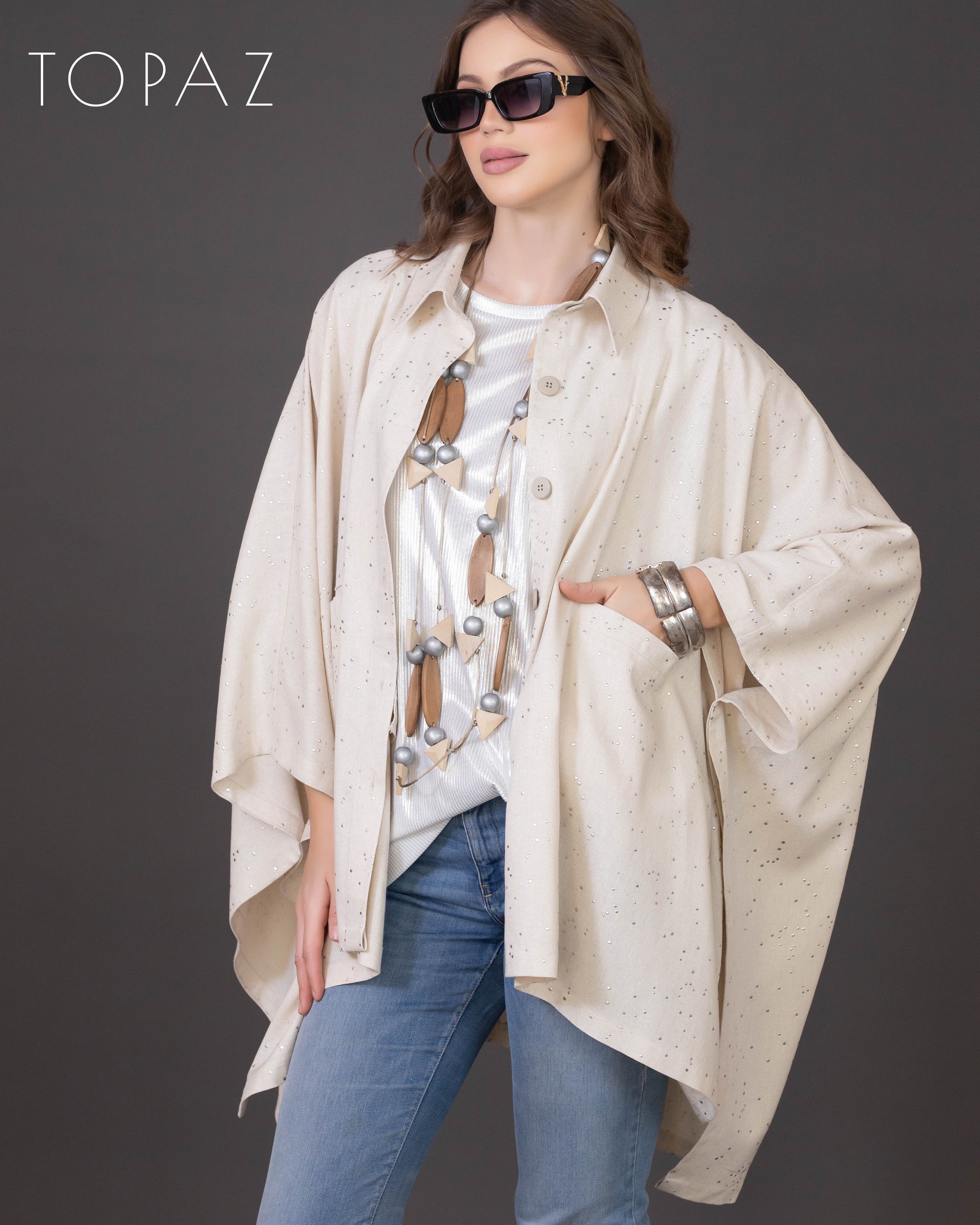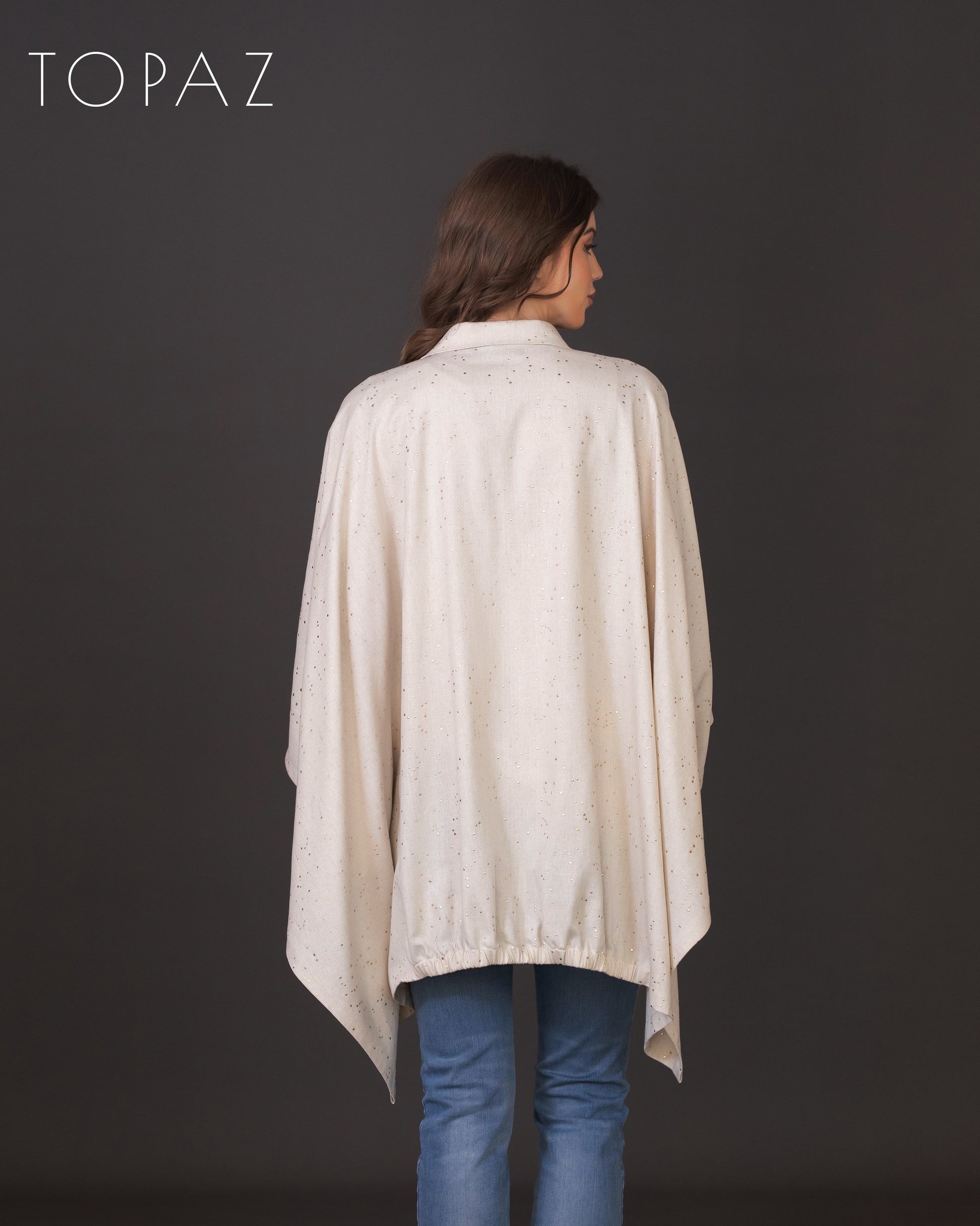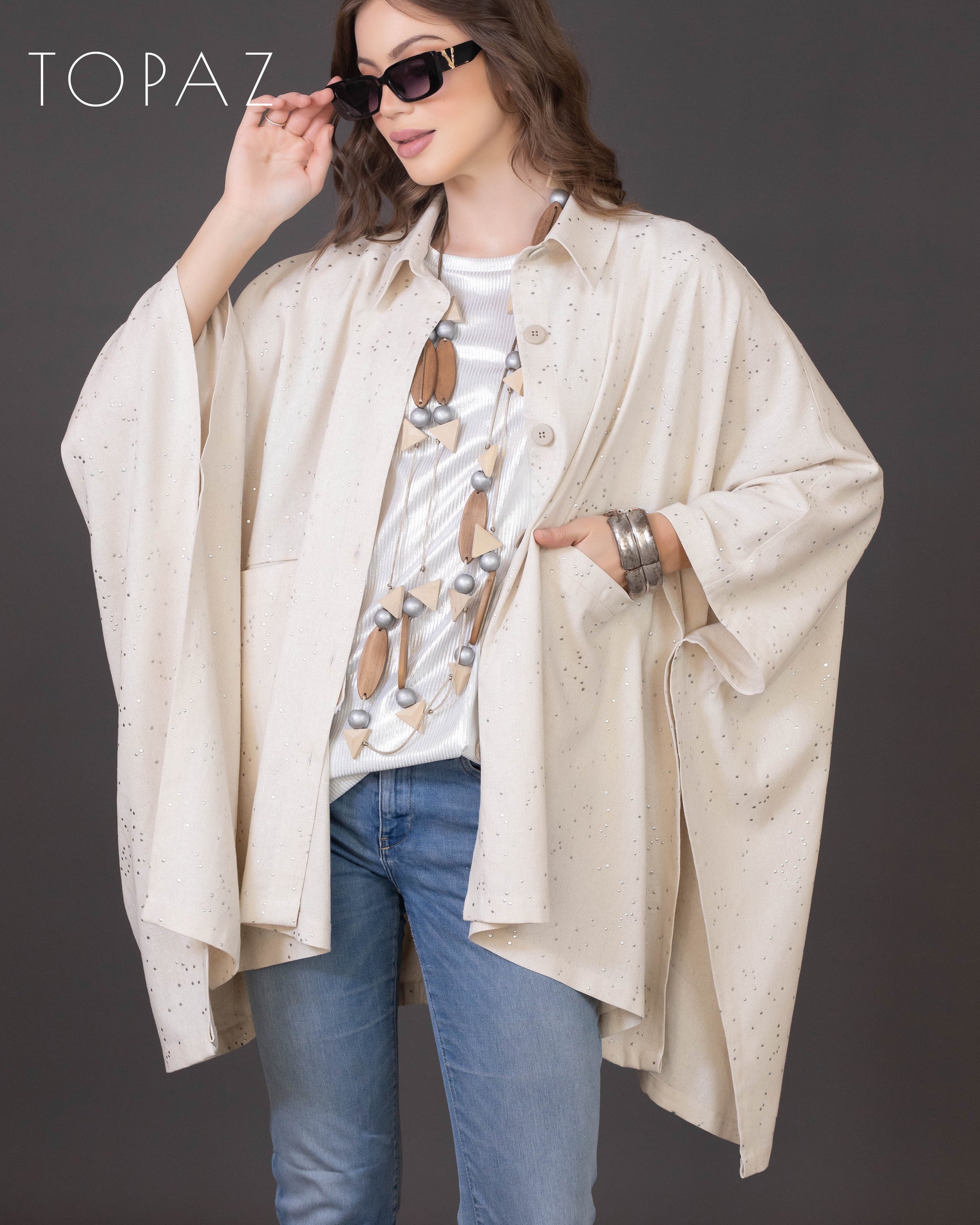 Poncho featuring an imported soft linen fabric with metallic polka dot detailing.