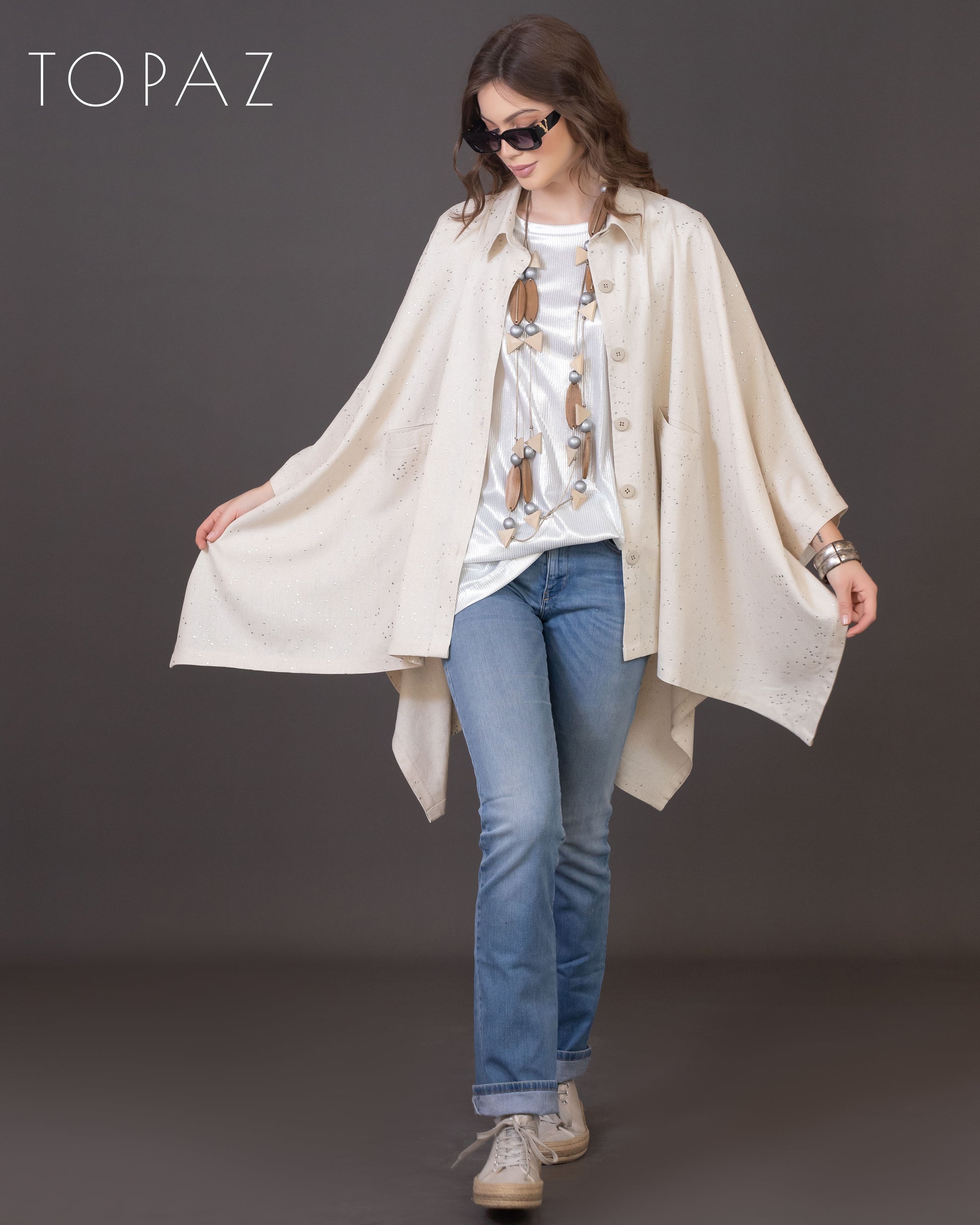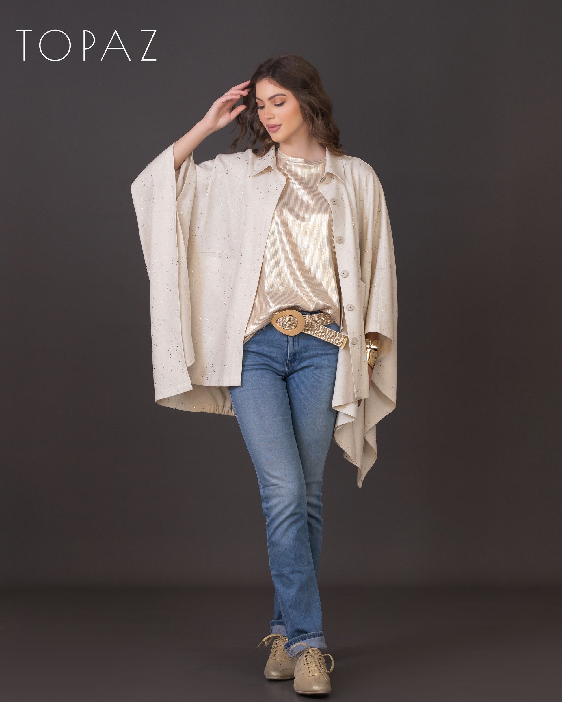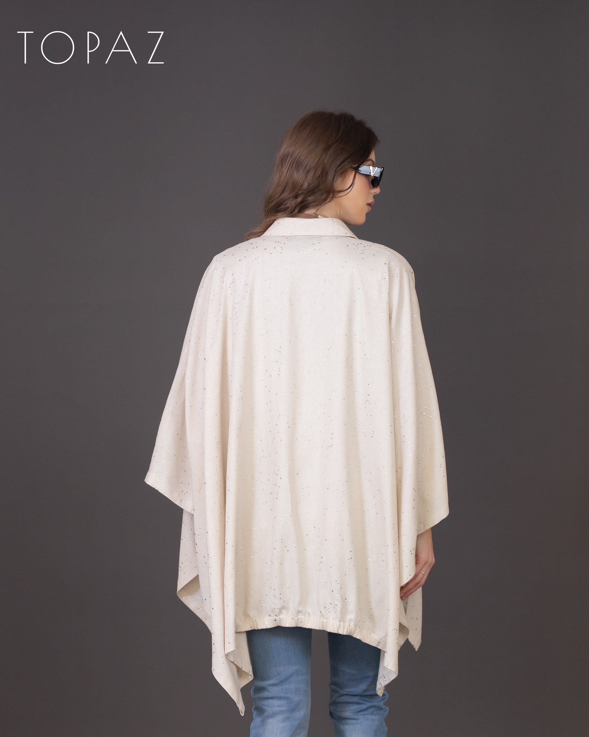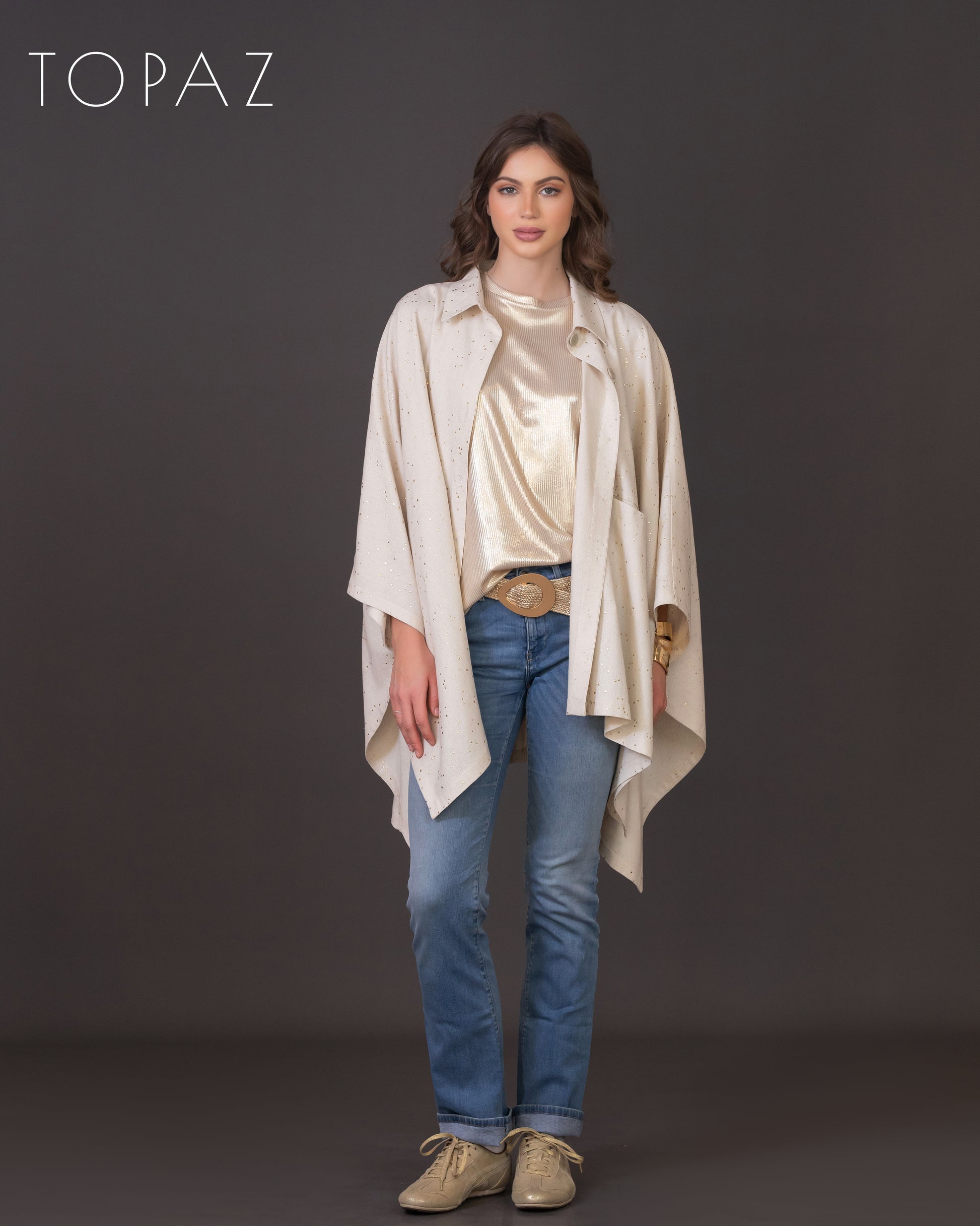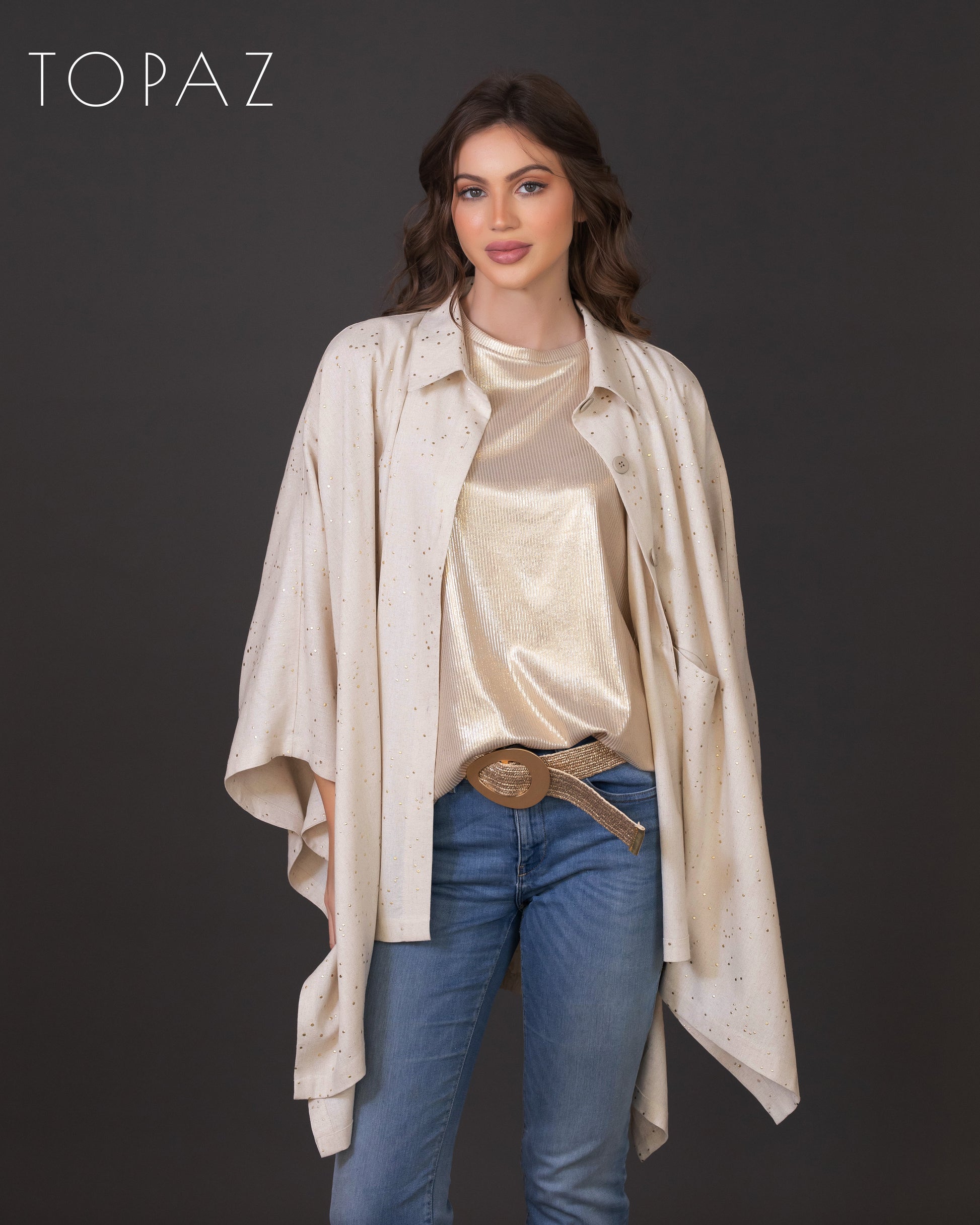 Poncho featuring an imported soft linen fabric with metallic polka dot detailing.