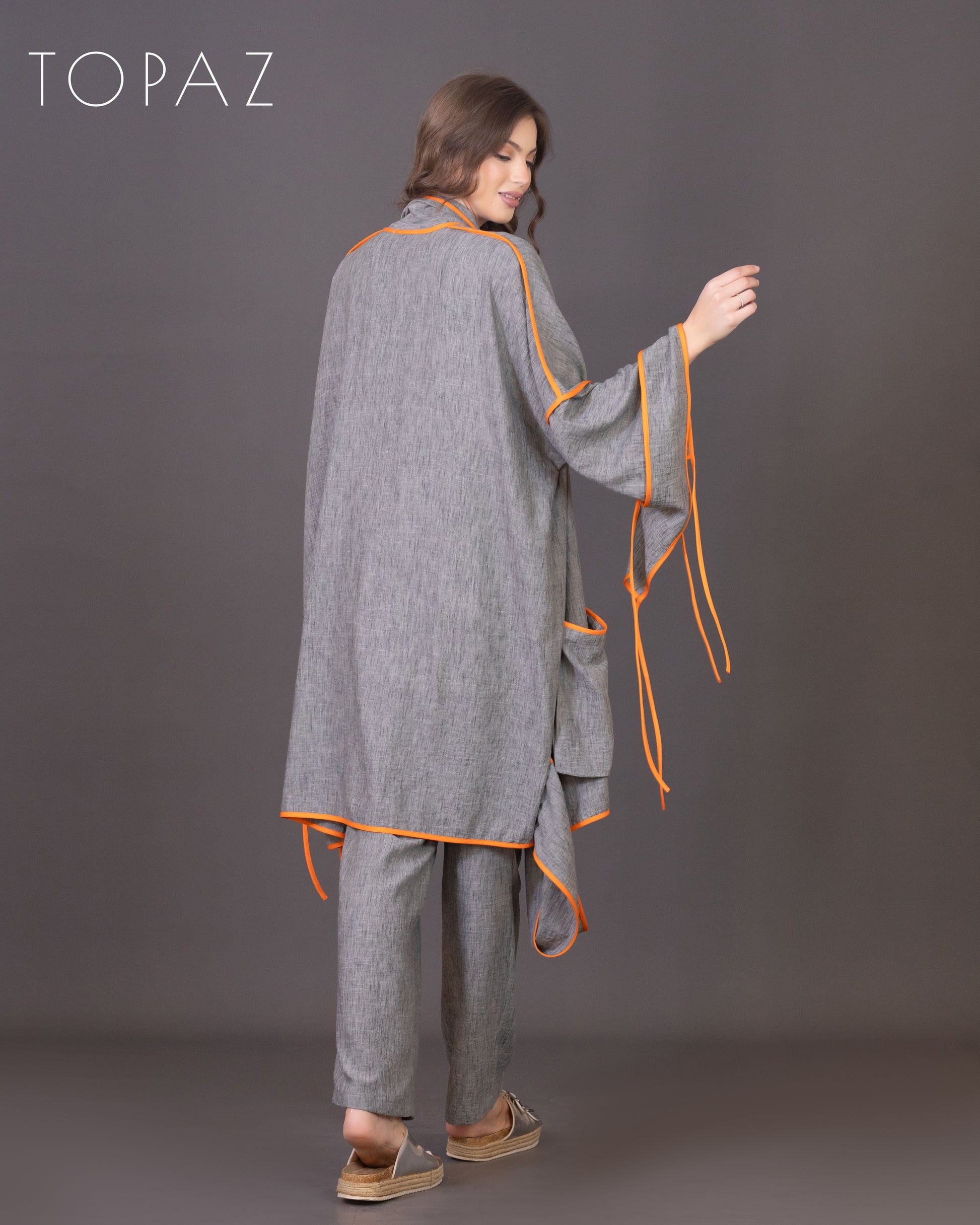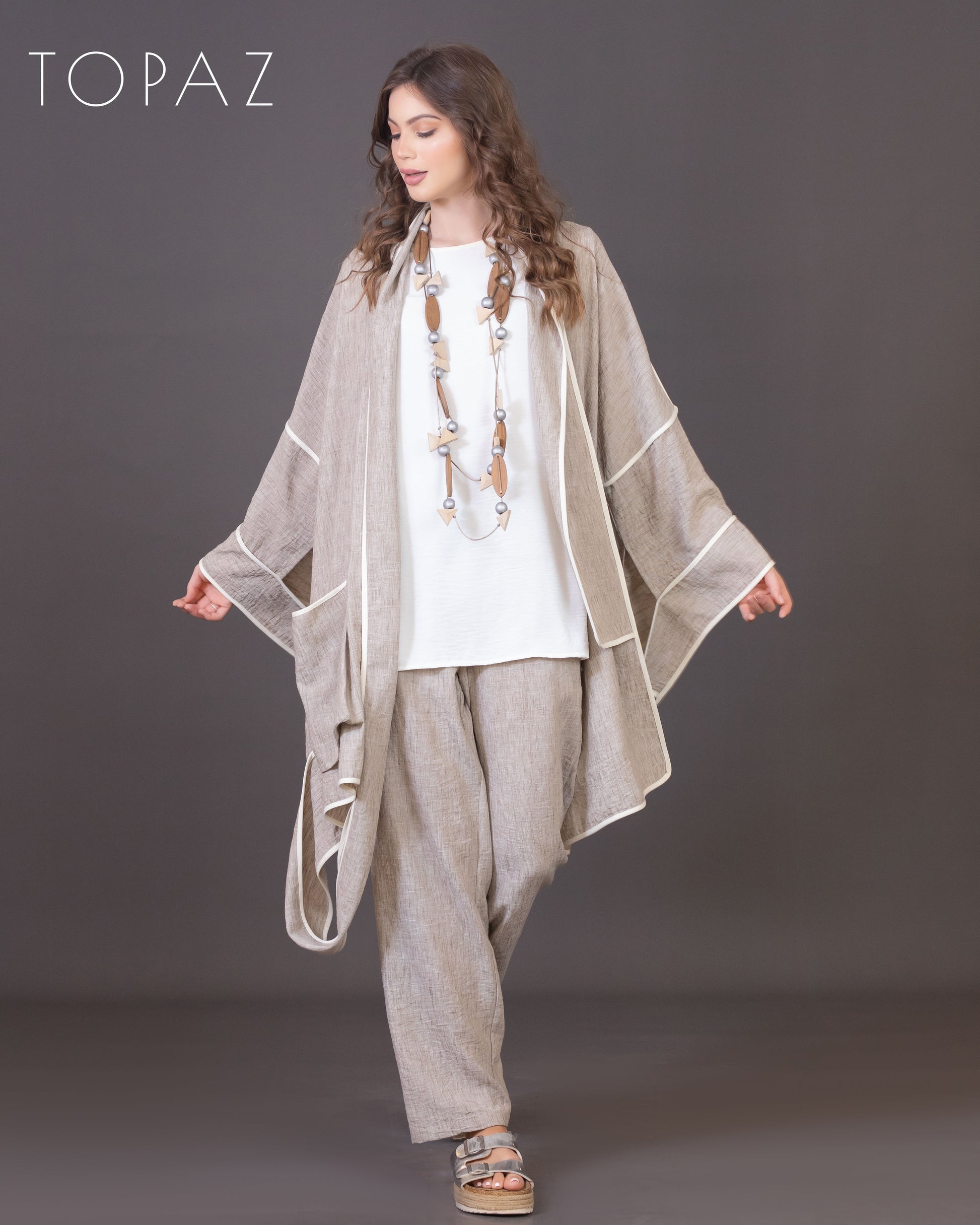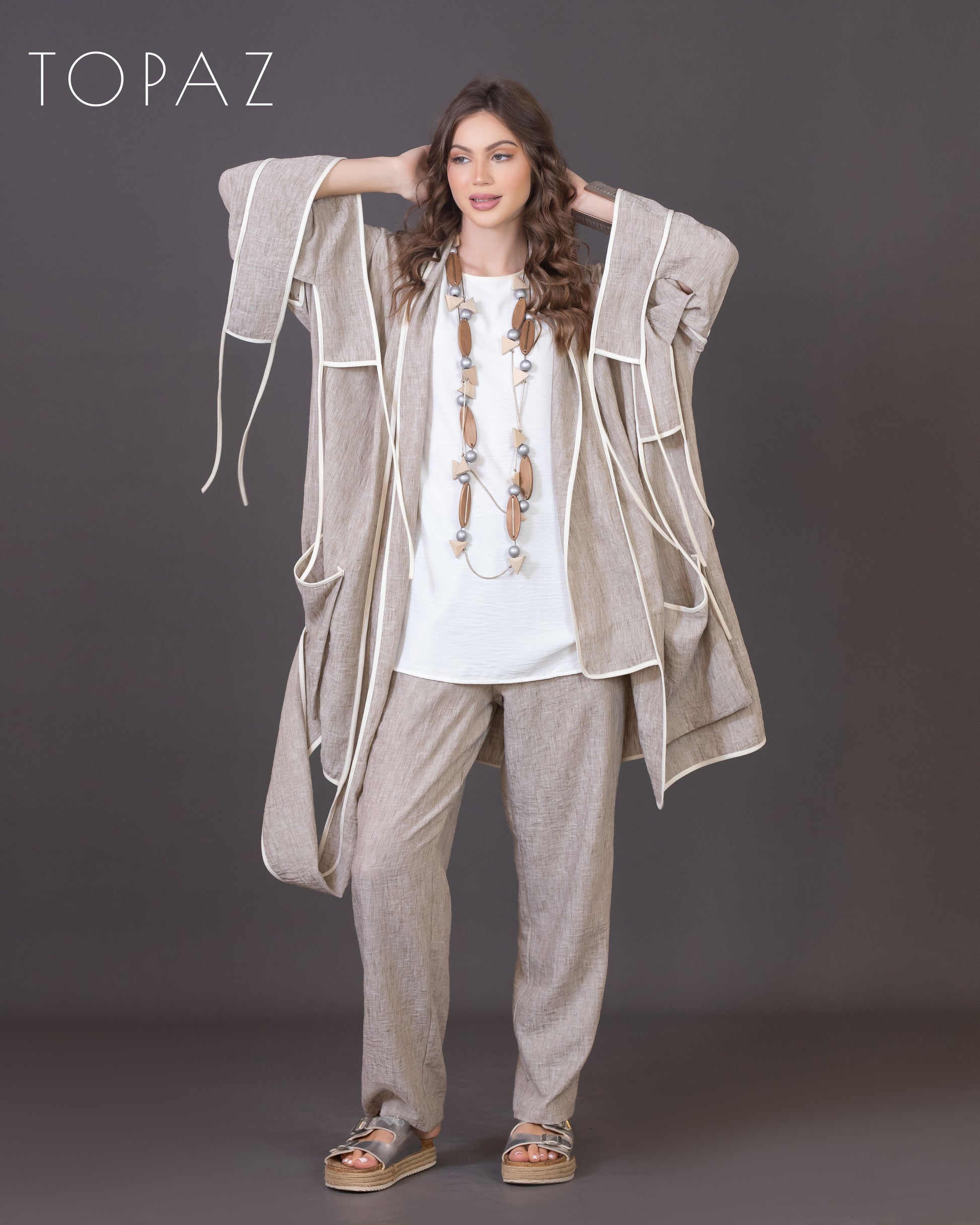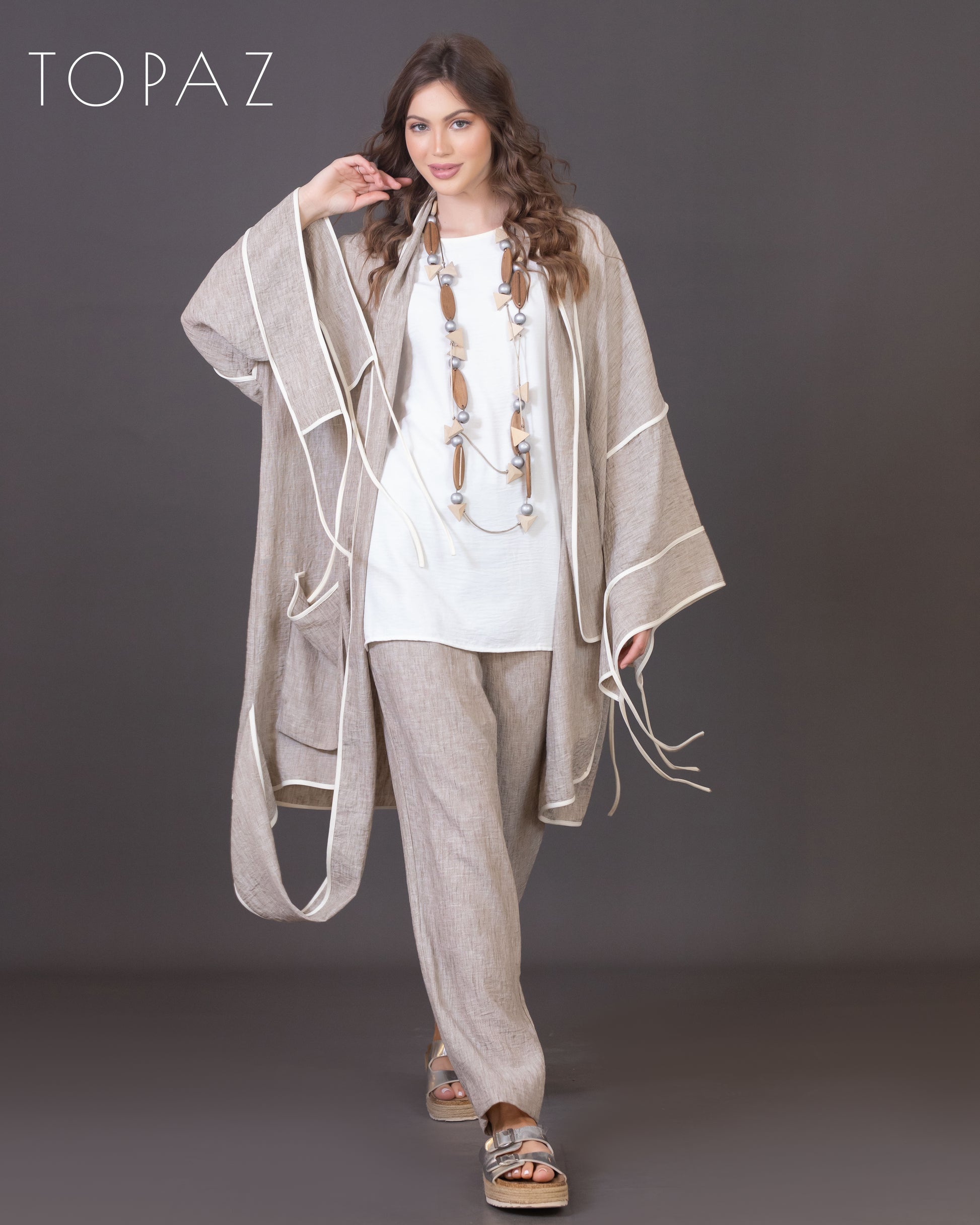 Two-piece set featuring an imported linen fabric and piping detailing.