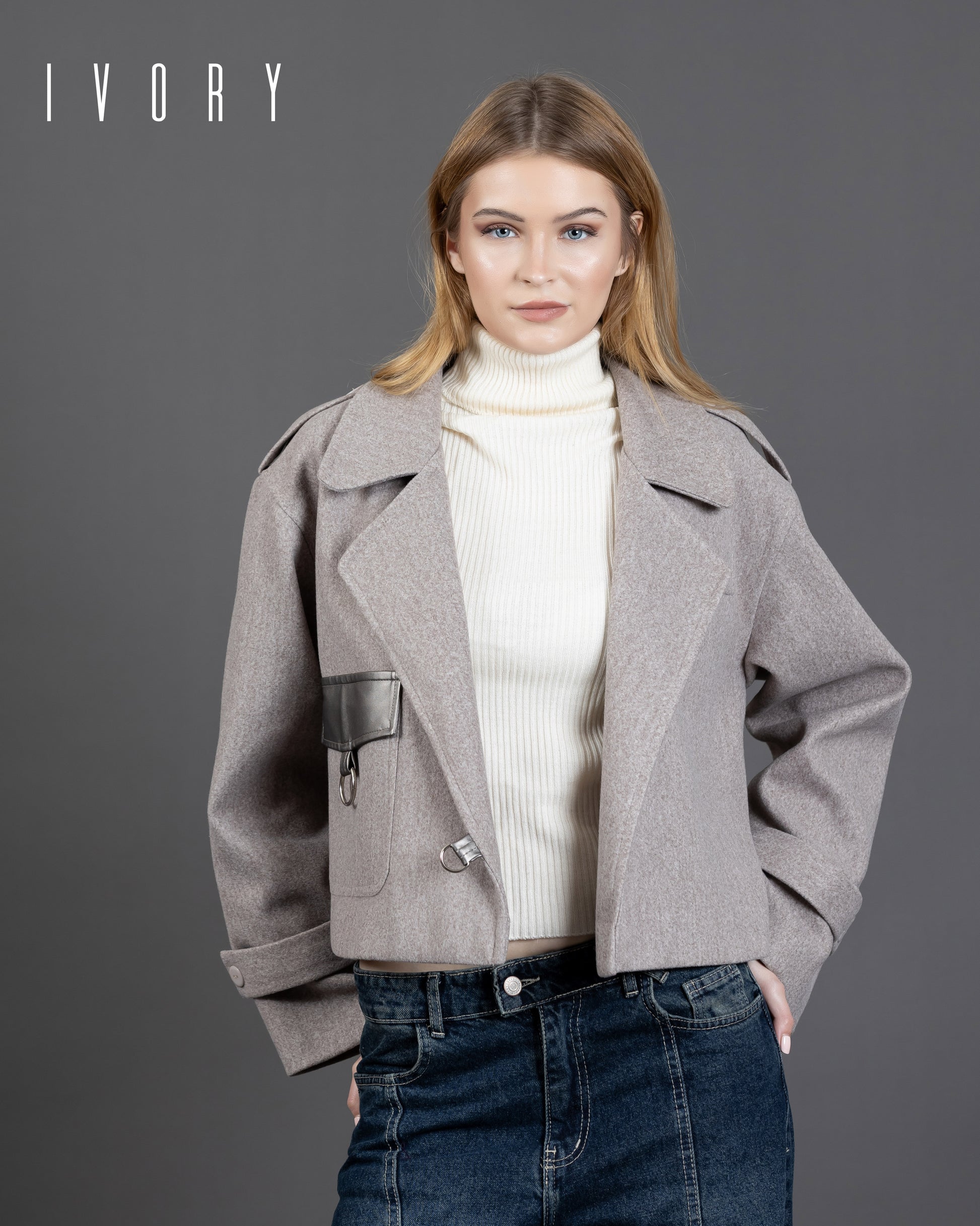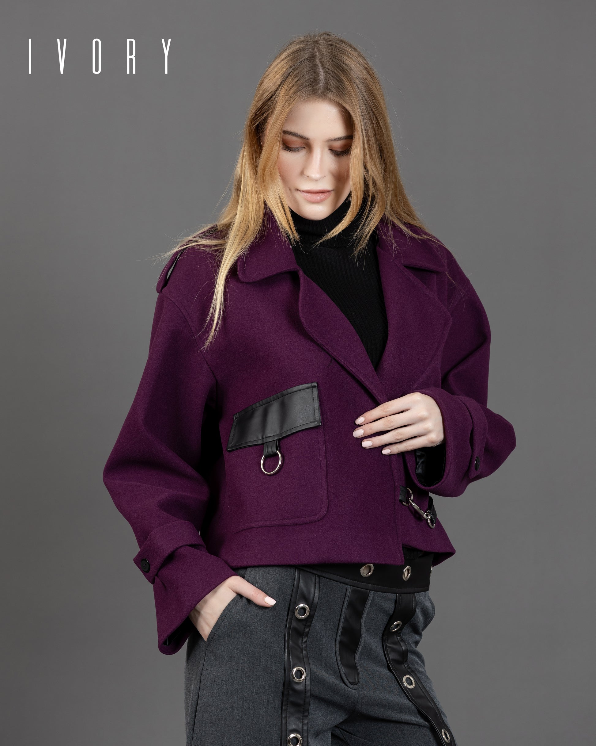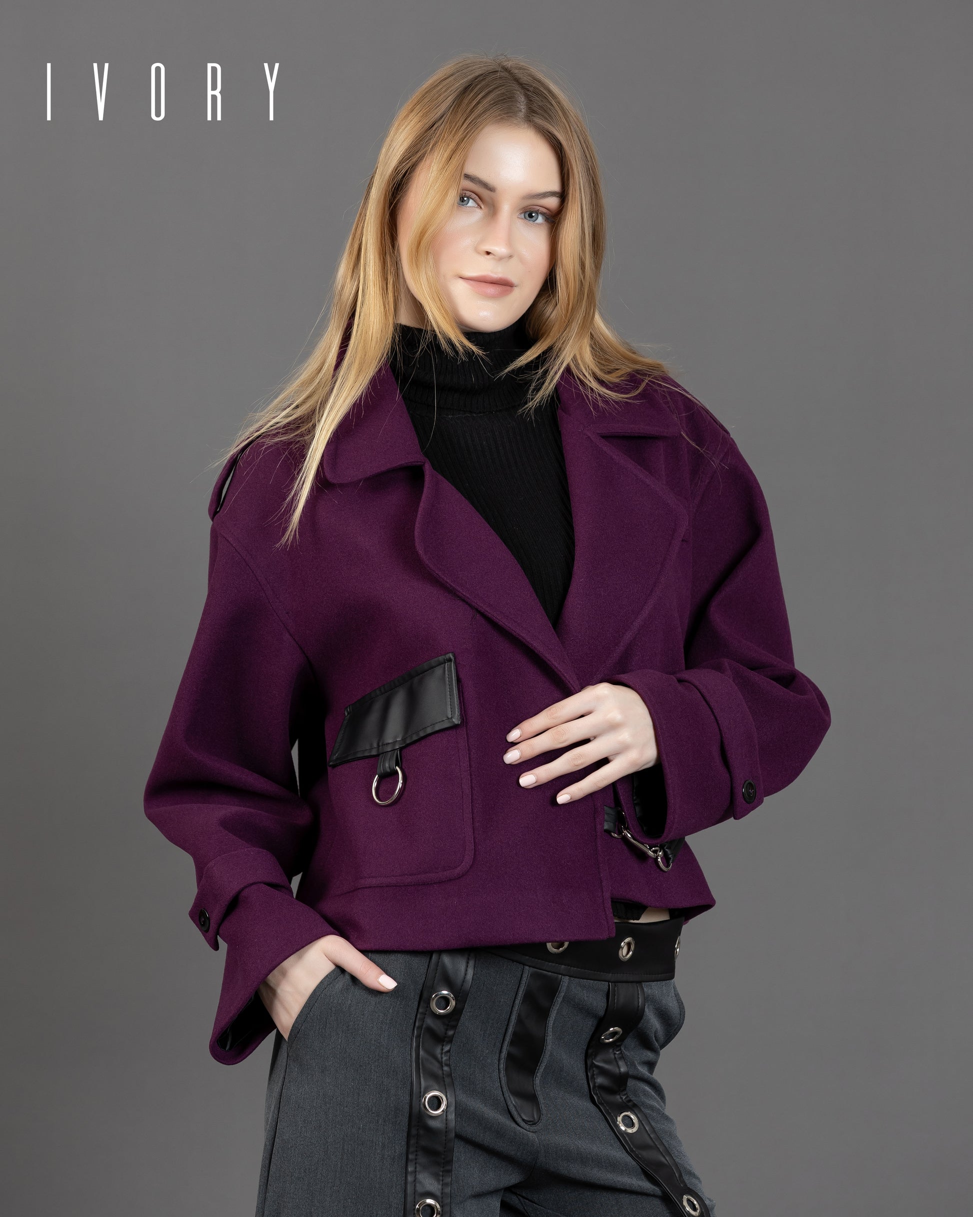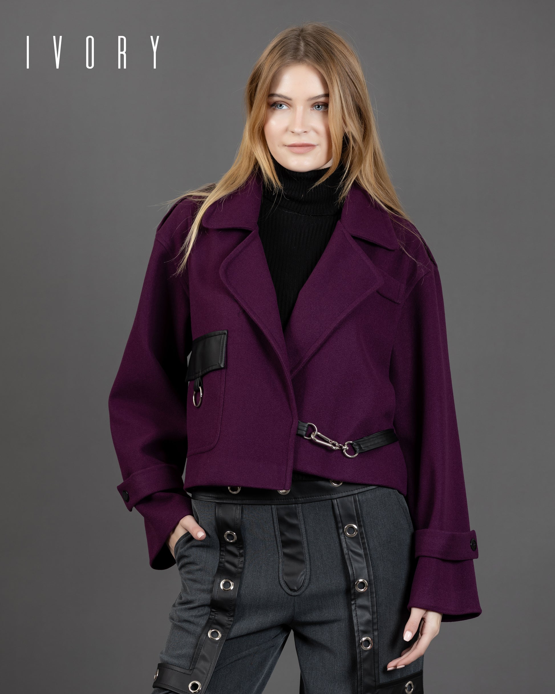 Jacket featuring an imported soft wool fabric, leather pocket, and silver hardware.