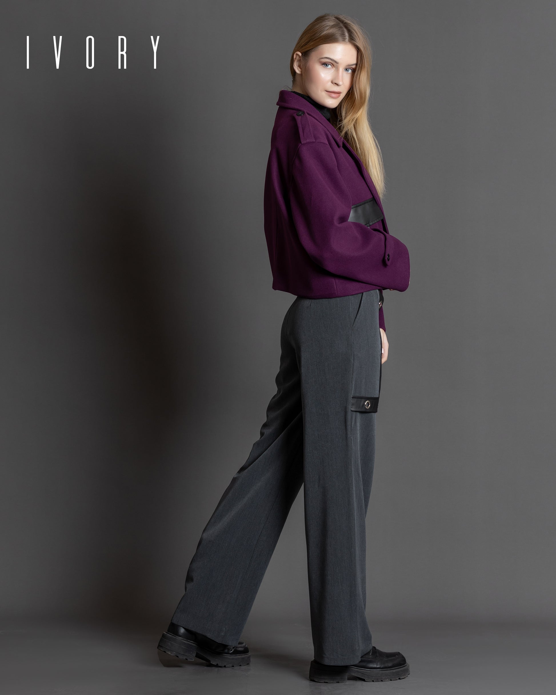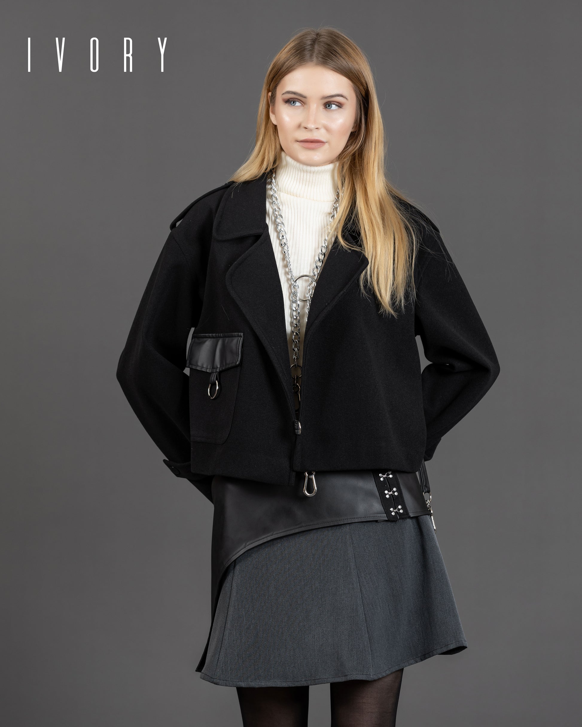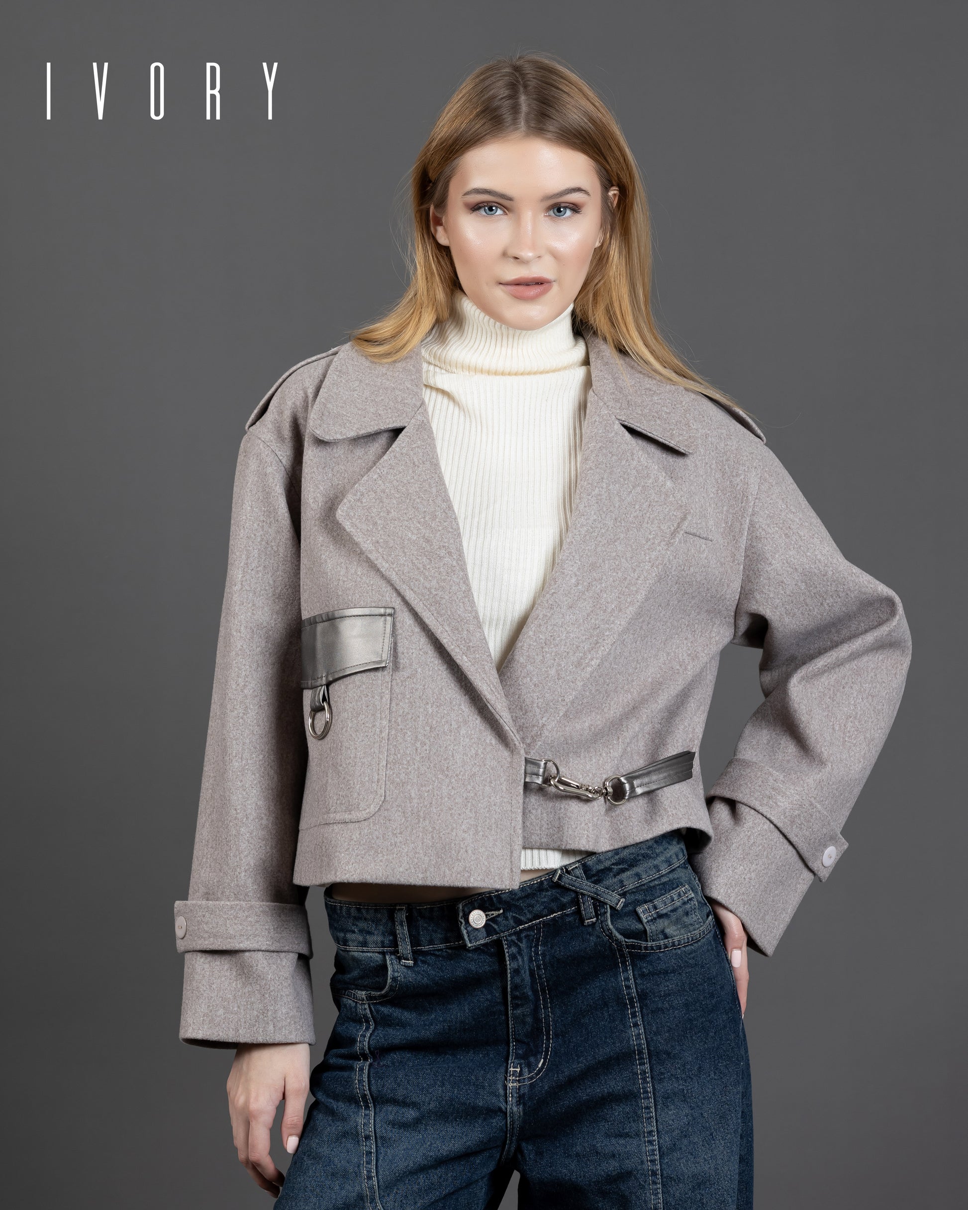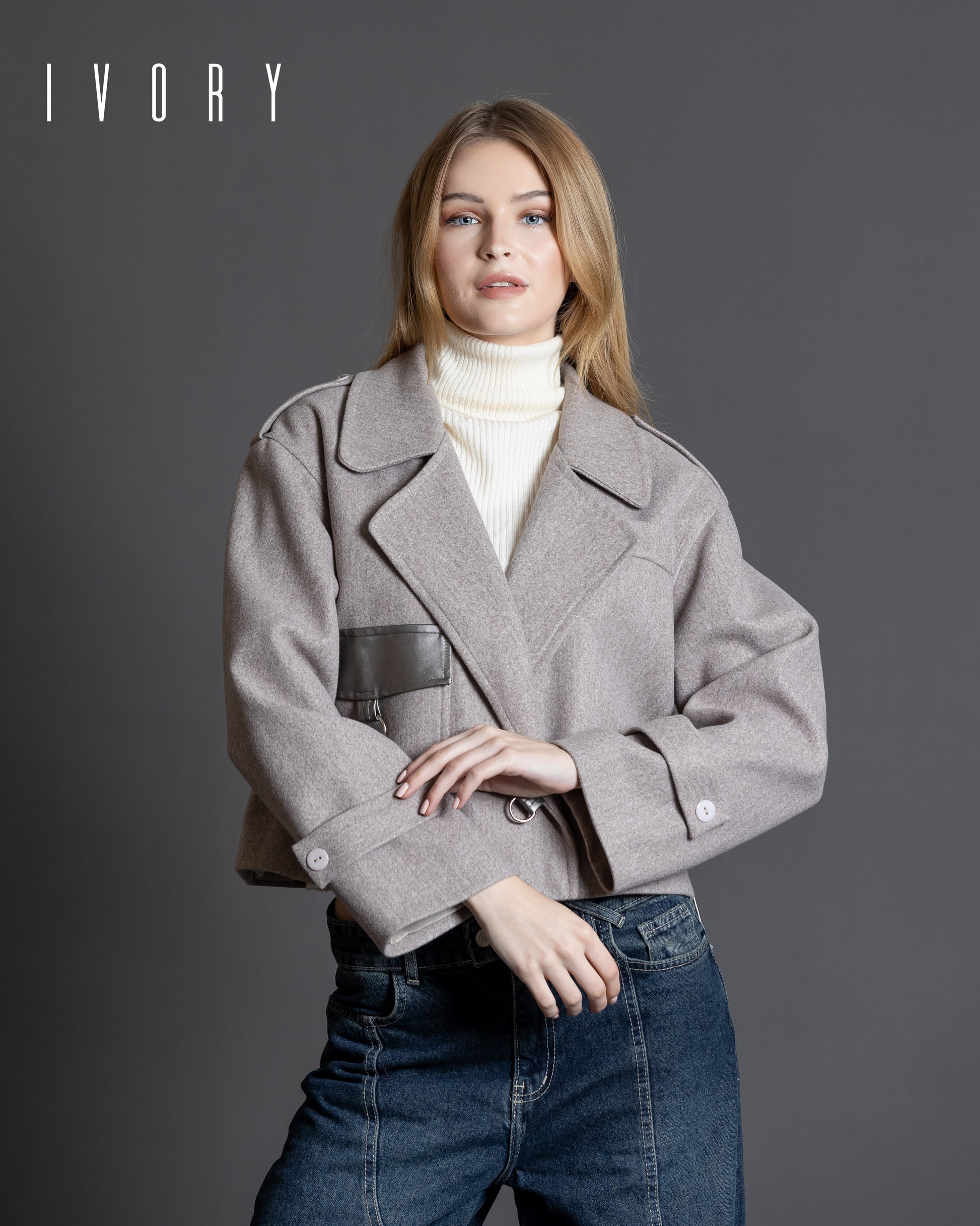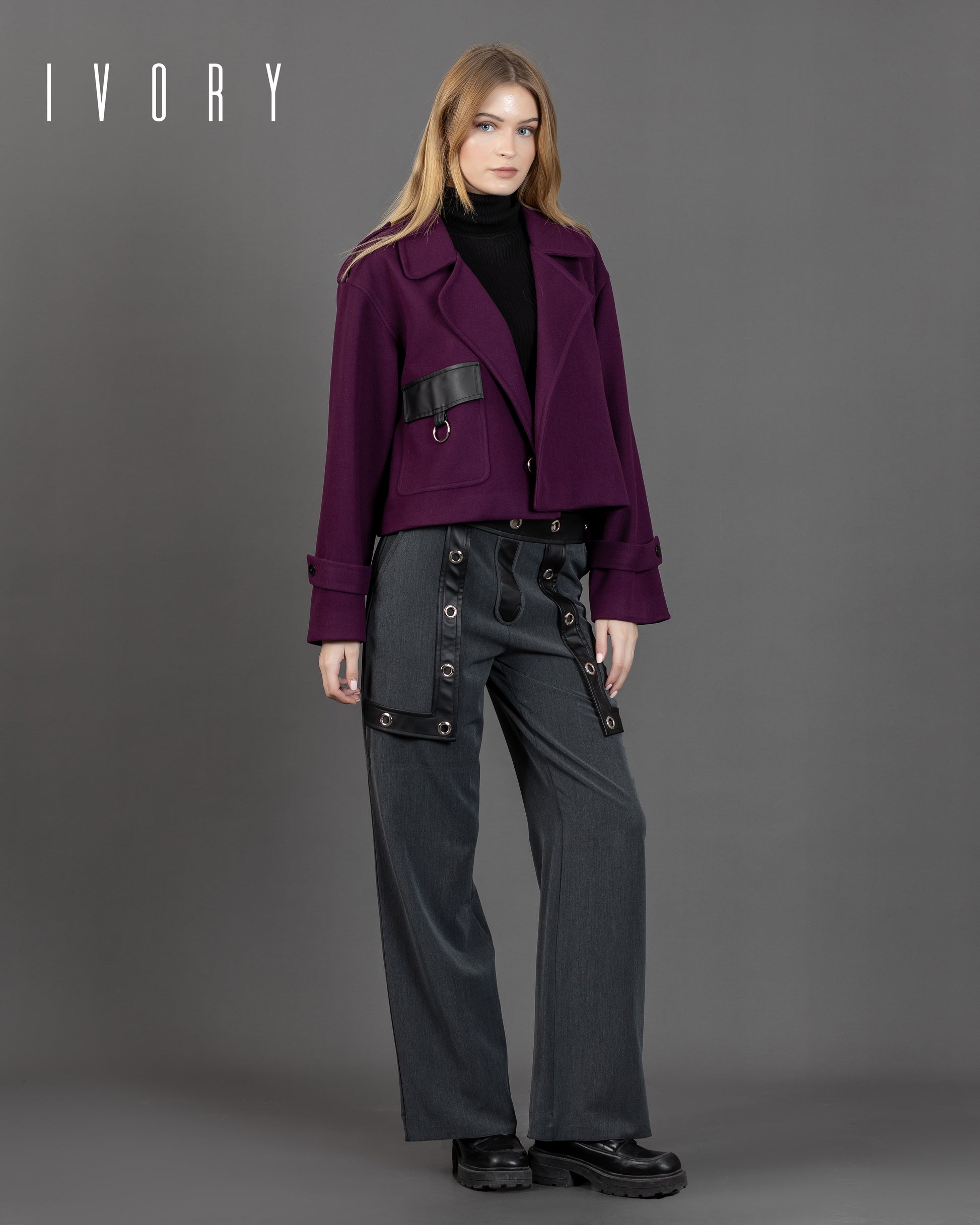 Jacket featuring an imported soft wool fabric, leather pocket, and silver hardware.
