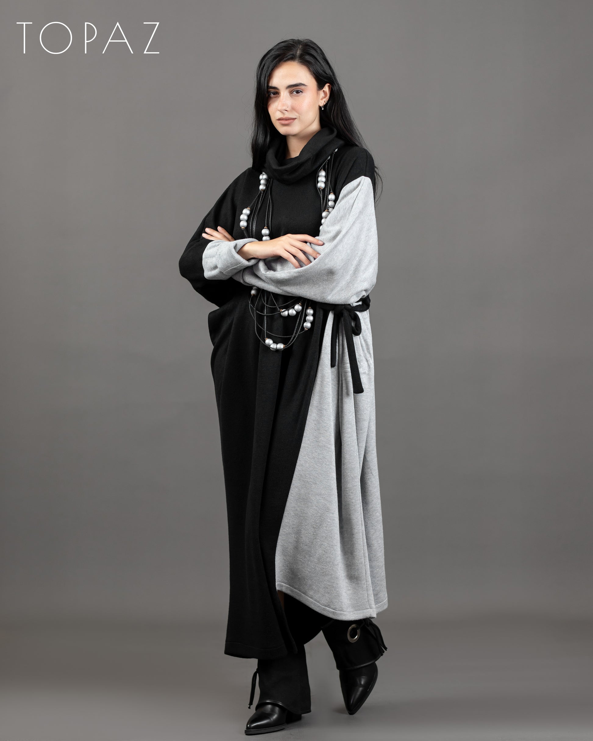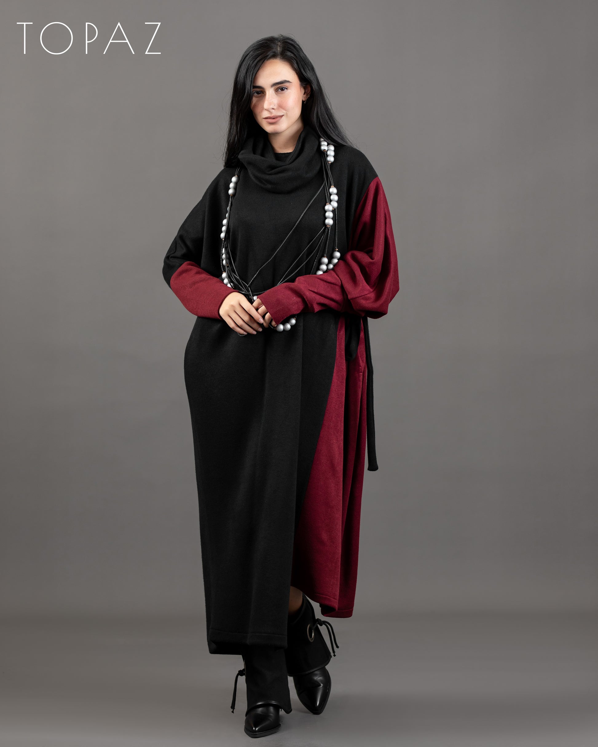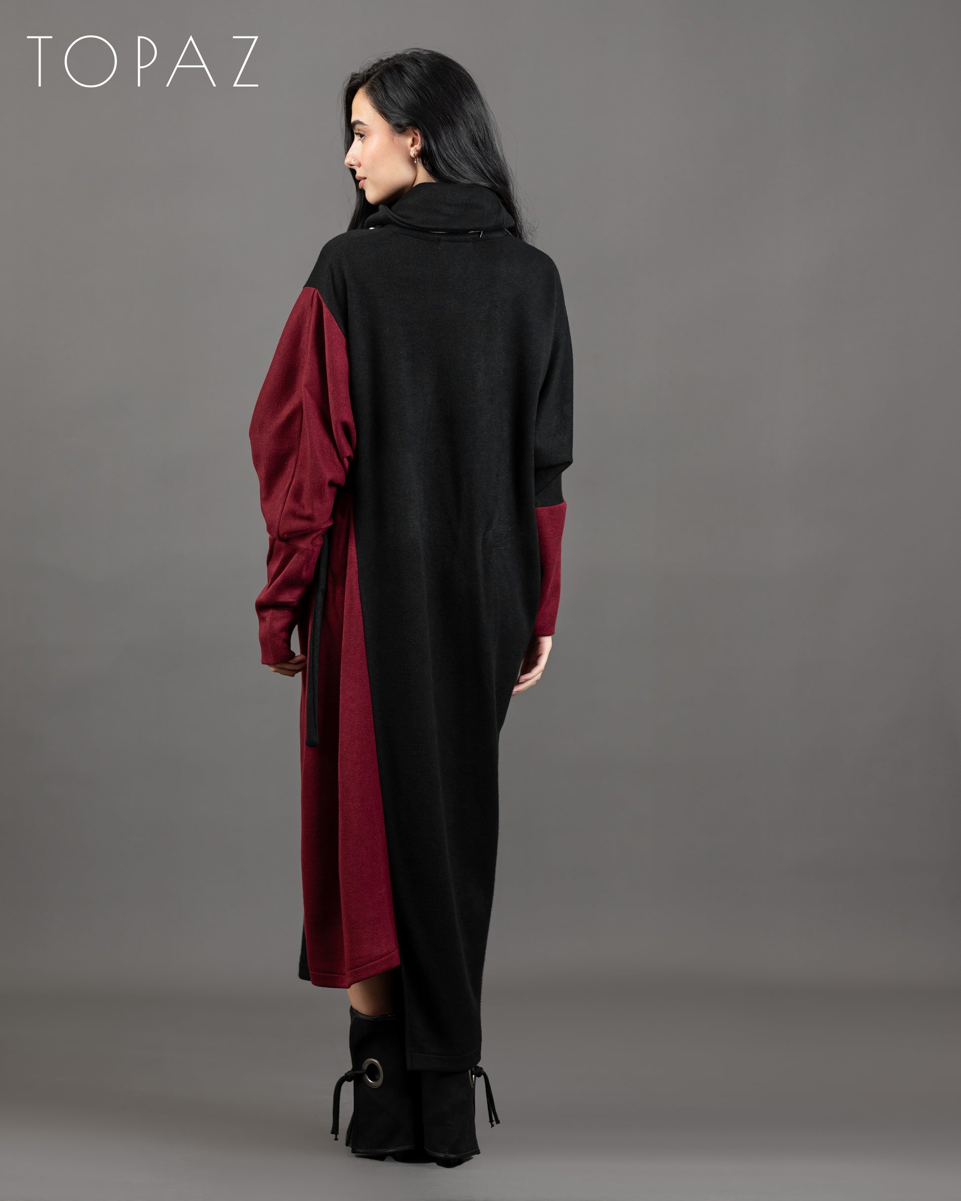 Asymmetrical two-toned dress featuring an imported soft knit fabric and belting.