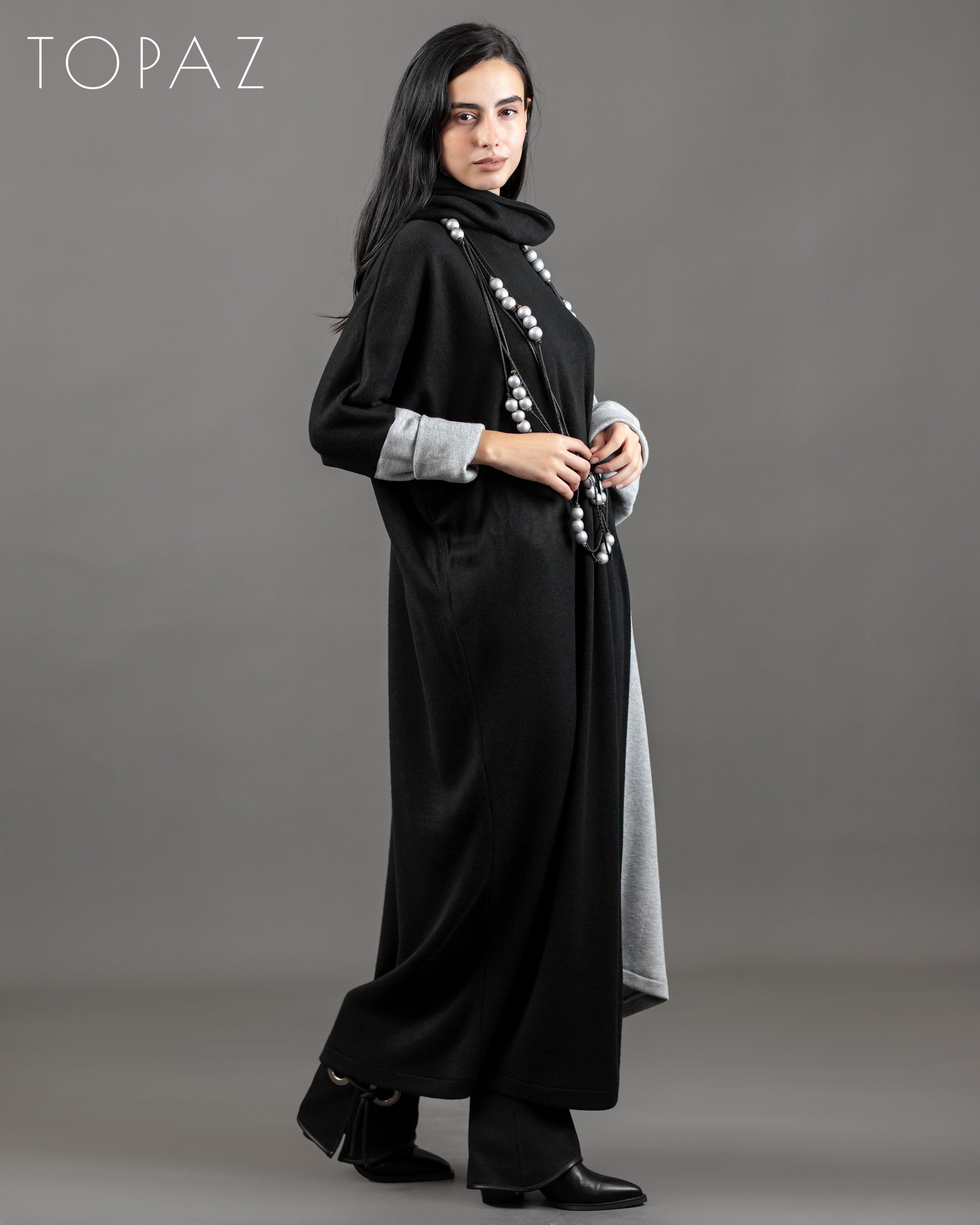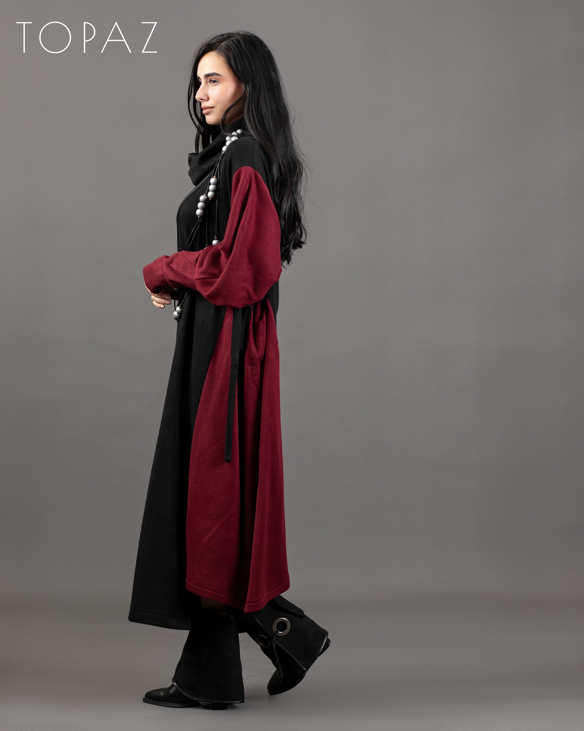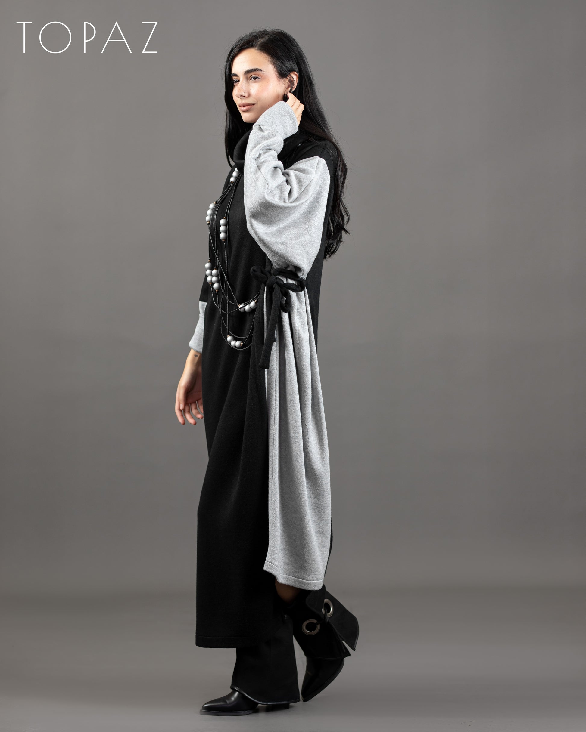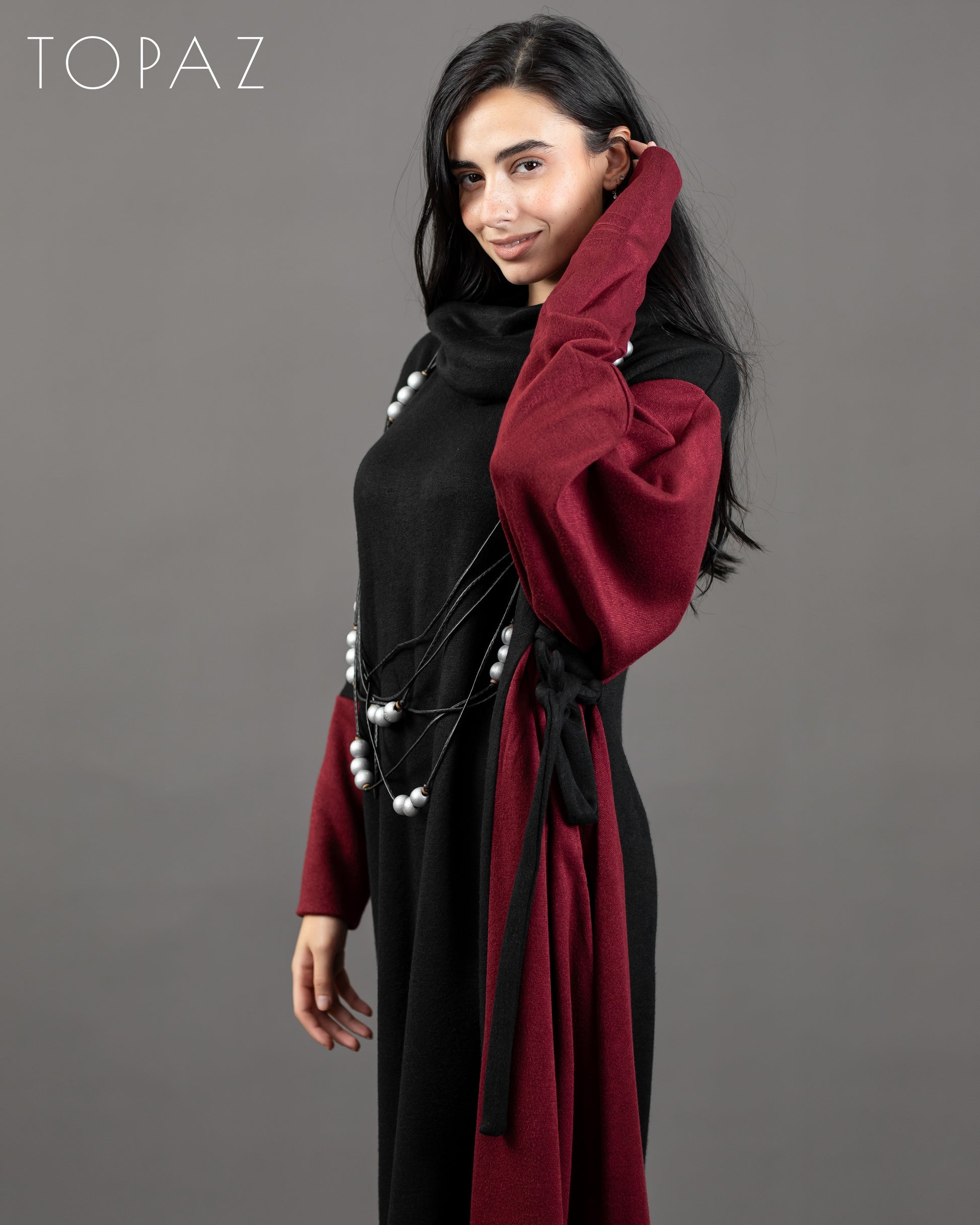 Asymmetrical two-toned dress featuring an imported soft knit fabric and belting.