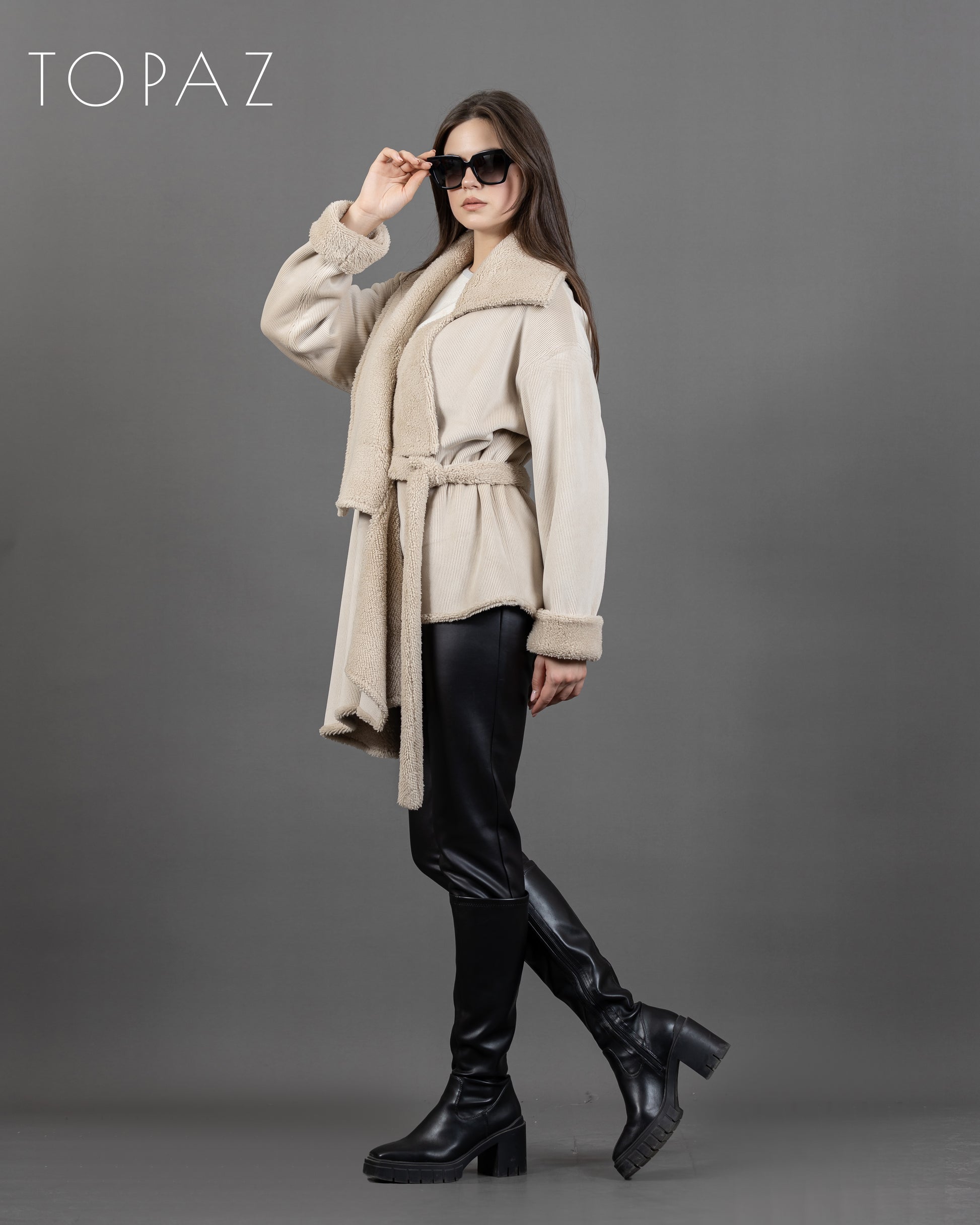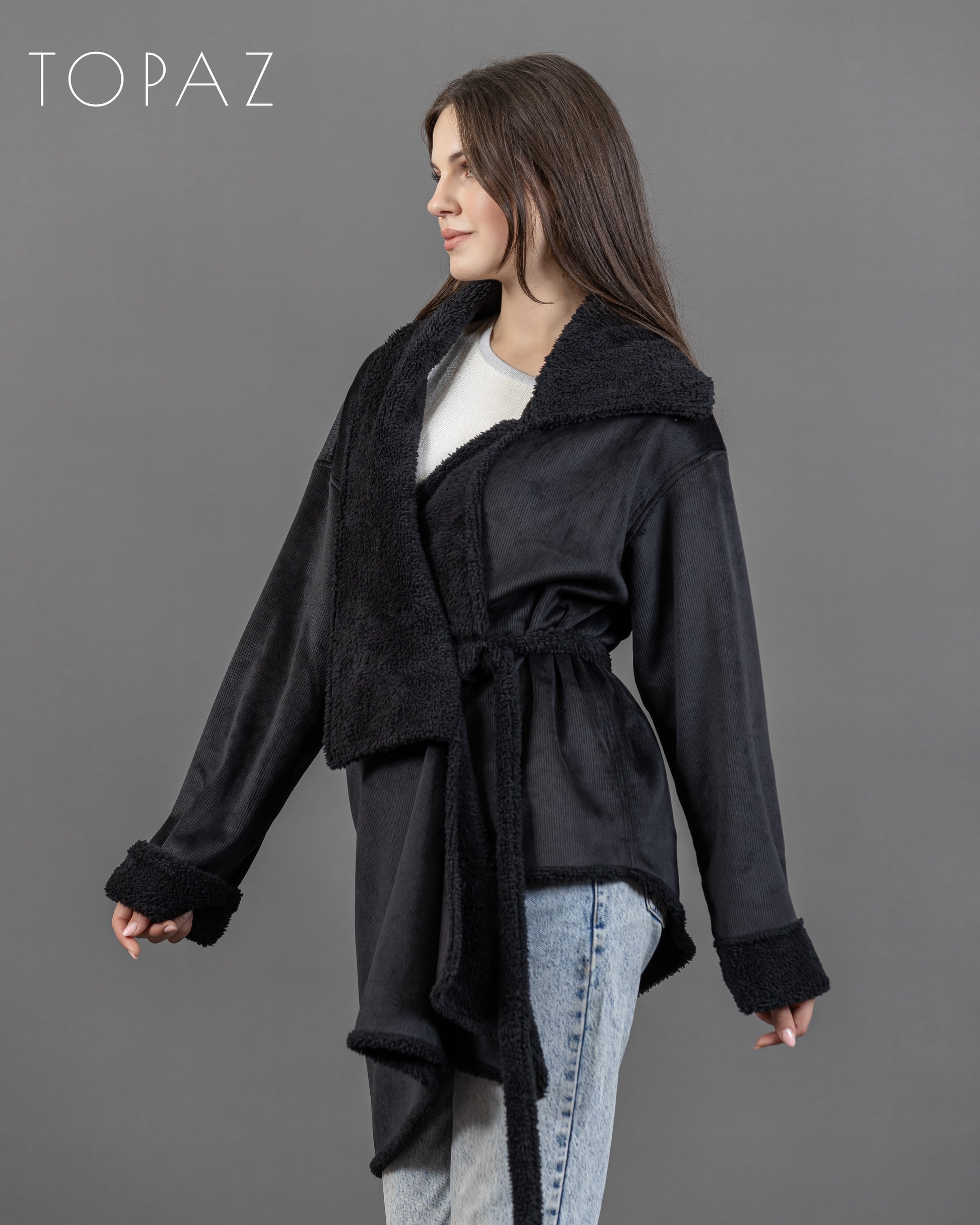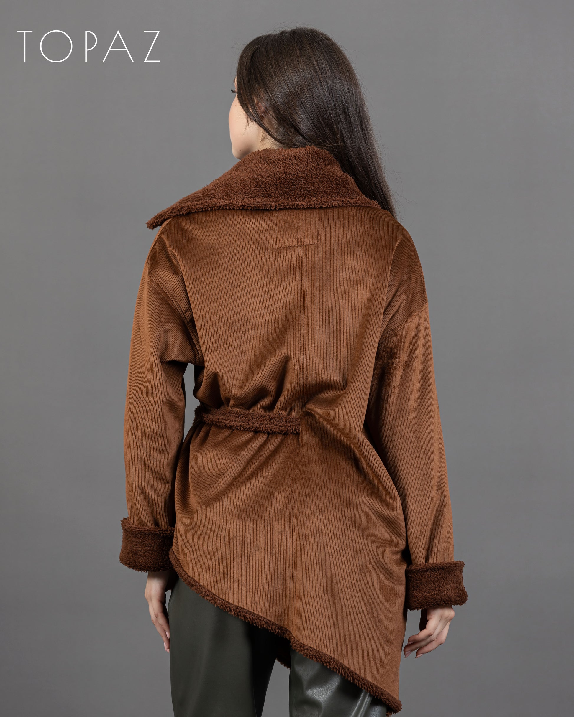 Jacket featuring an imported velvet fabric with Boucle lining, as well as a waist belt.