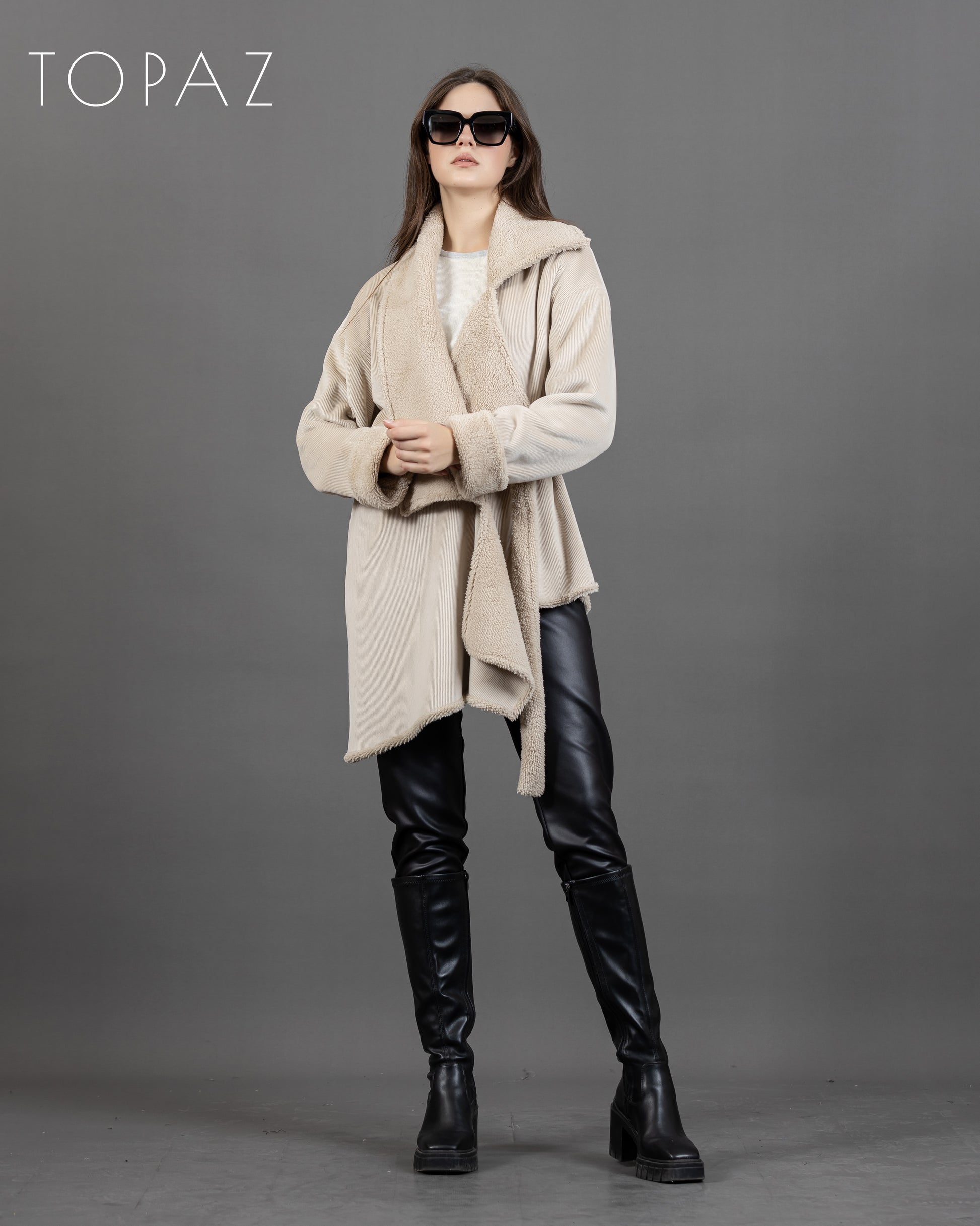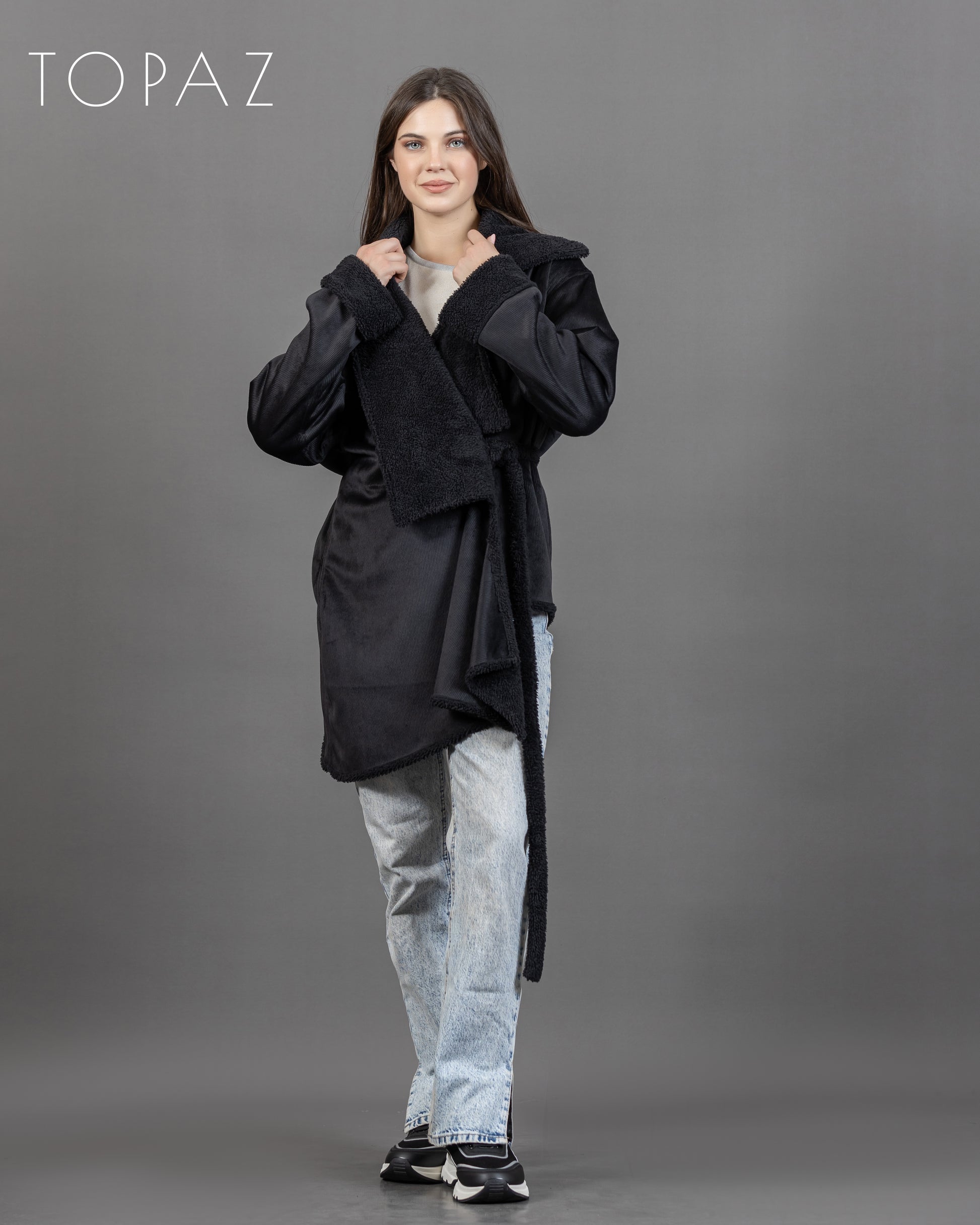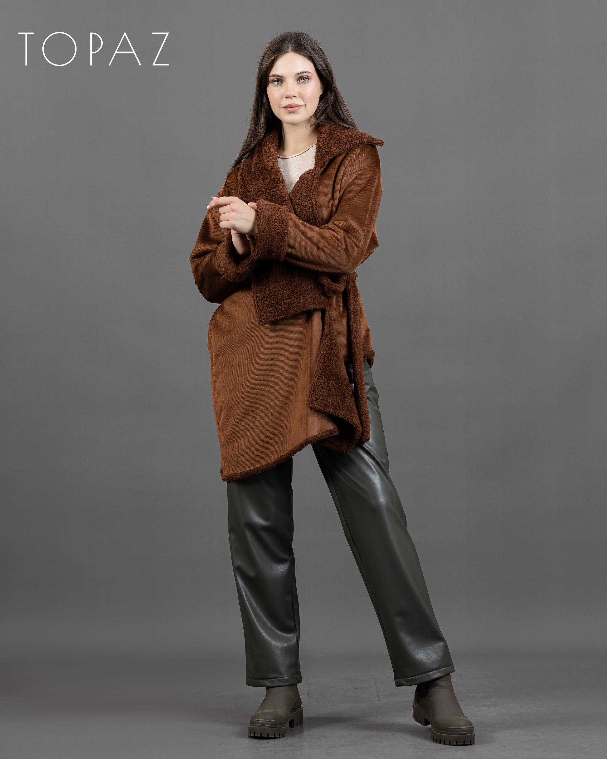 Jacket featuring an imported velvet fabric with Boucle lining, as well as a waist belt.