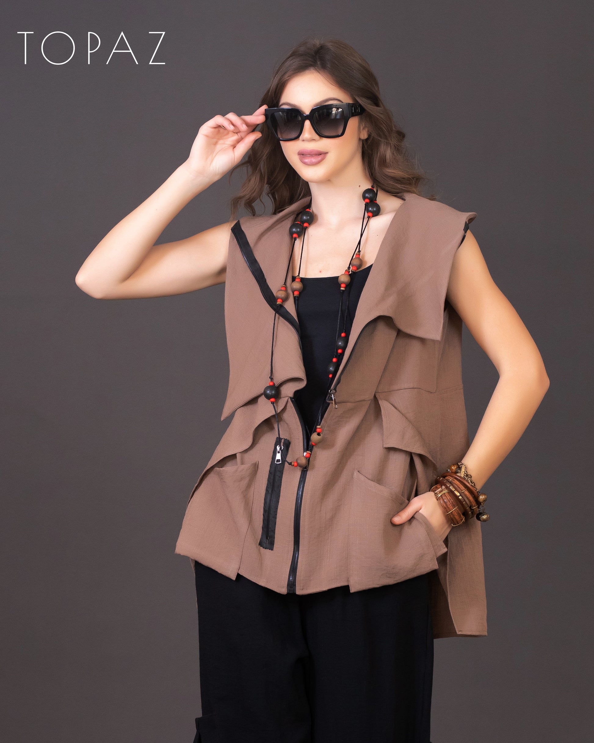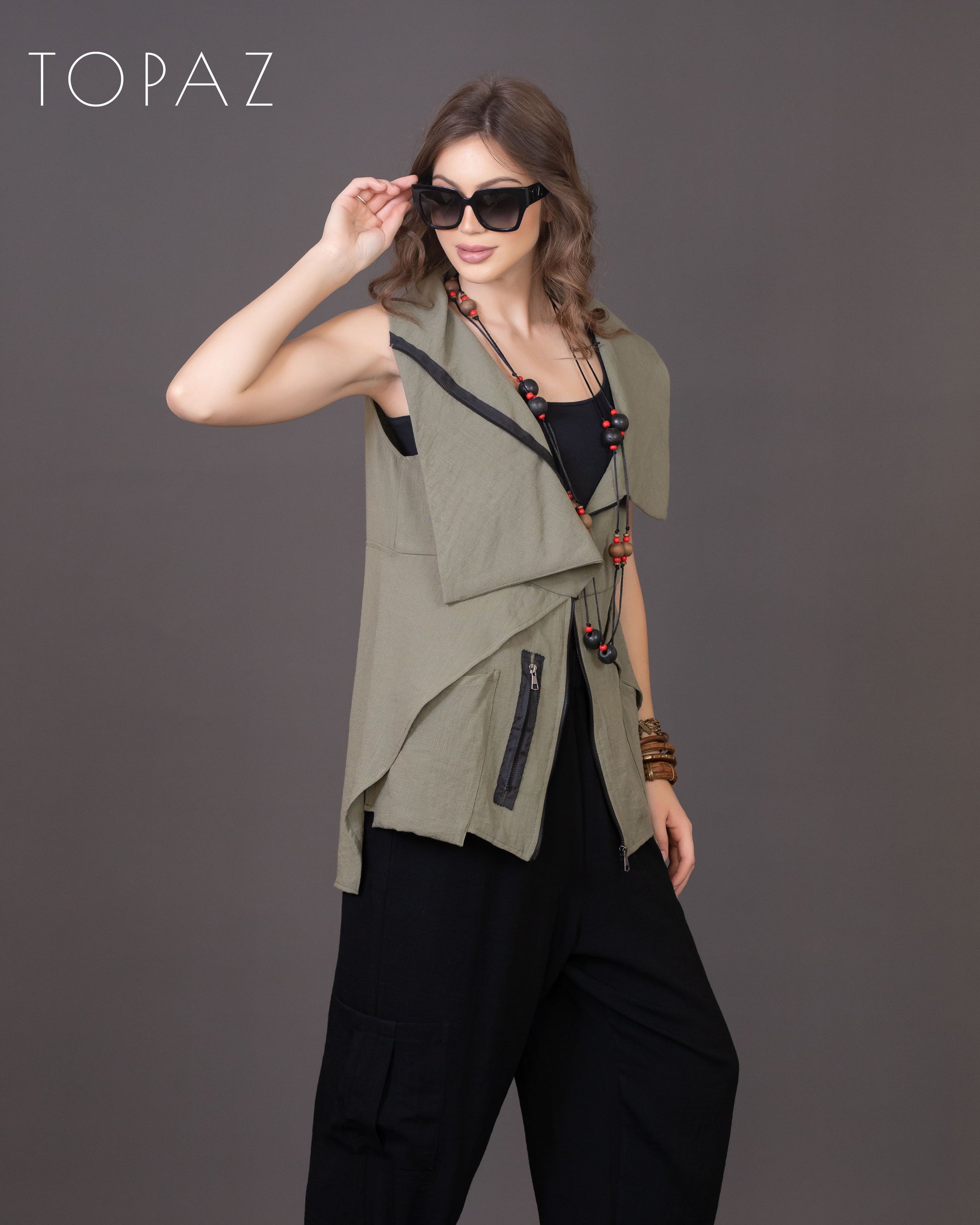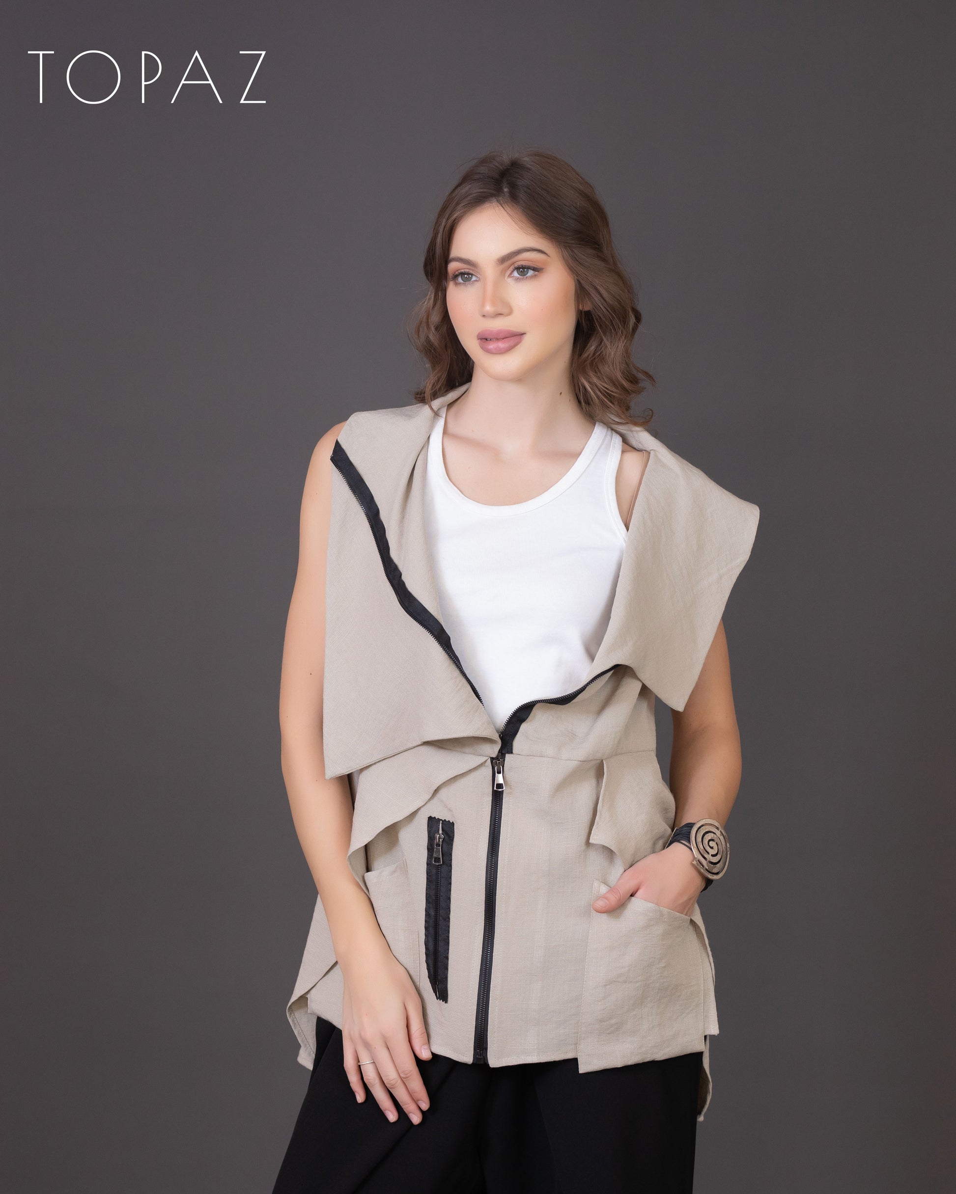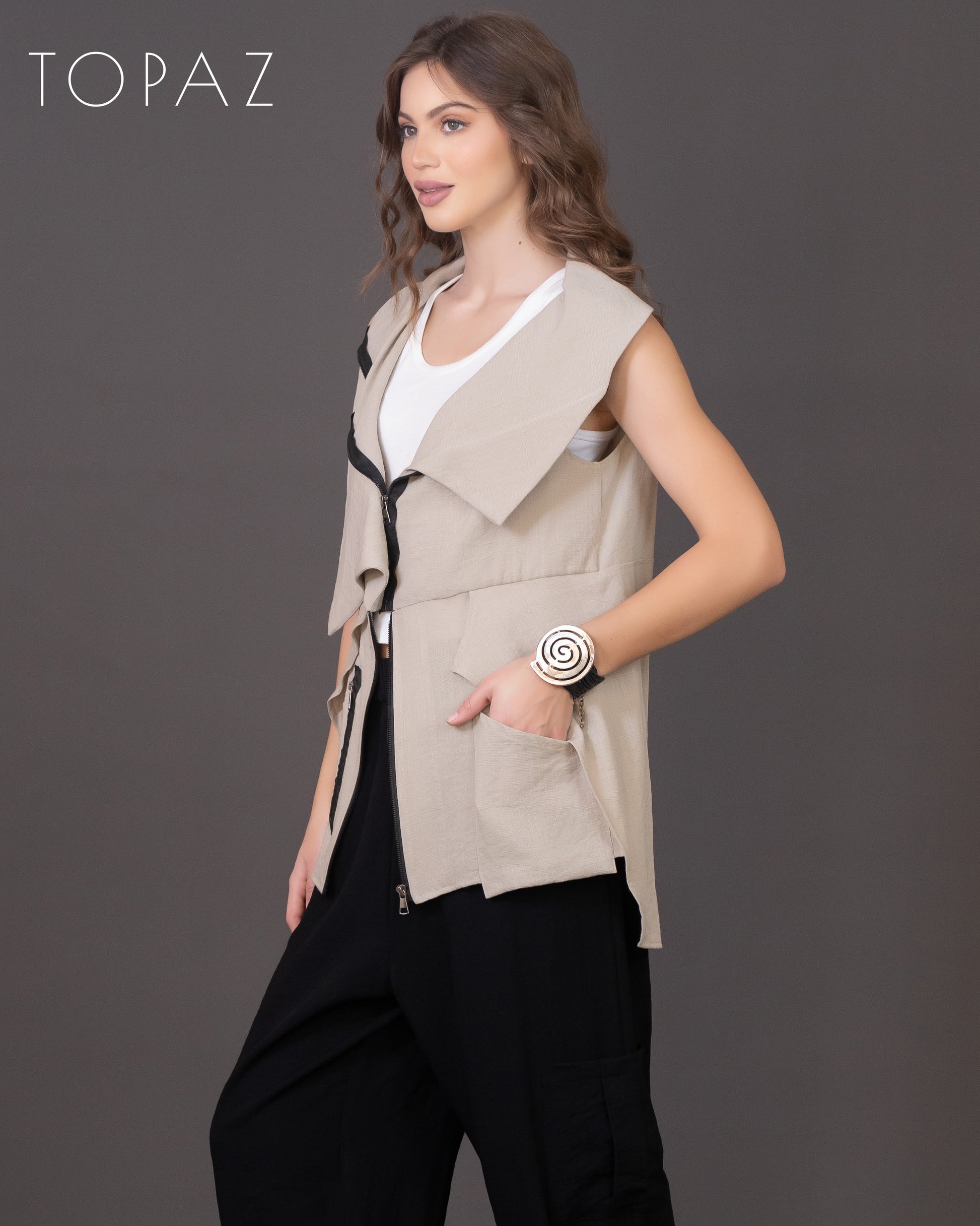 Vest featuring an imported soft linen fabric and black zipper detailing.