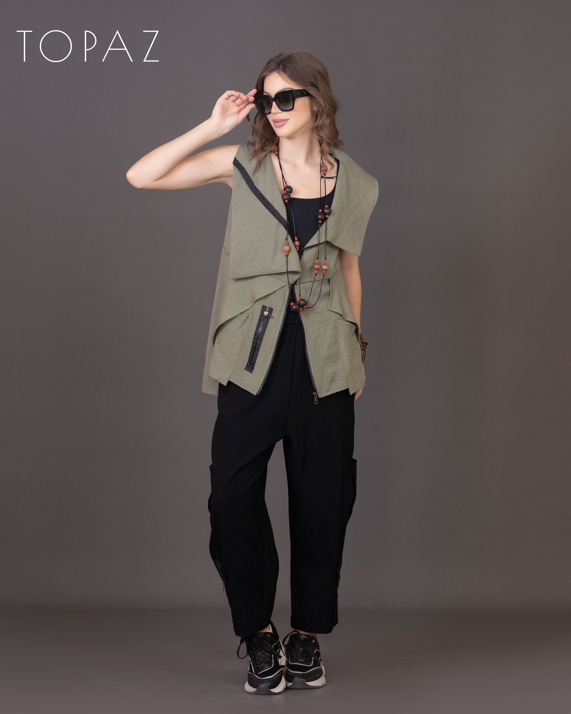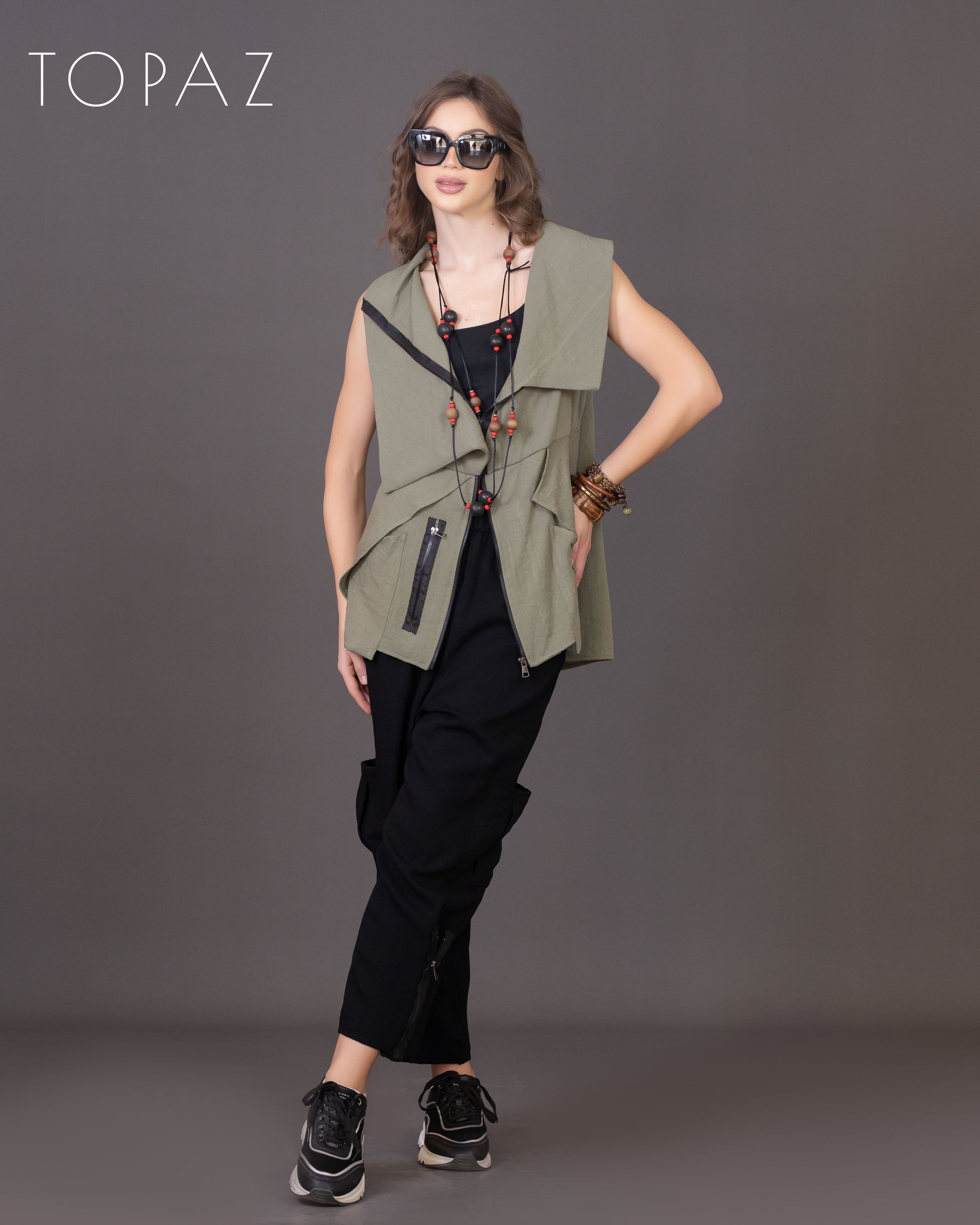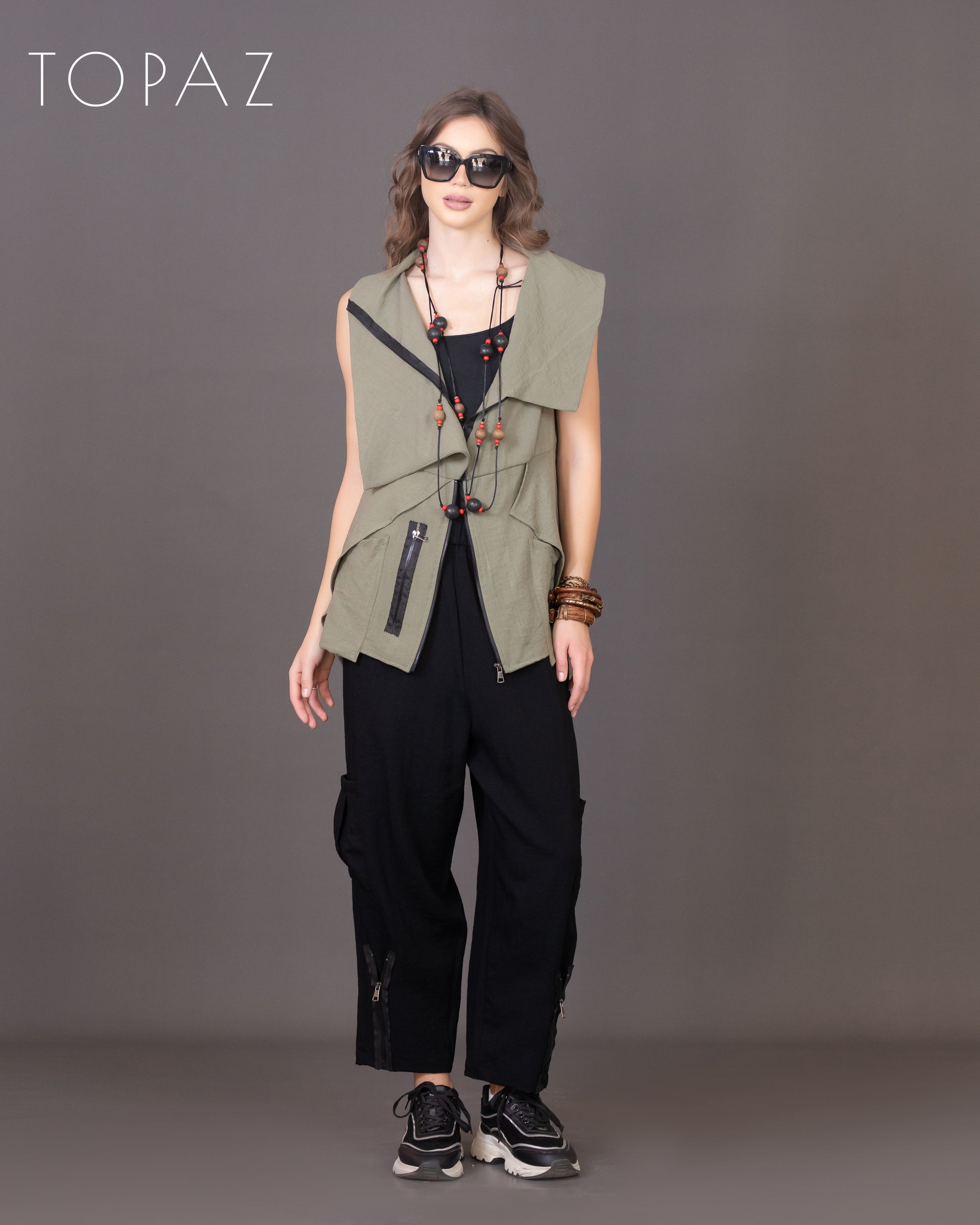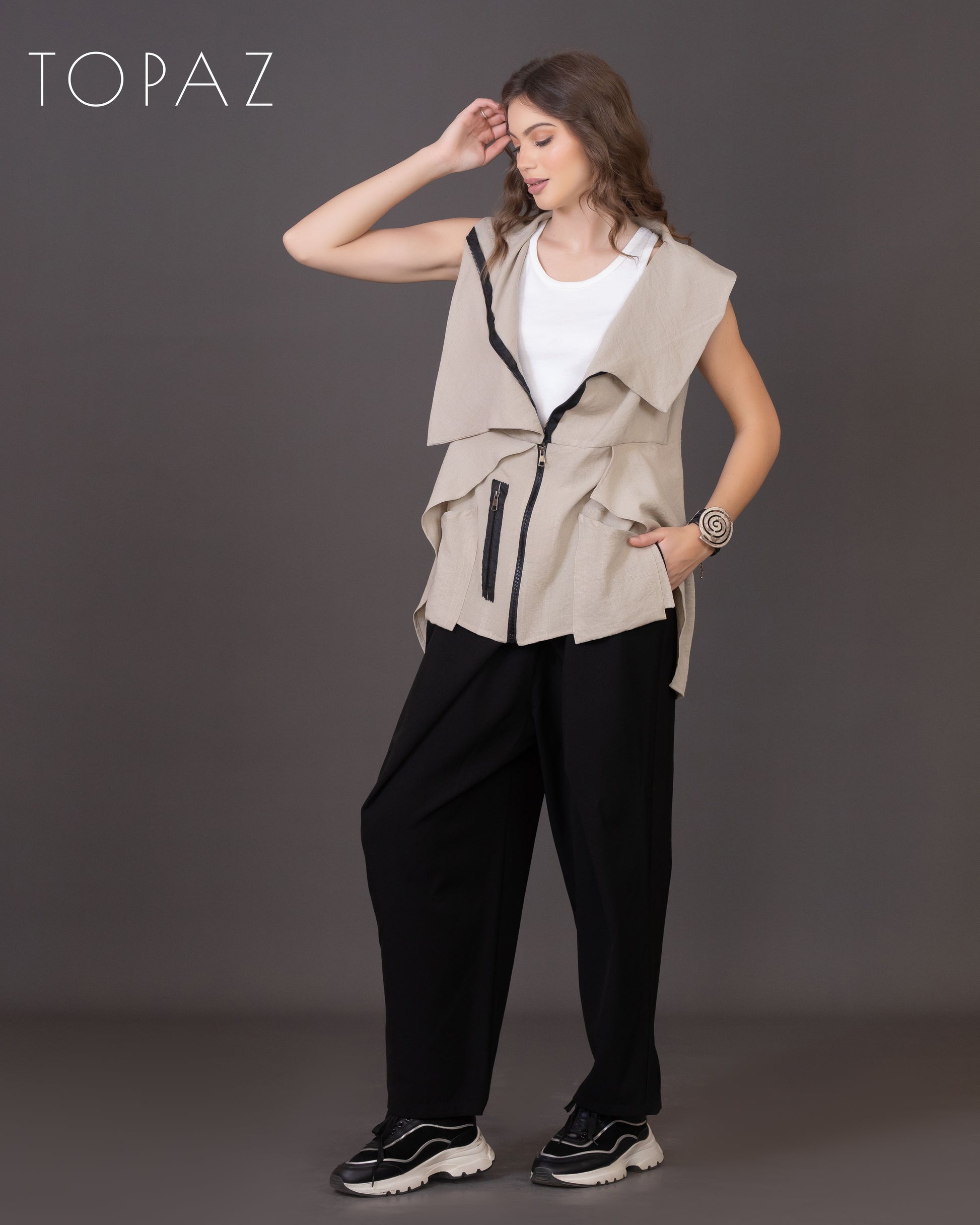 Vest featuring an imported soft linen fabric and black zipper detailing.