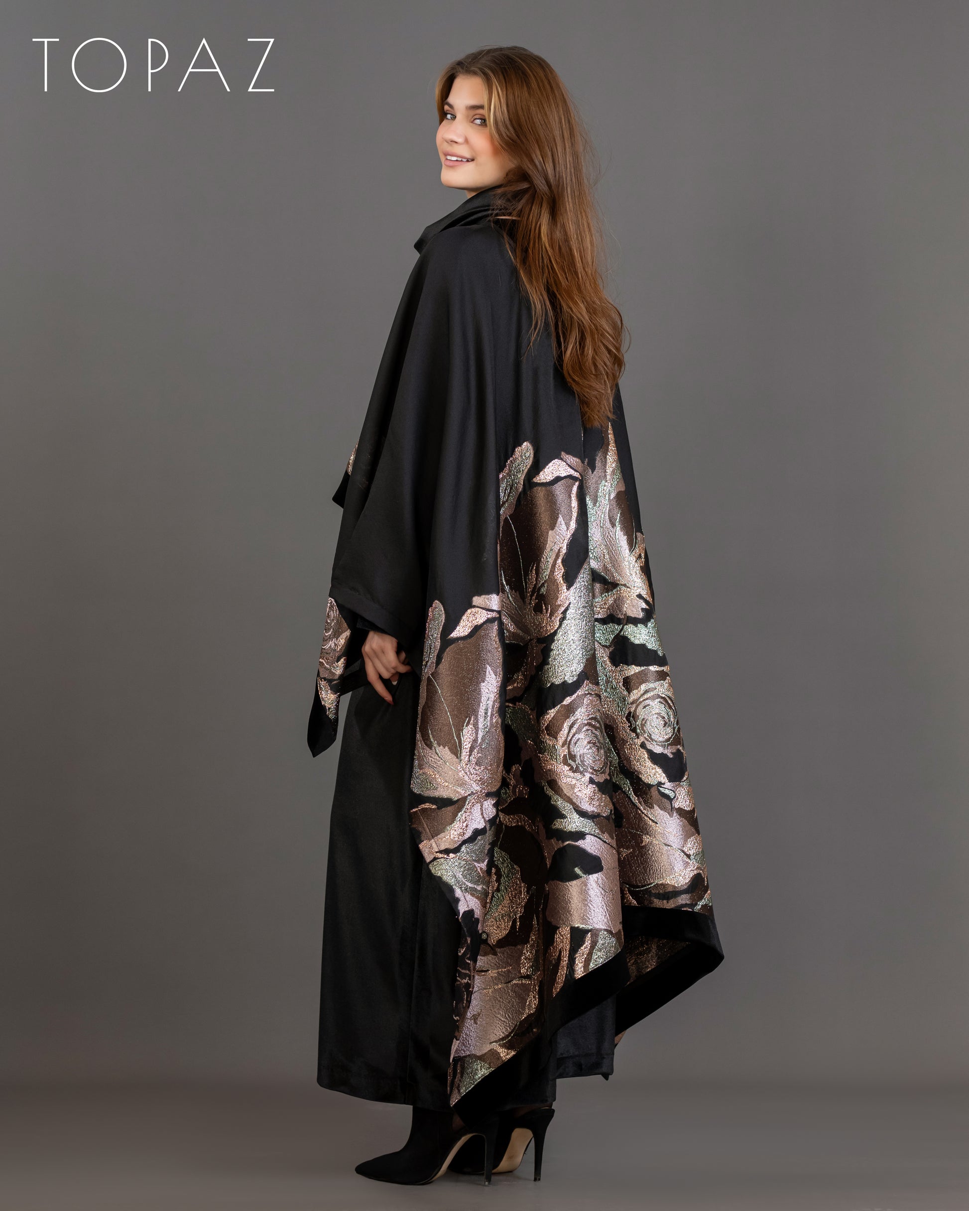 Poncho set featuring an imported brocade fabric and velvet dress.