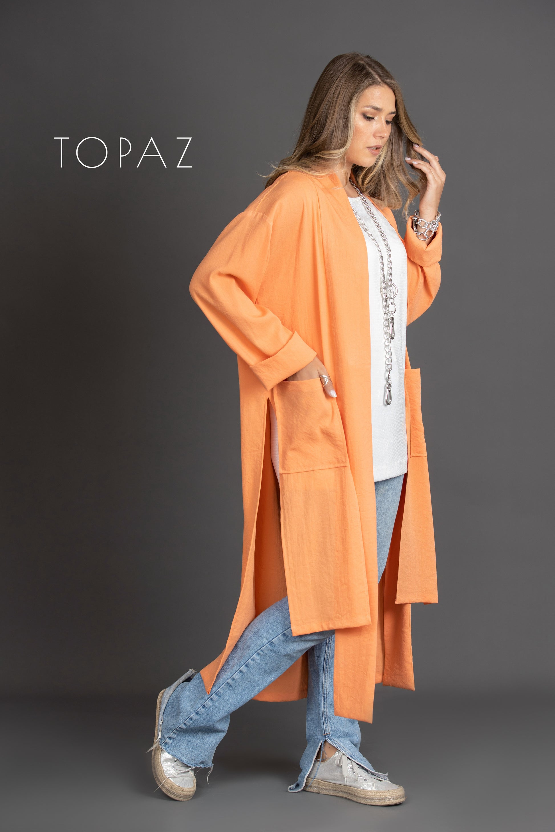 A long, flowy cardigan with a twist, featuring an open slit in the back.