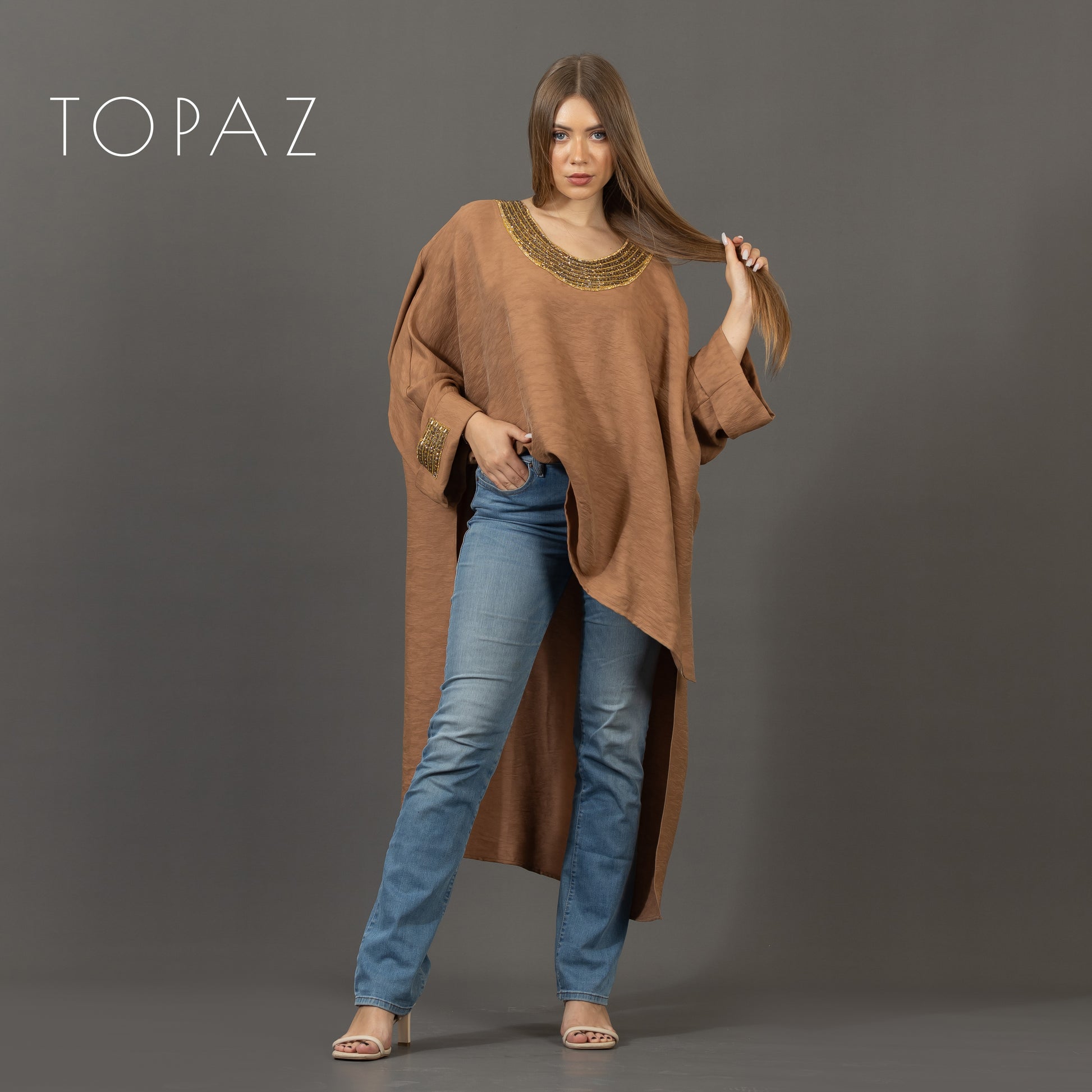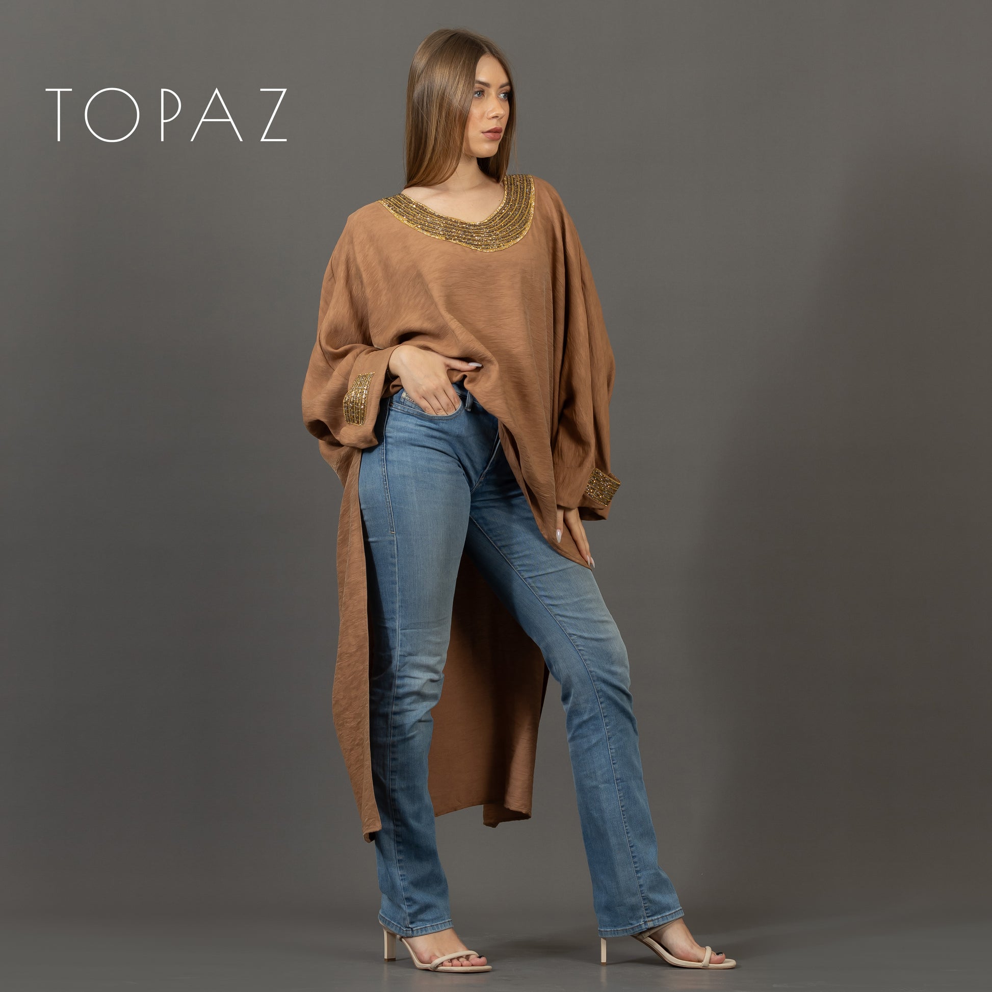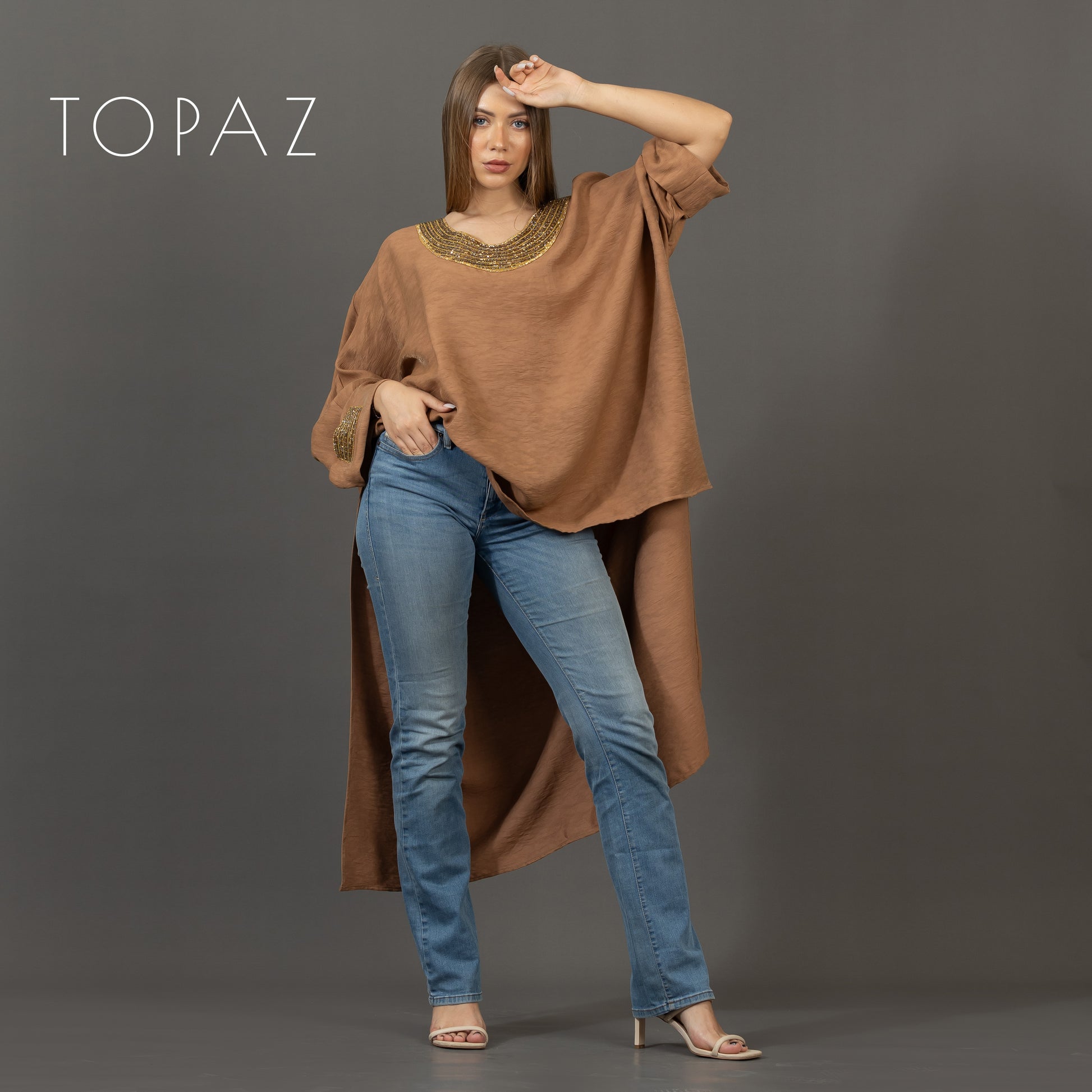 Poncho featuring an imported Rion Tinsel fabric and beaded collar and sleeve detailing.