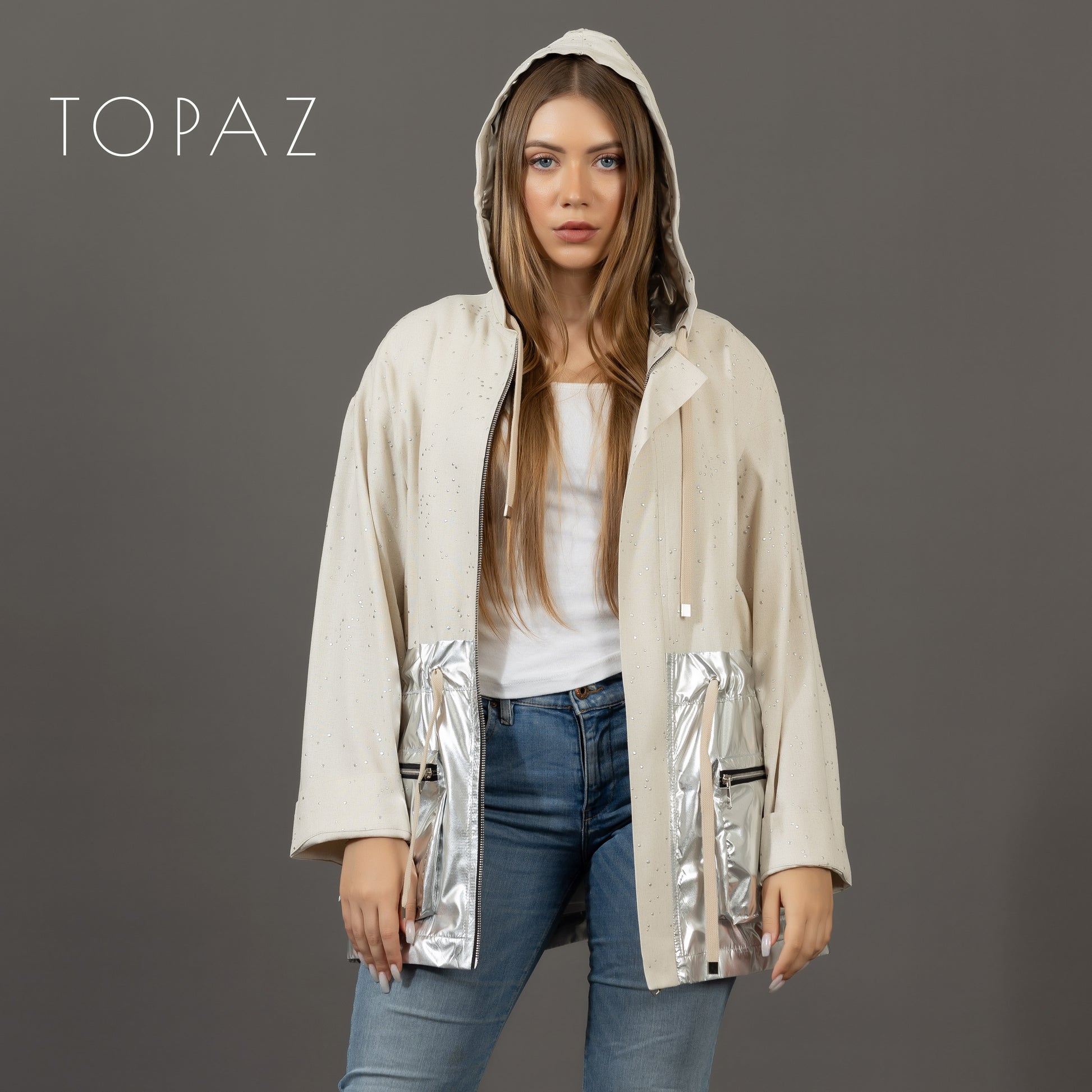 A hooded linen jacket featuring an imported polka-dot linen fabric and metallic lower half panel.