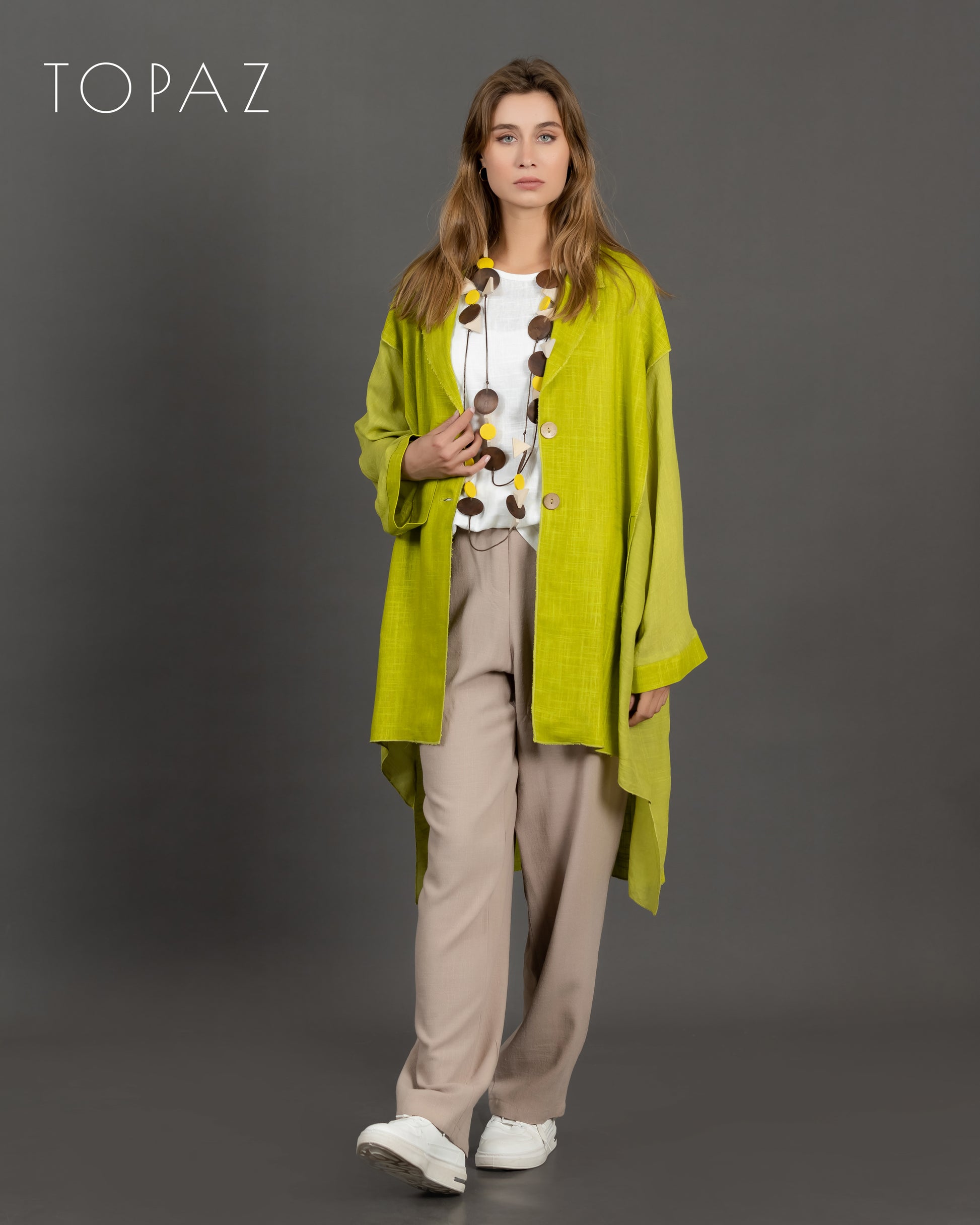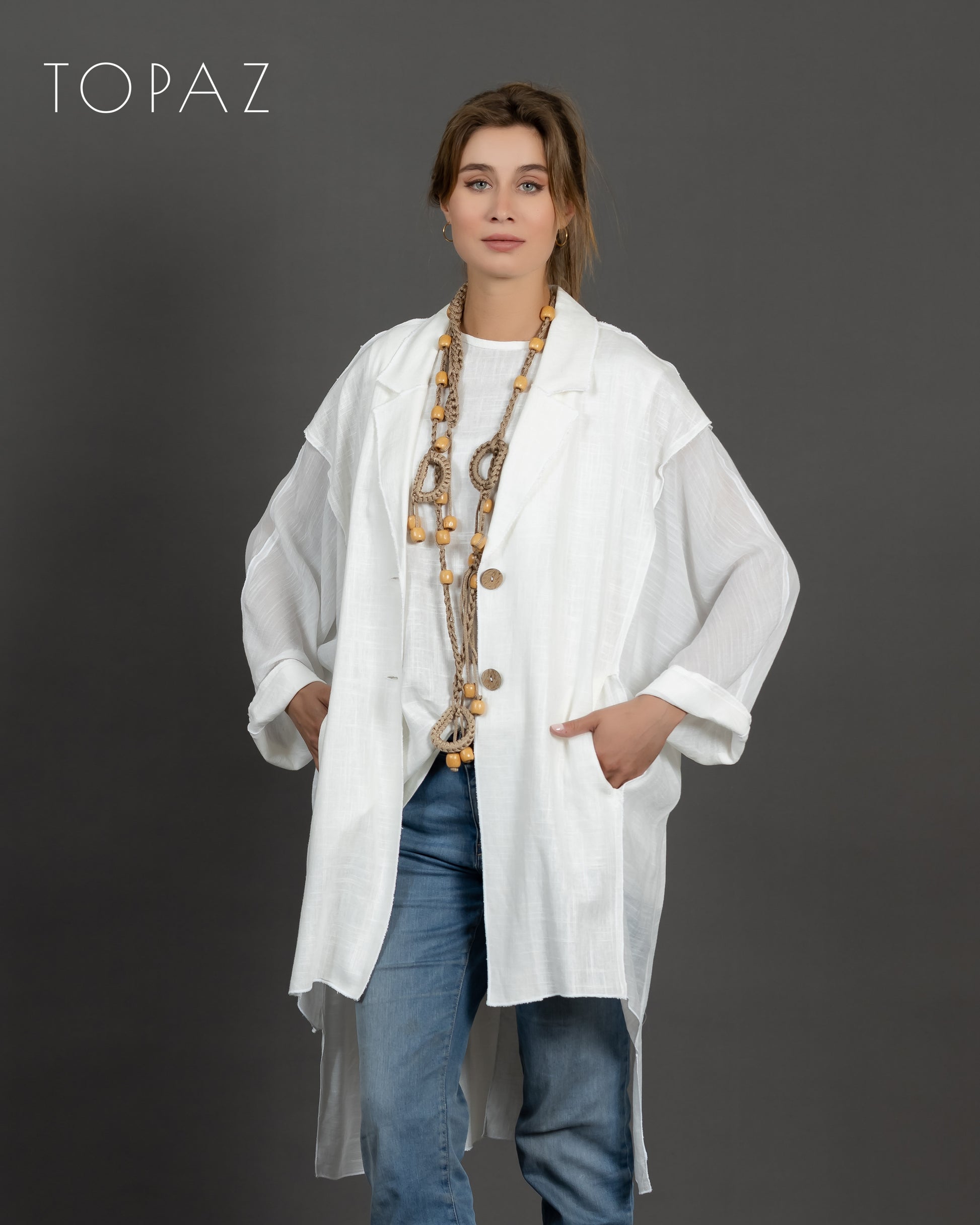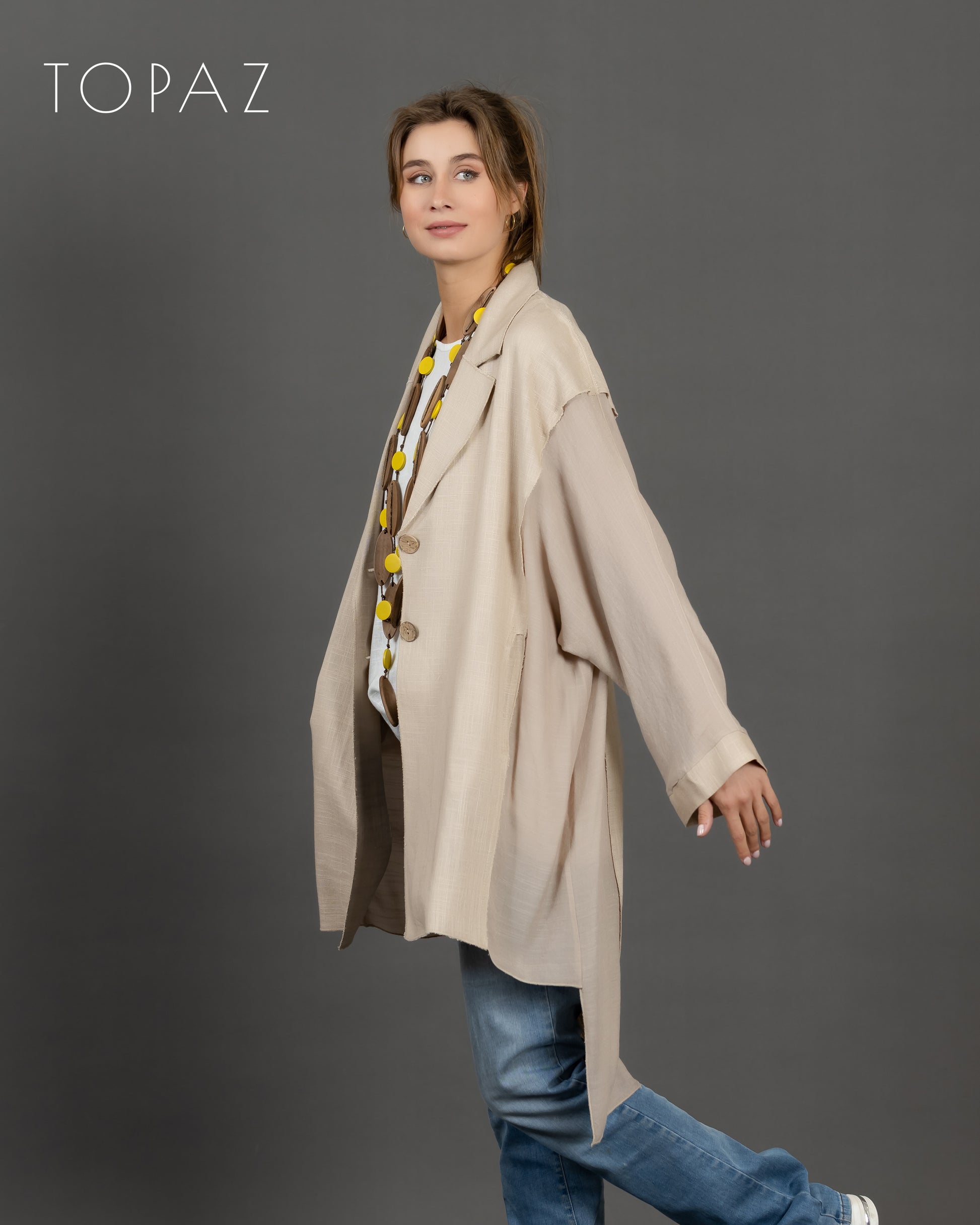 An imported linen fabric jacket featuring Voile side panels and wooden button detailing.