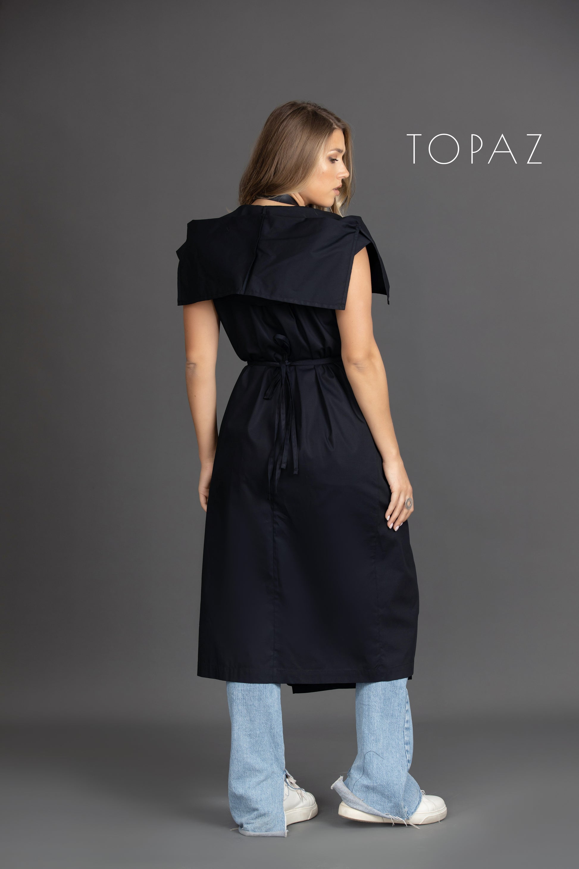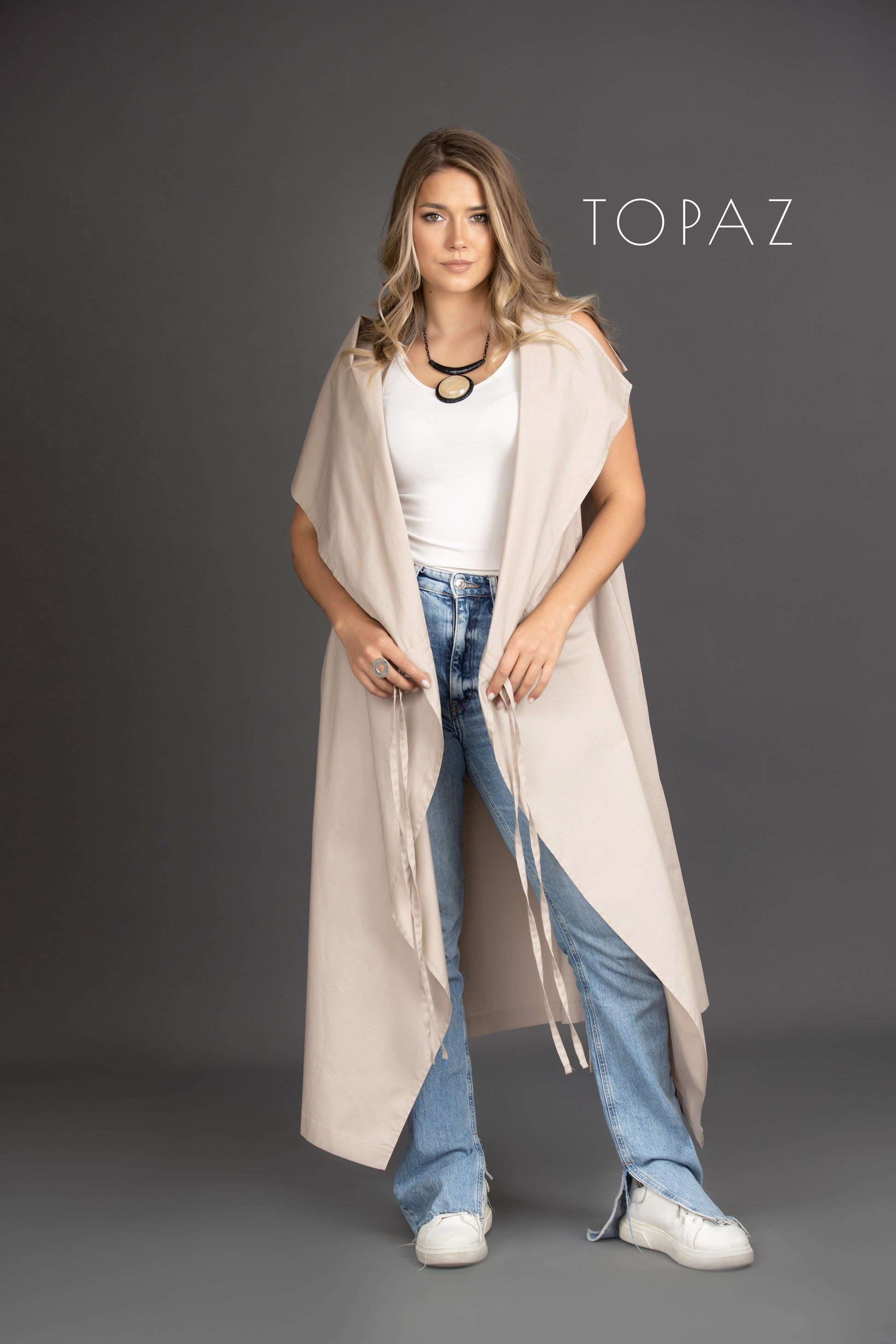 A long, poplin gilet with ties that could be crossed over, or worn without tying.