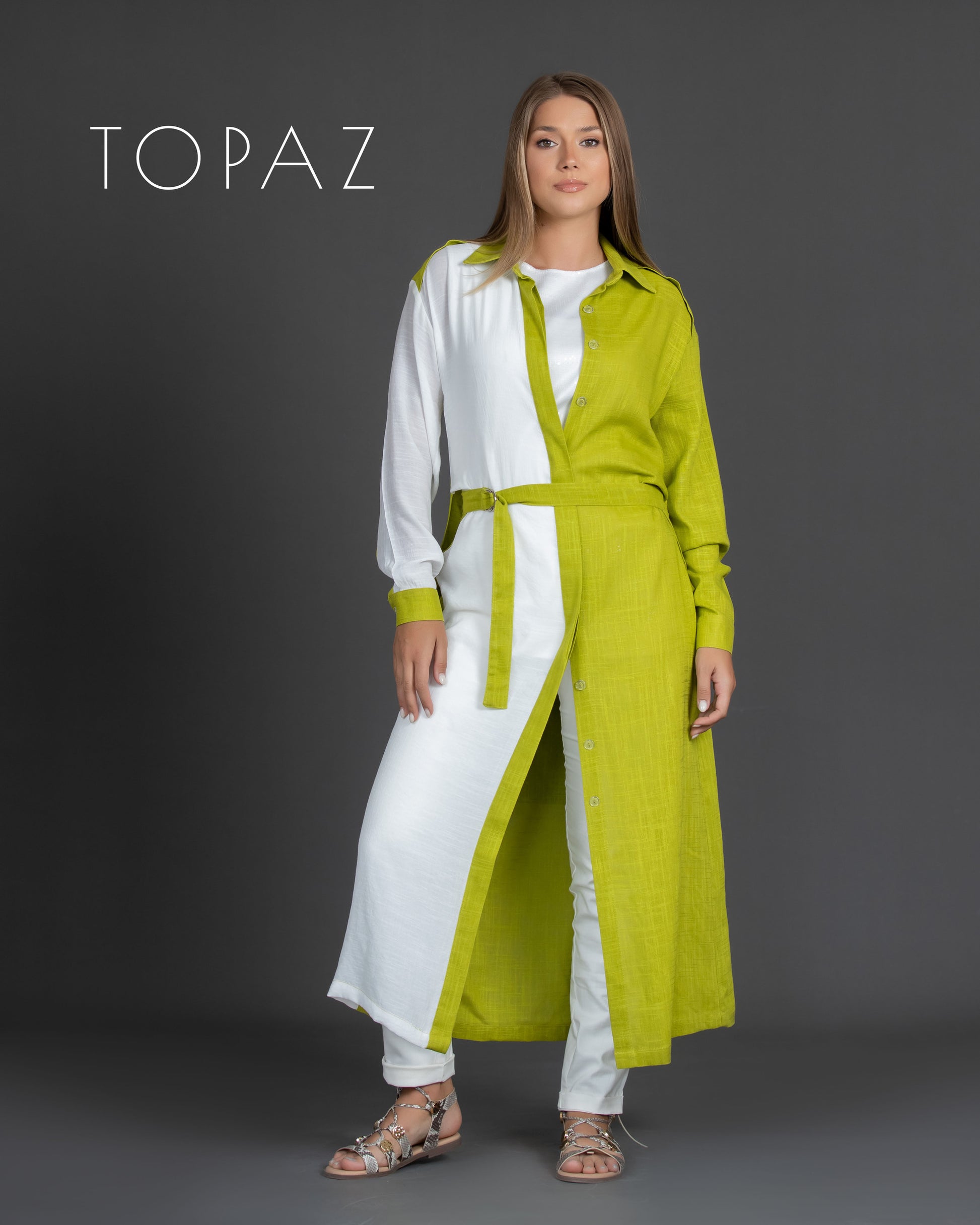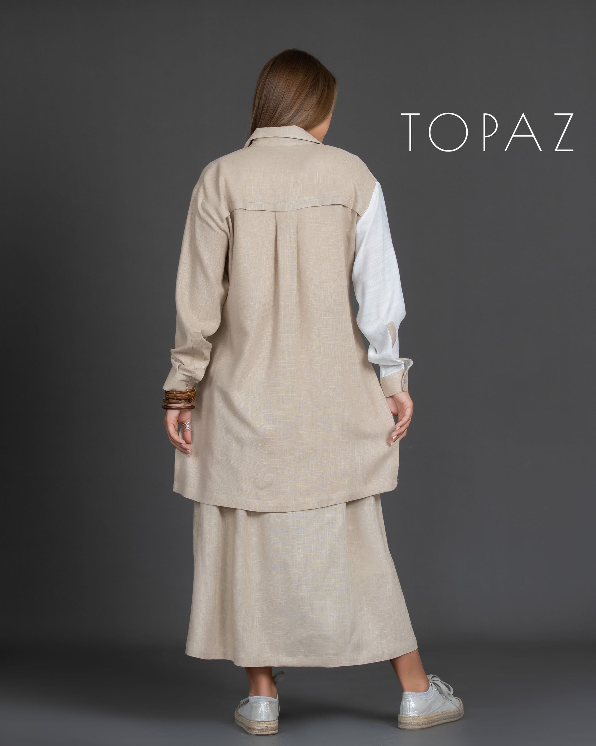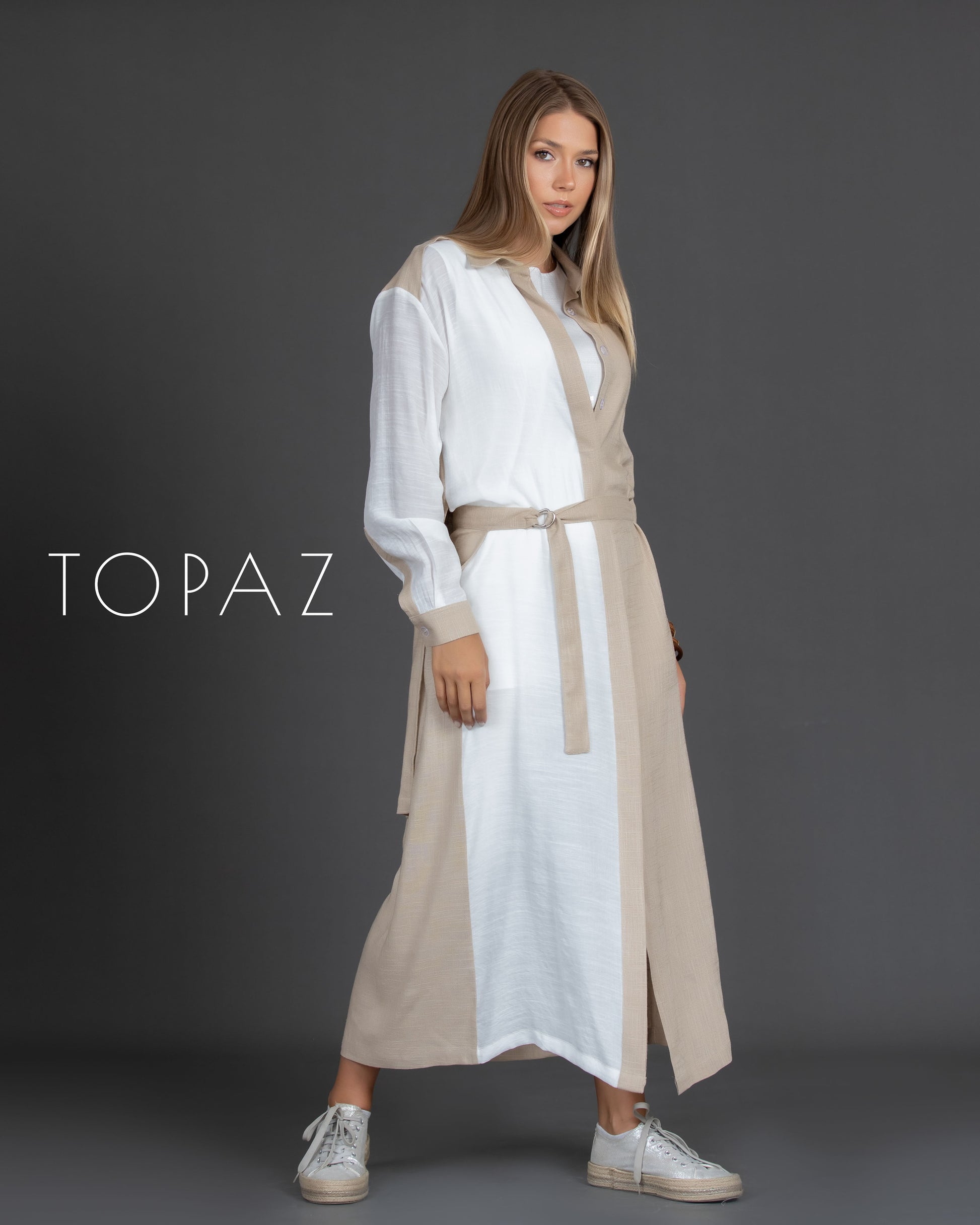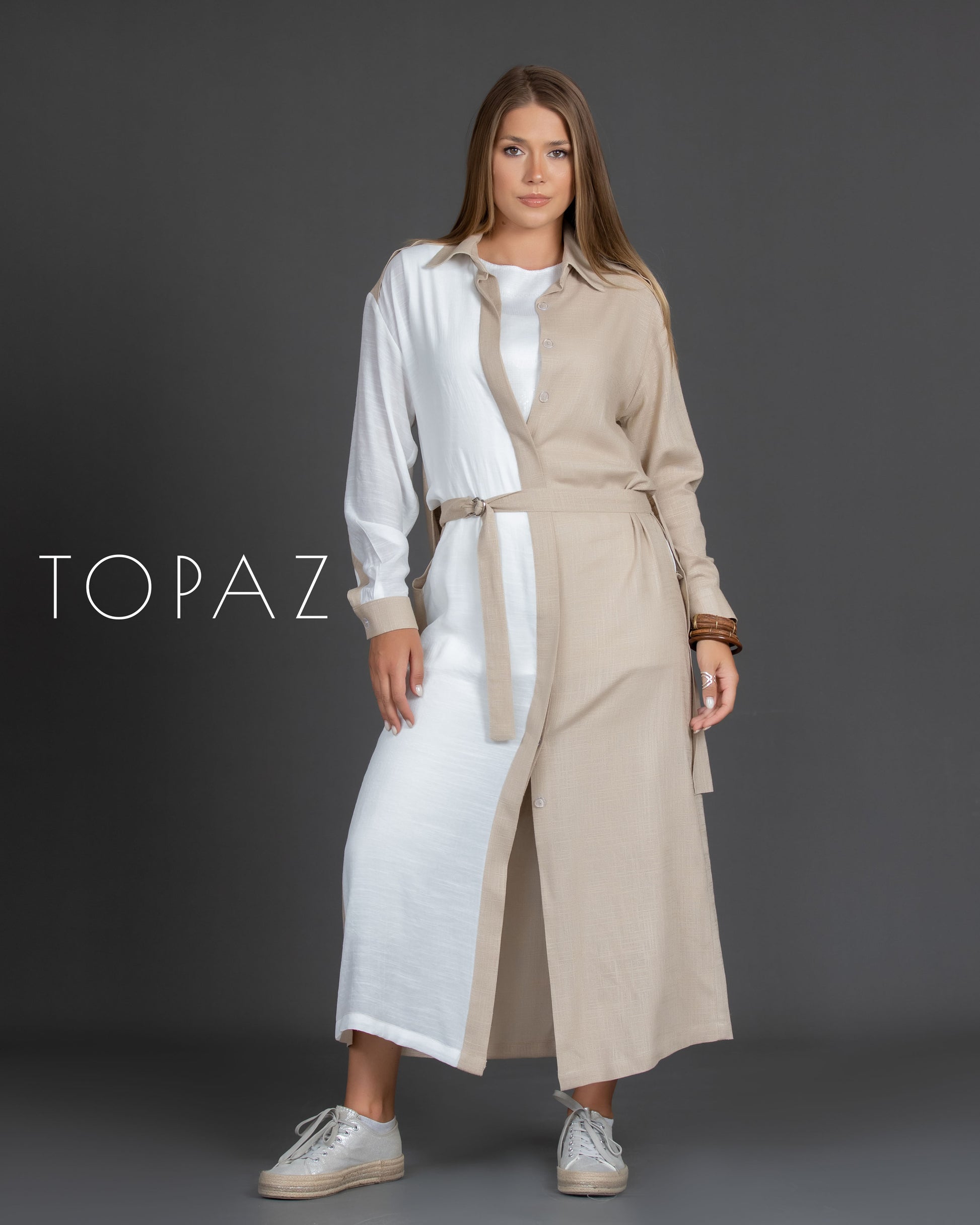 A multi-colored long dress featuring imported linen and voile fabrics.