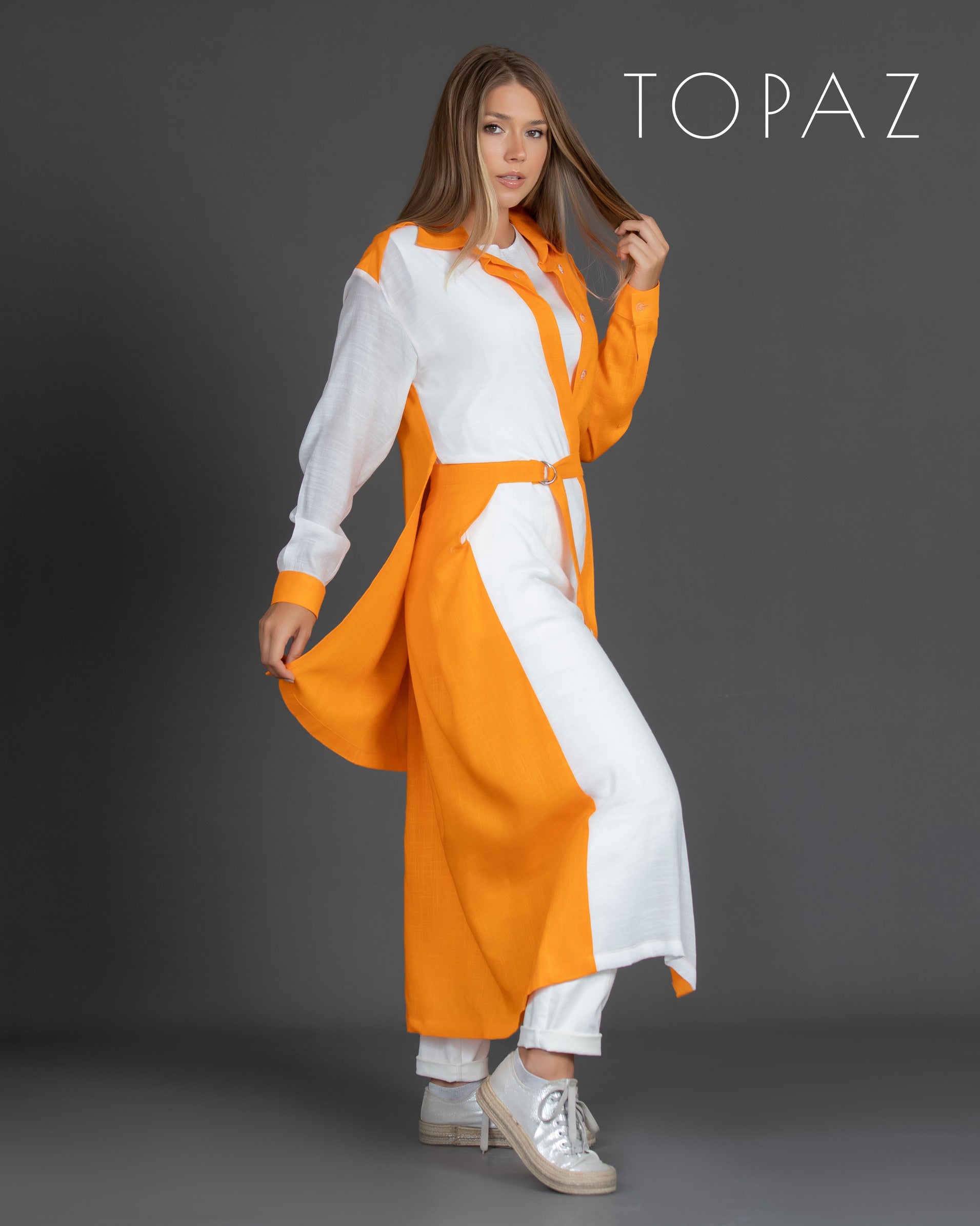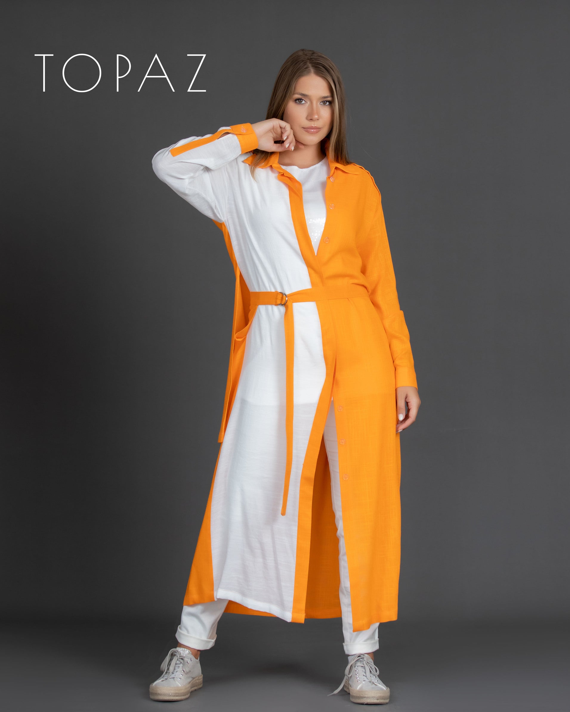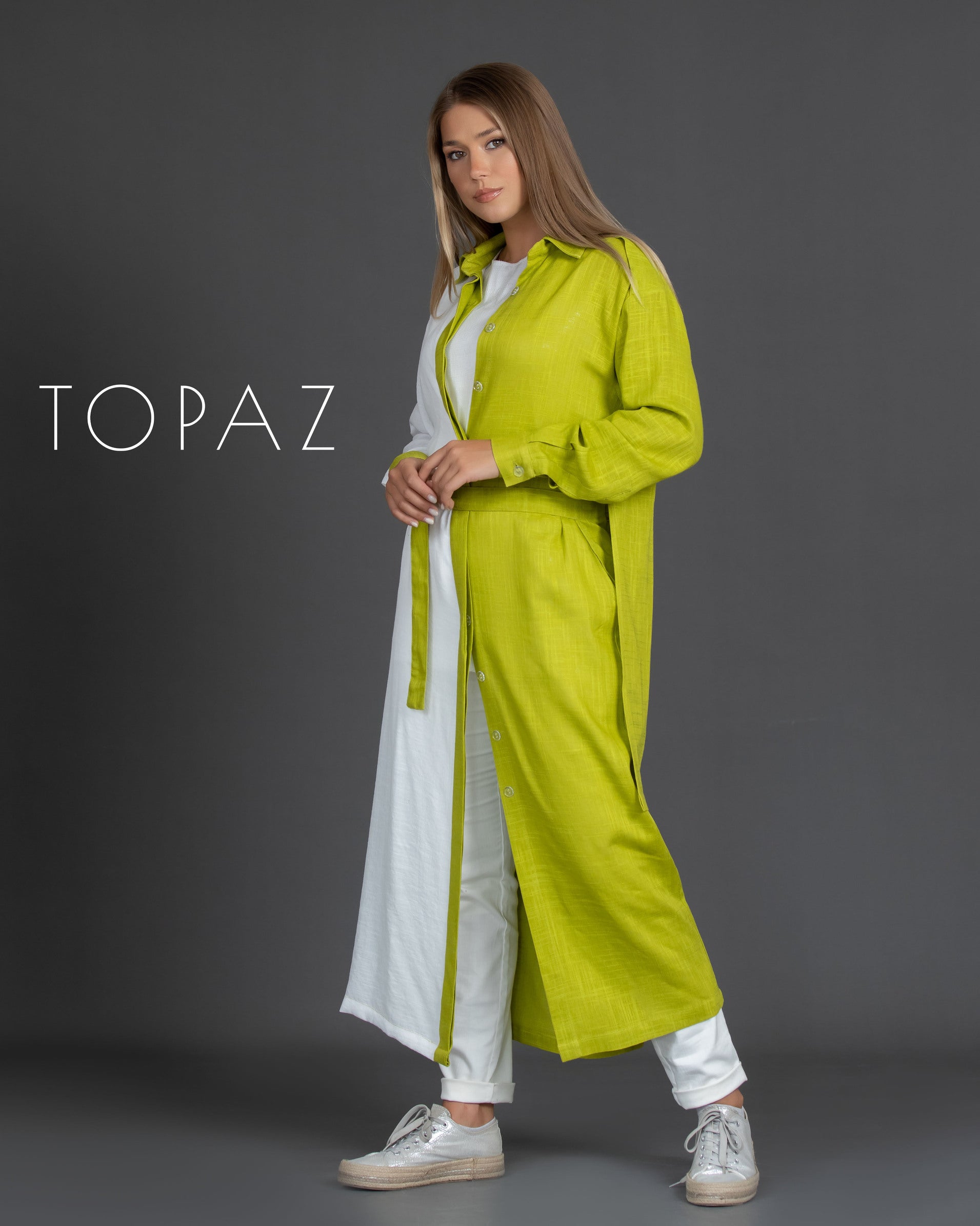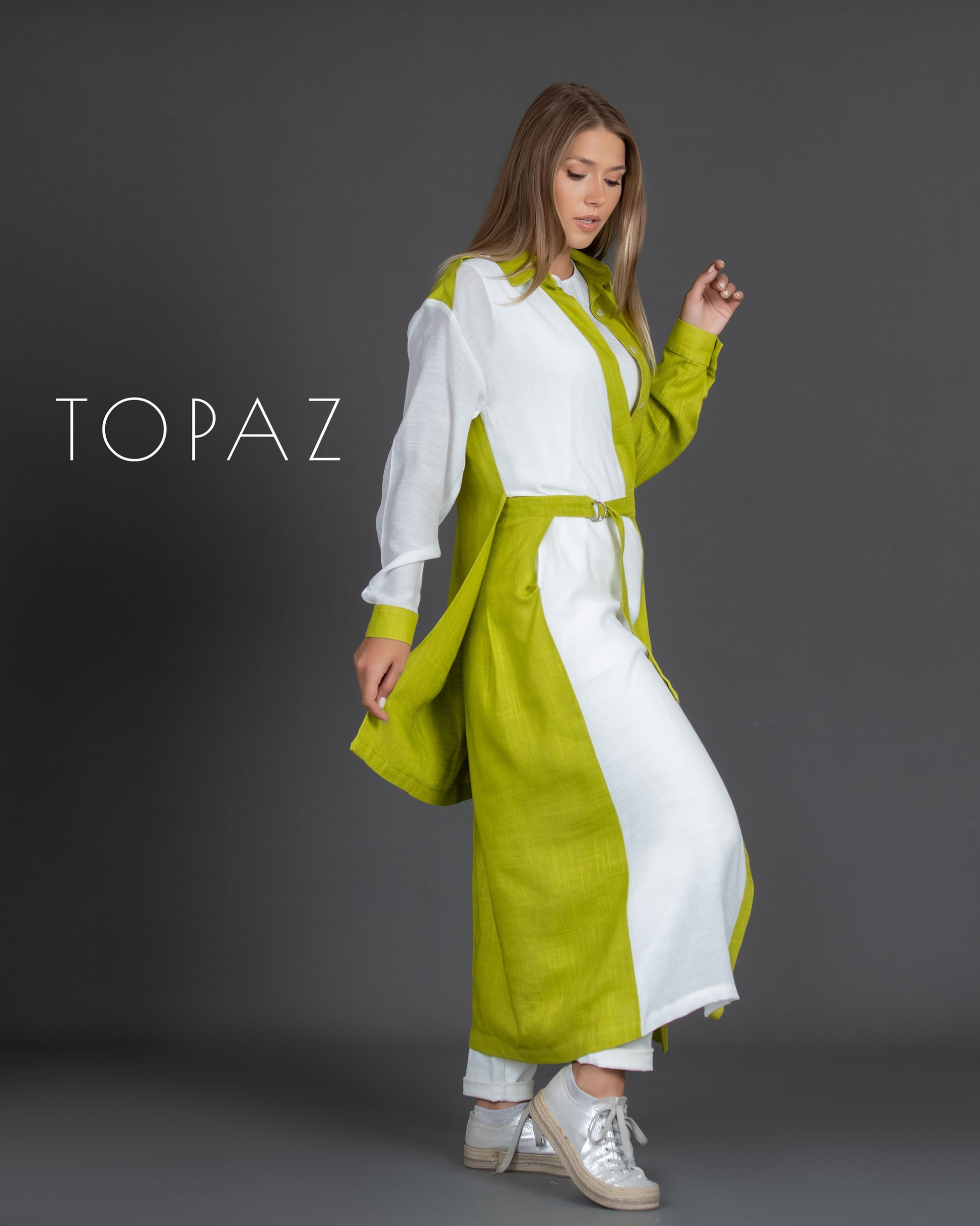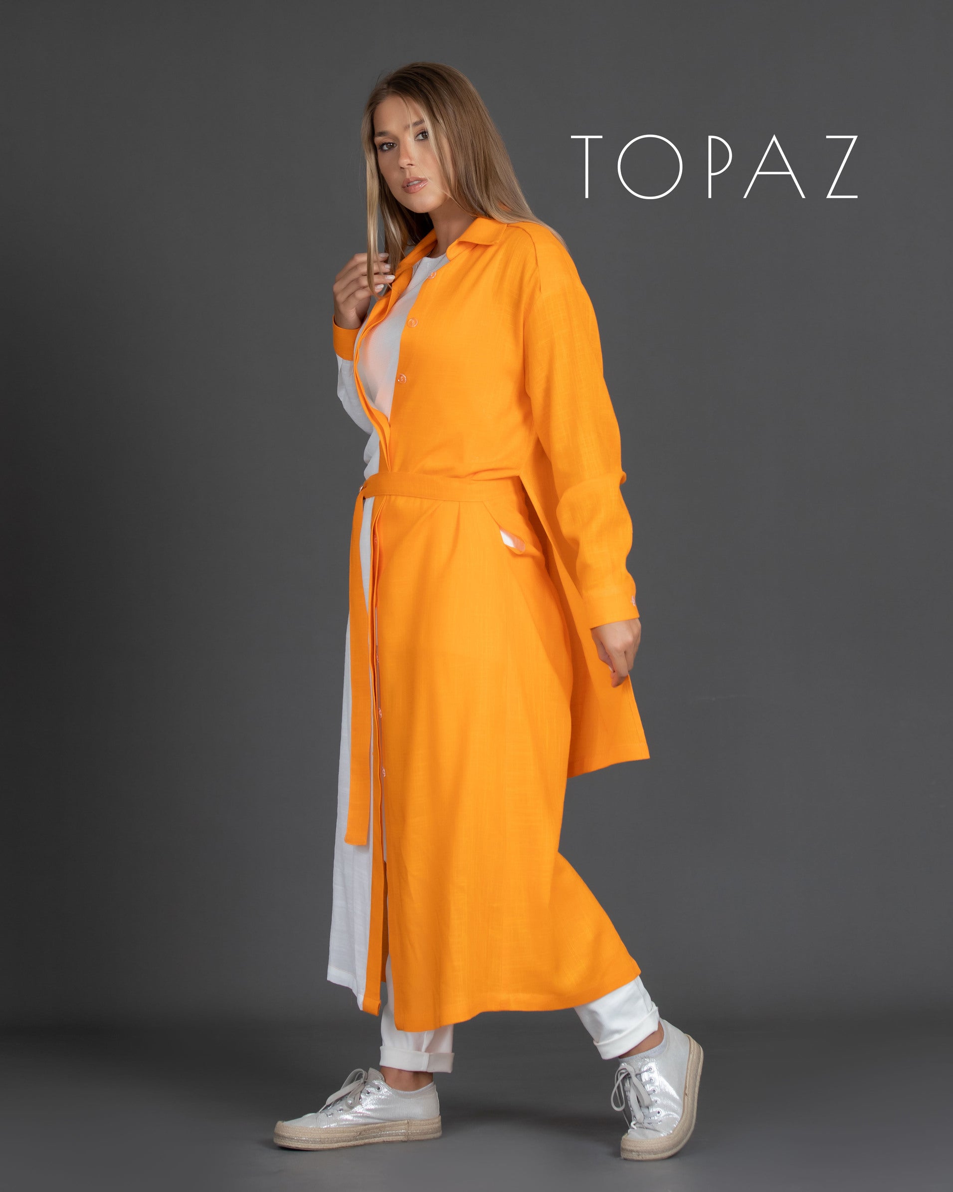 A multi-colored long dress featuring imported linen and voile fabrics.