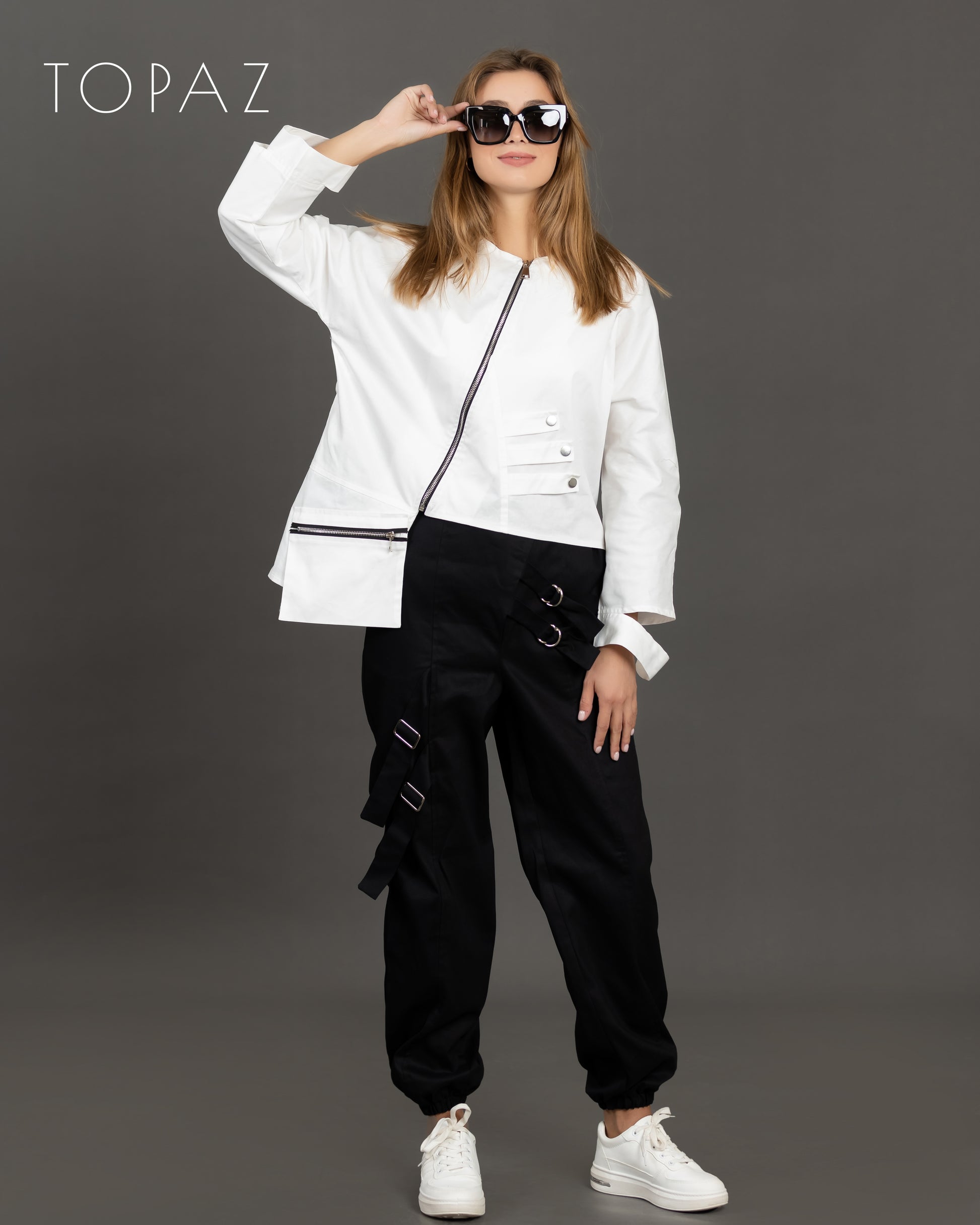 Pants featuring an imported Gabardine fabric, straps, and silver hardware.