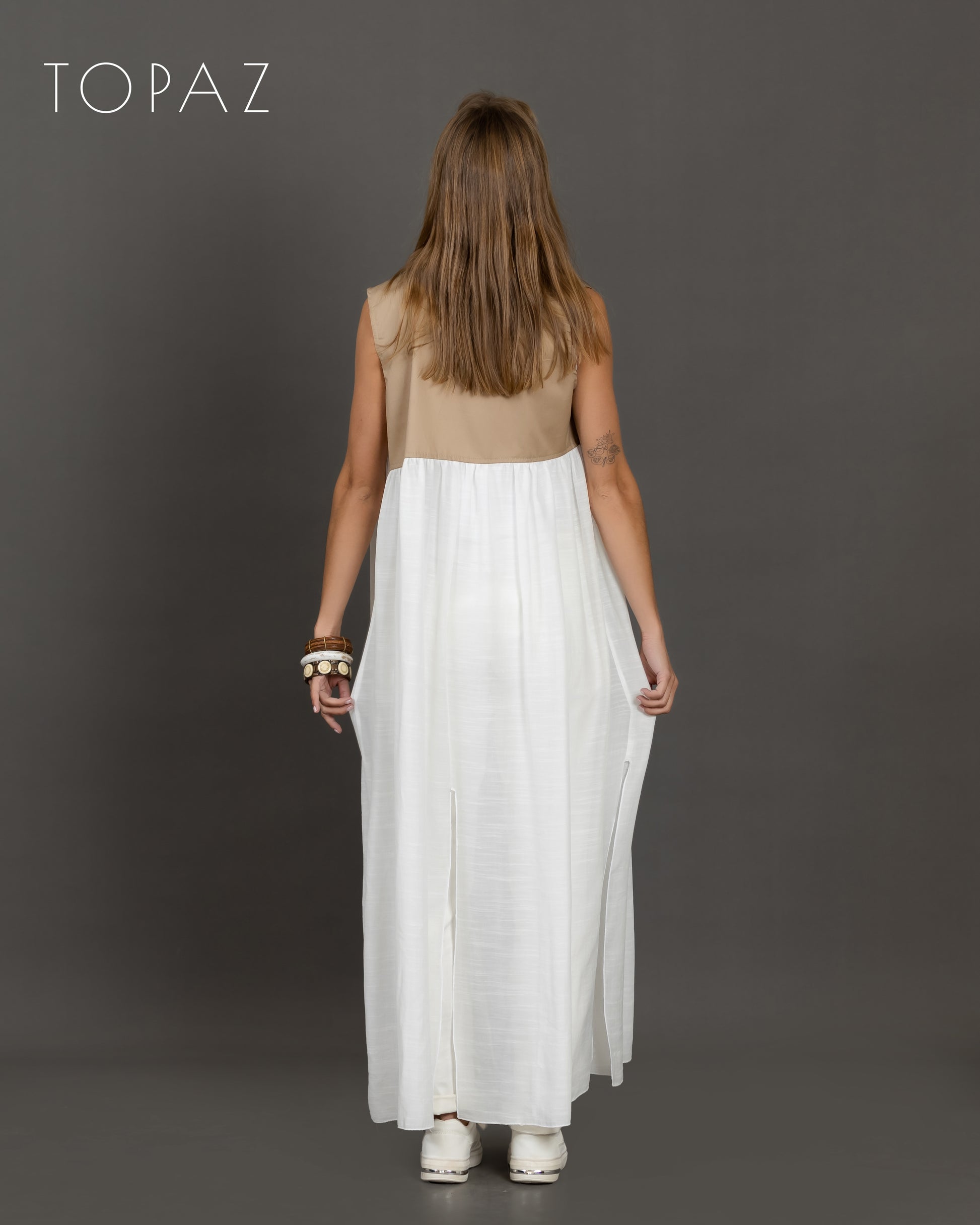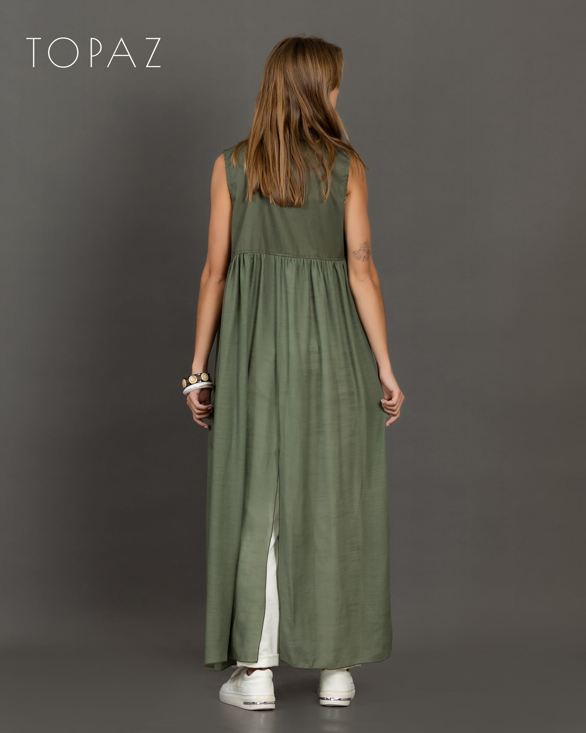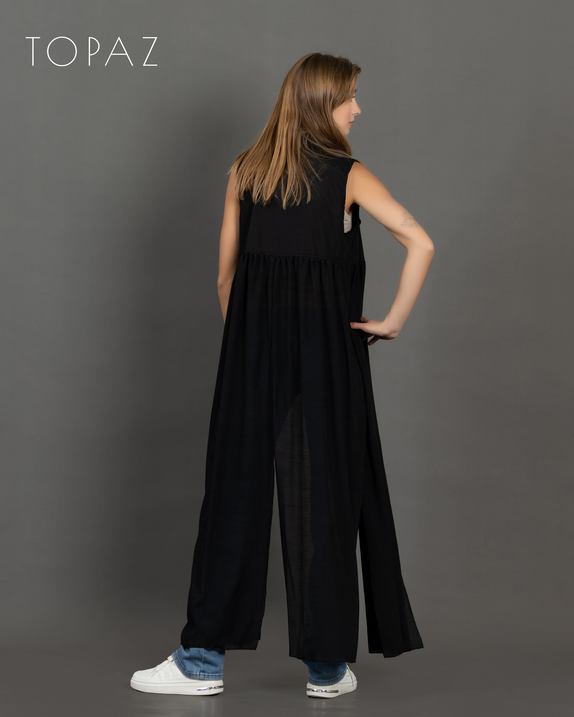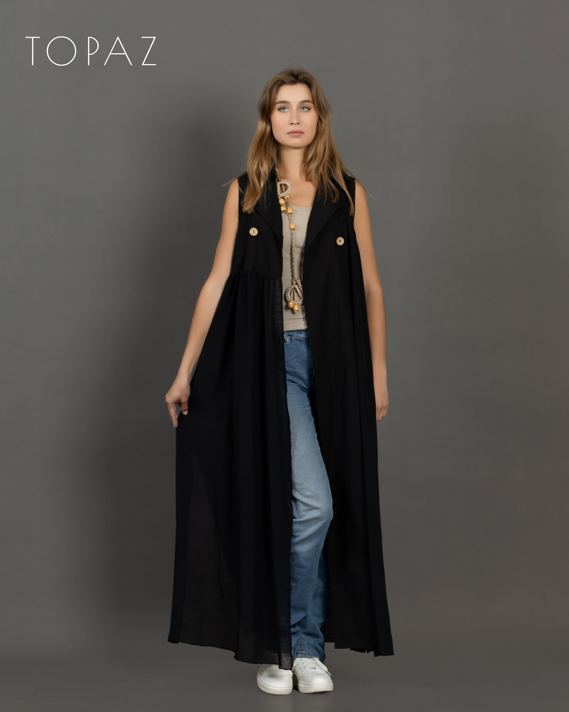 A long vest featuring an imported poplin fabric as well as voile detailing, and wooden buttons.