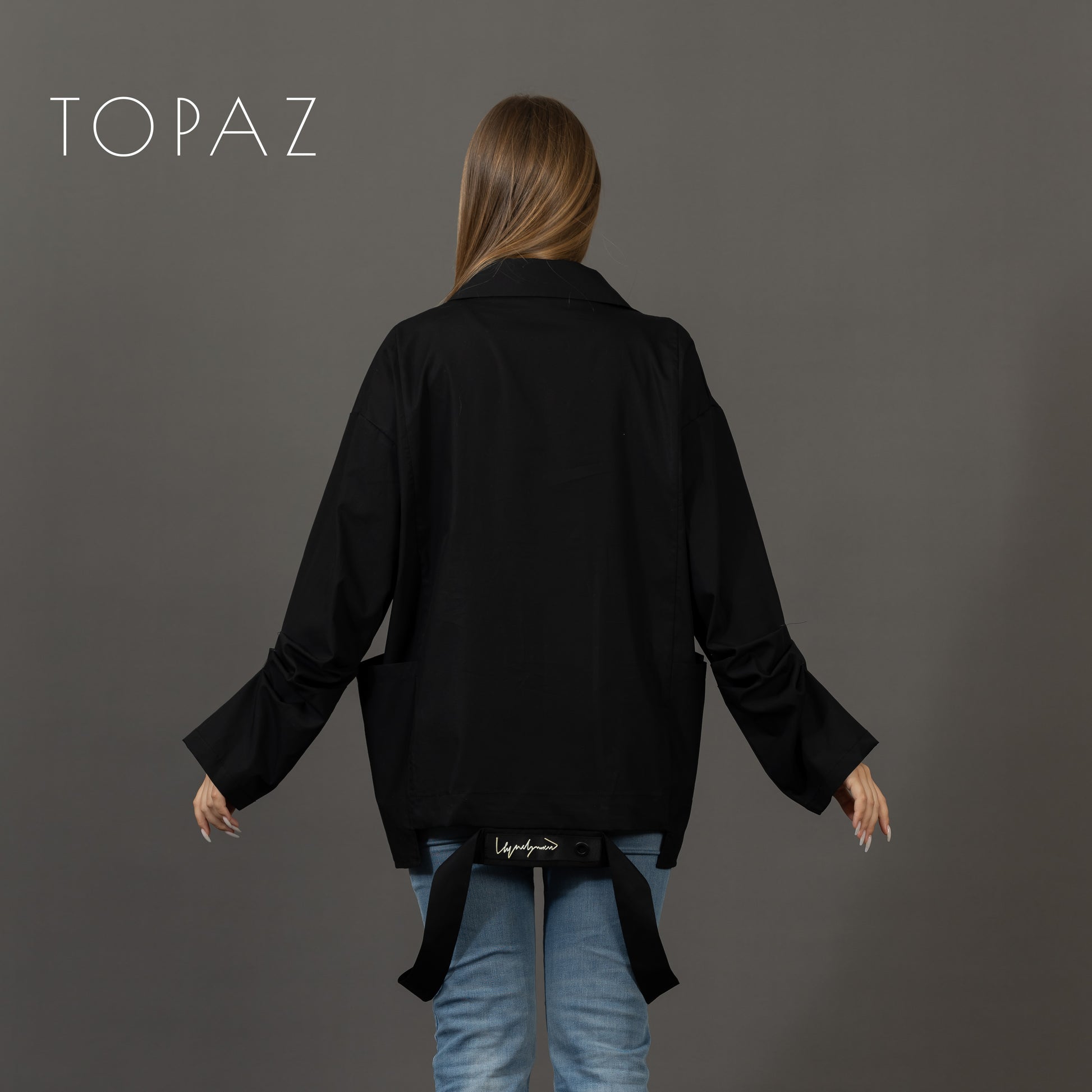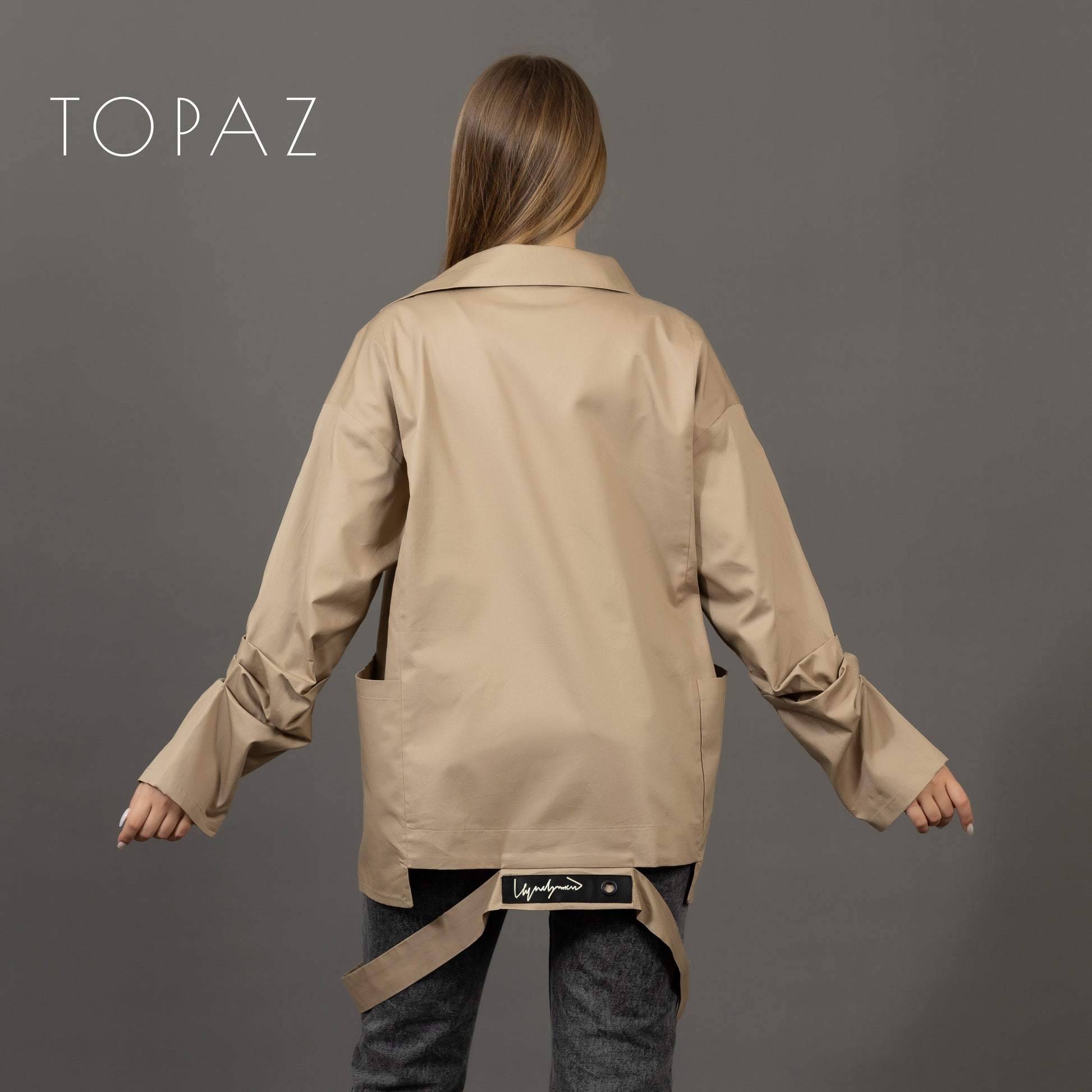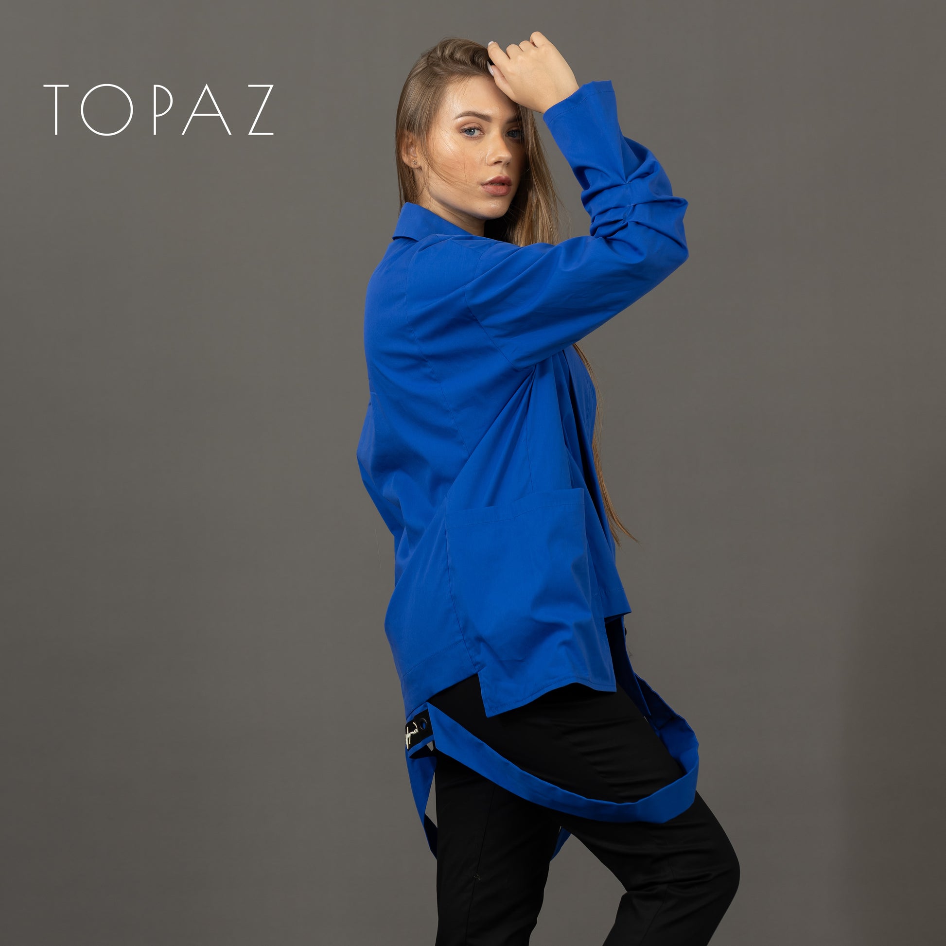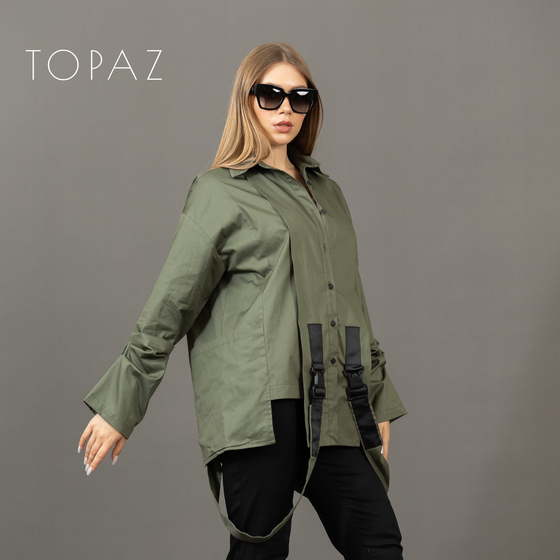 Shirt featuring an imported soft poplin fabric, and black buckles and straps.