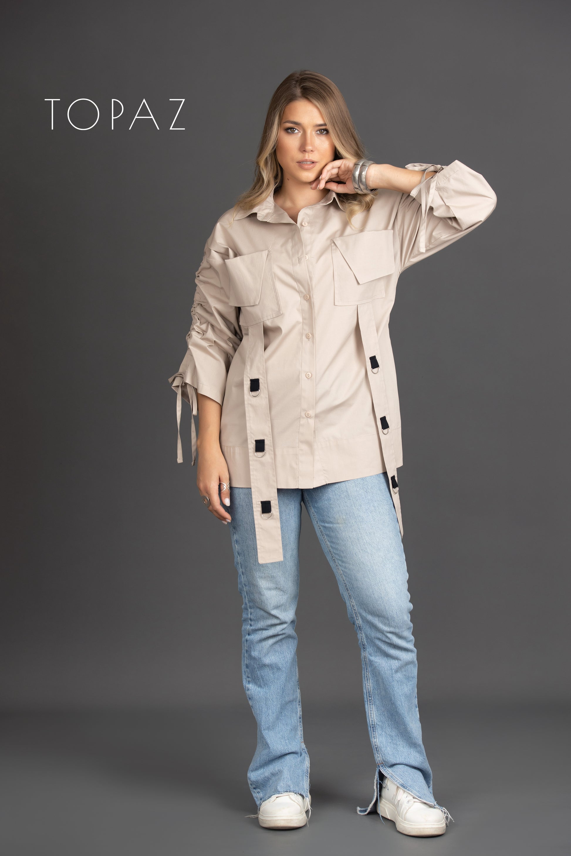 Your basic poplin shirt with a twist, featuring black straps and silver detailing.