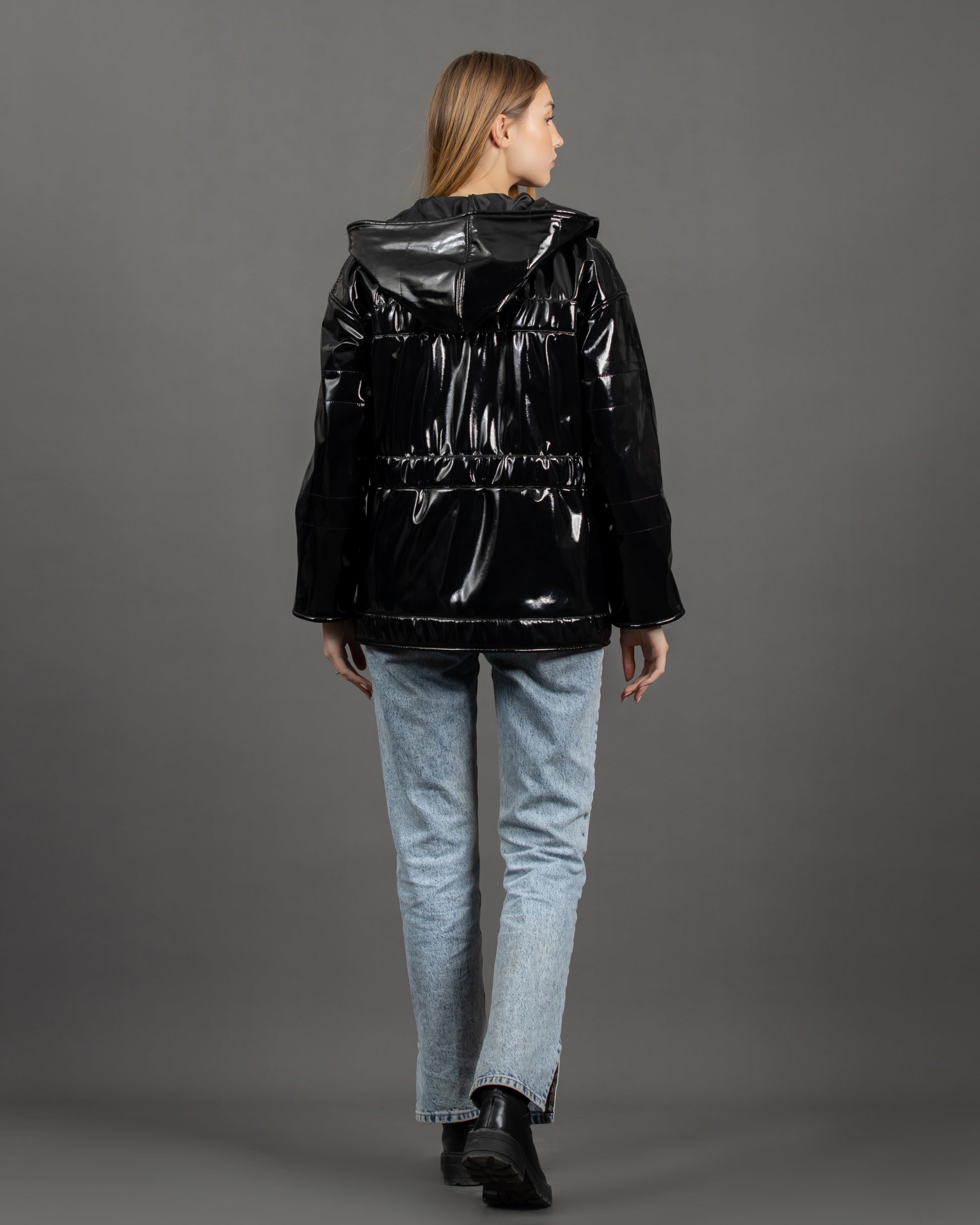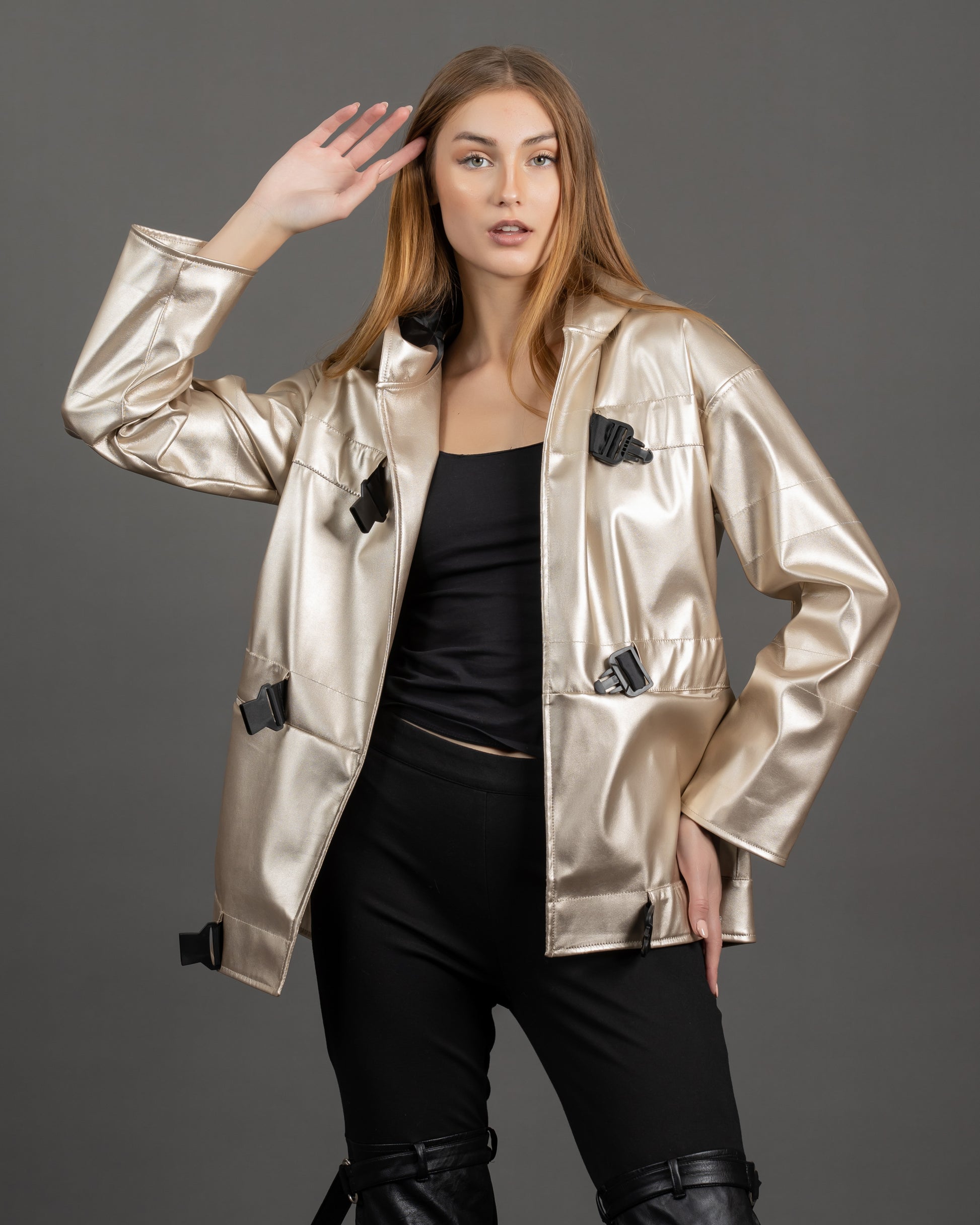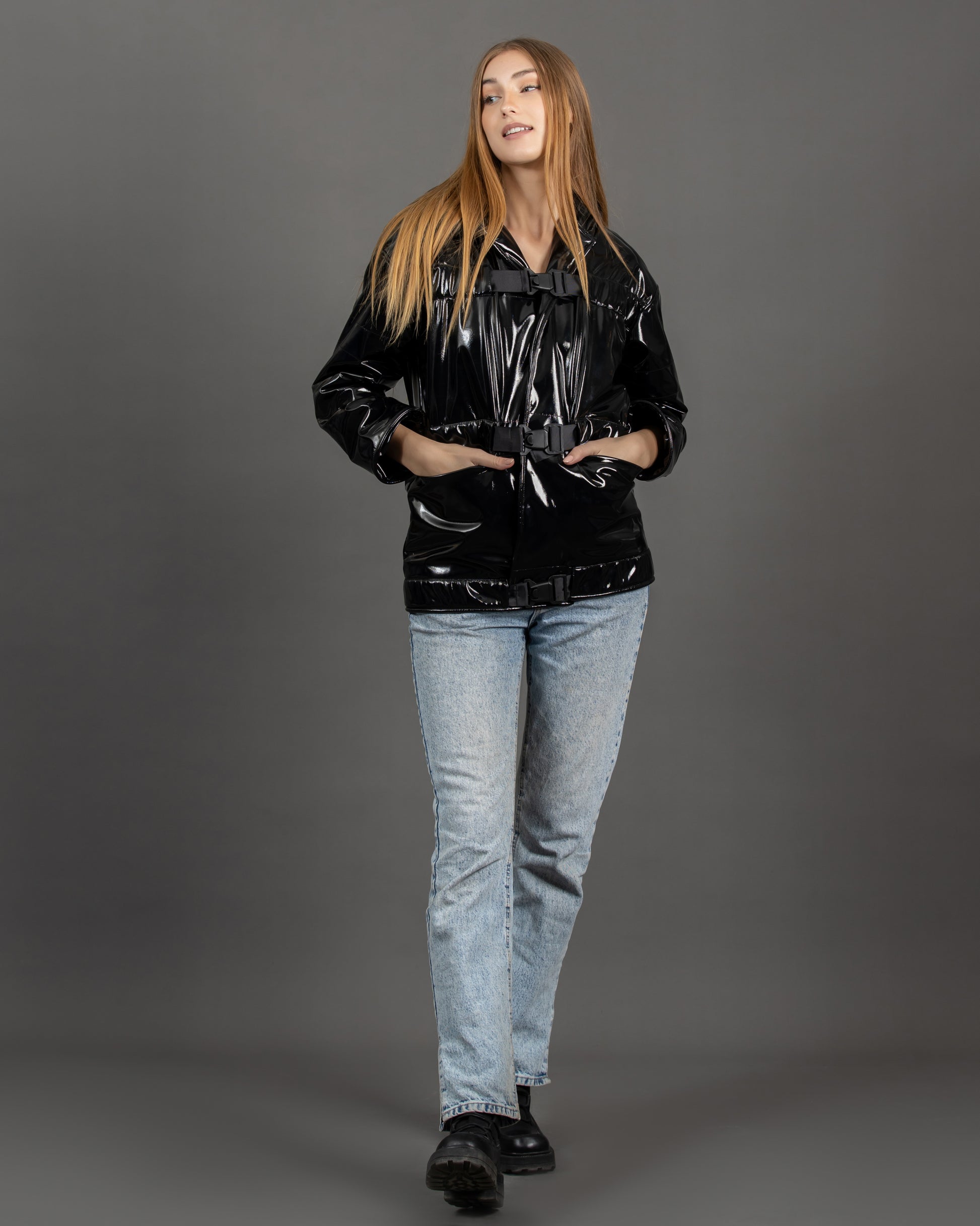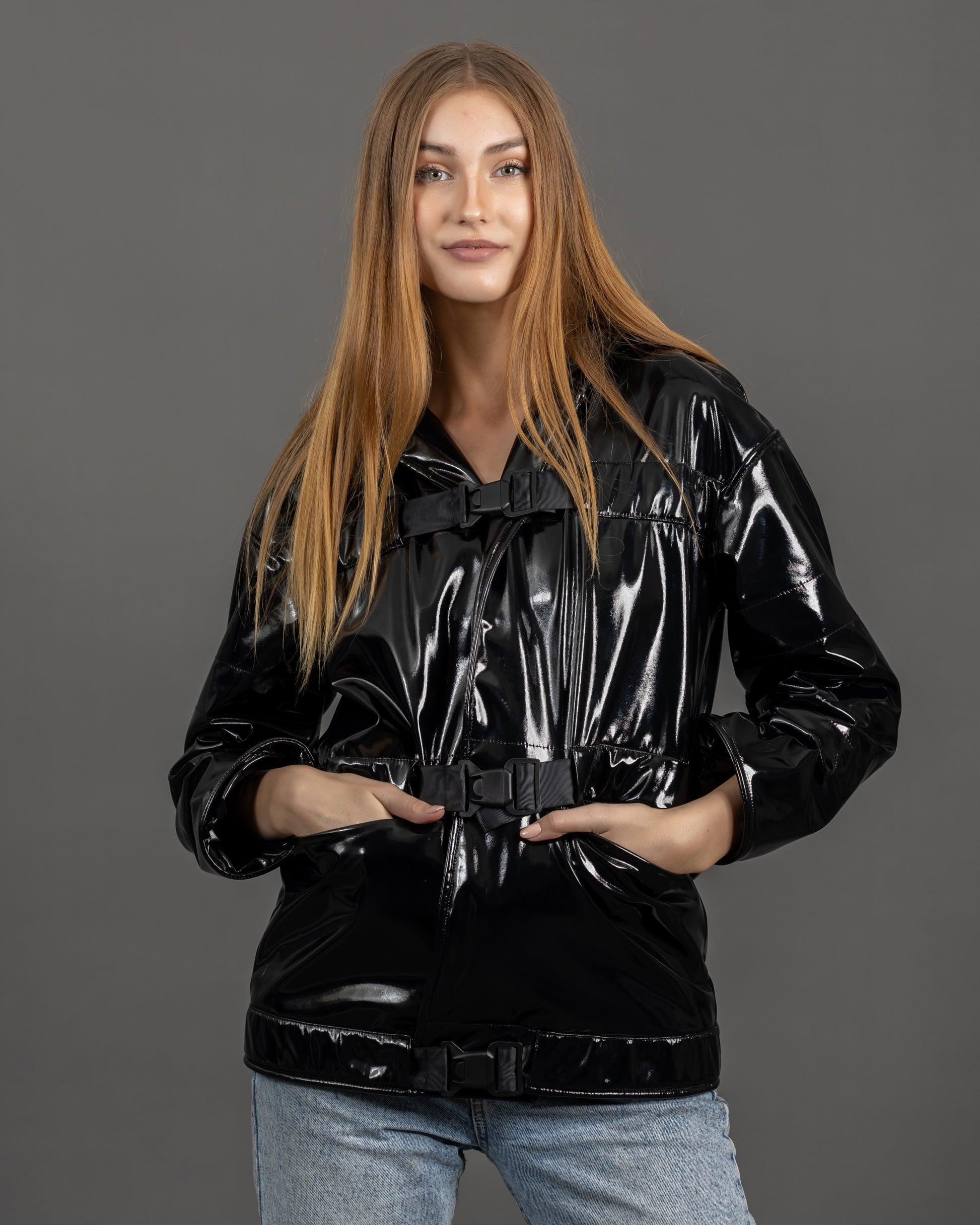 Jacket featuring imported patent-leather fabric, and front buckles.