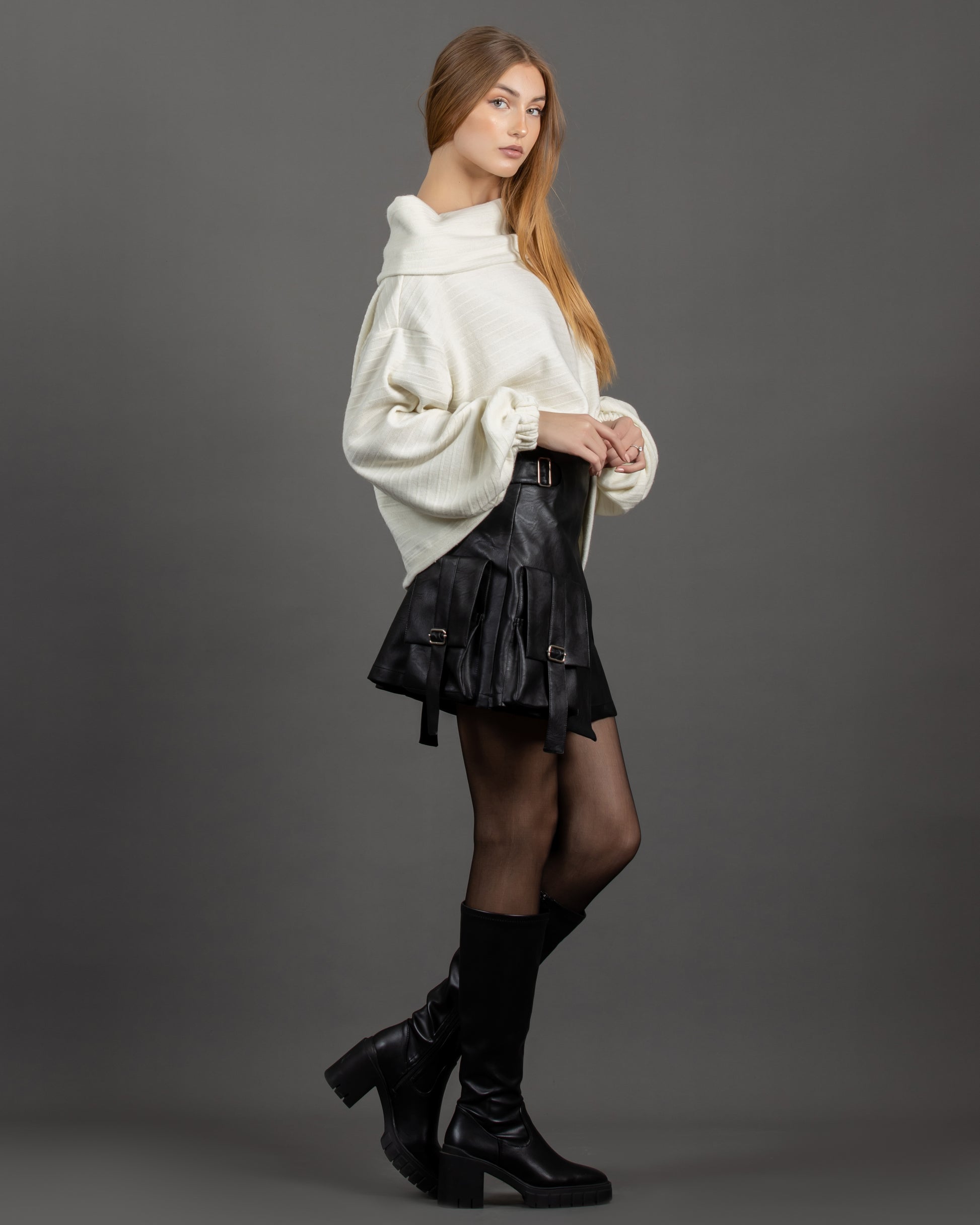 Miniskirt featuring an imported faux-leather fabric, pockets, and silver hardware.