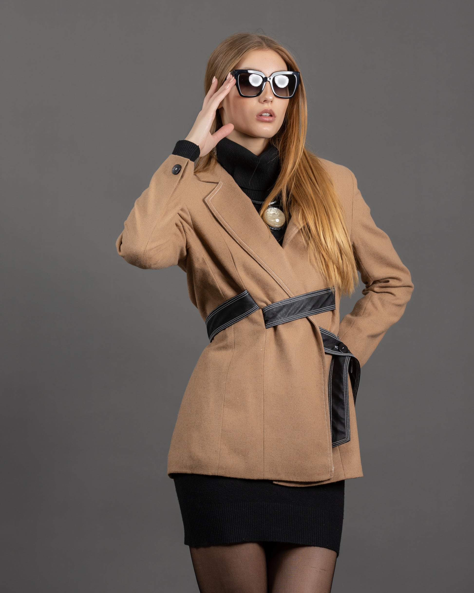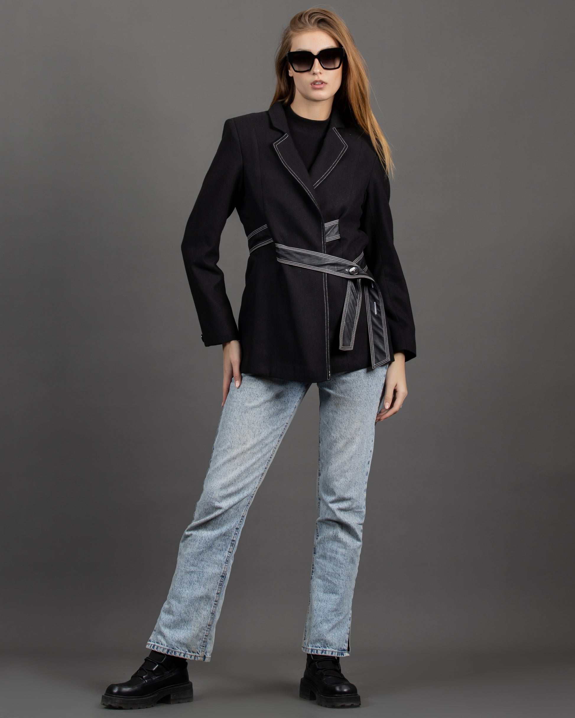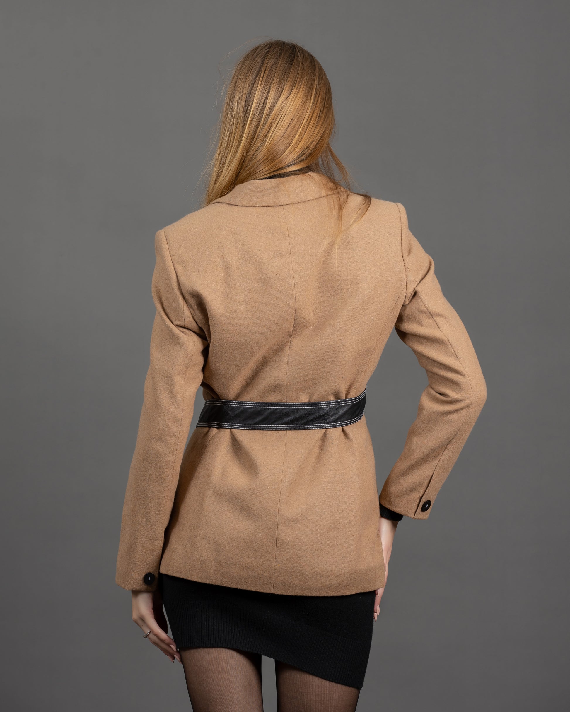 Blazer featuring a premium, imported soft wool material, and leather belt at the waist.