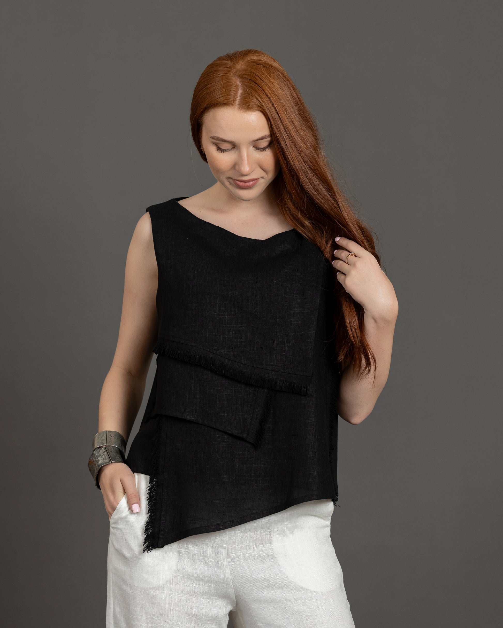 A sleeveless top featuring fringe detailing and an imported soft linen fabric.