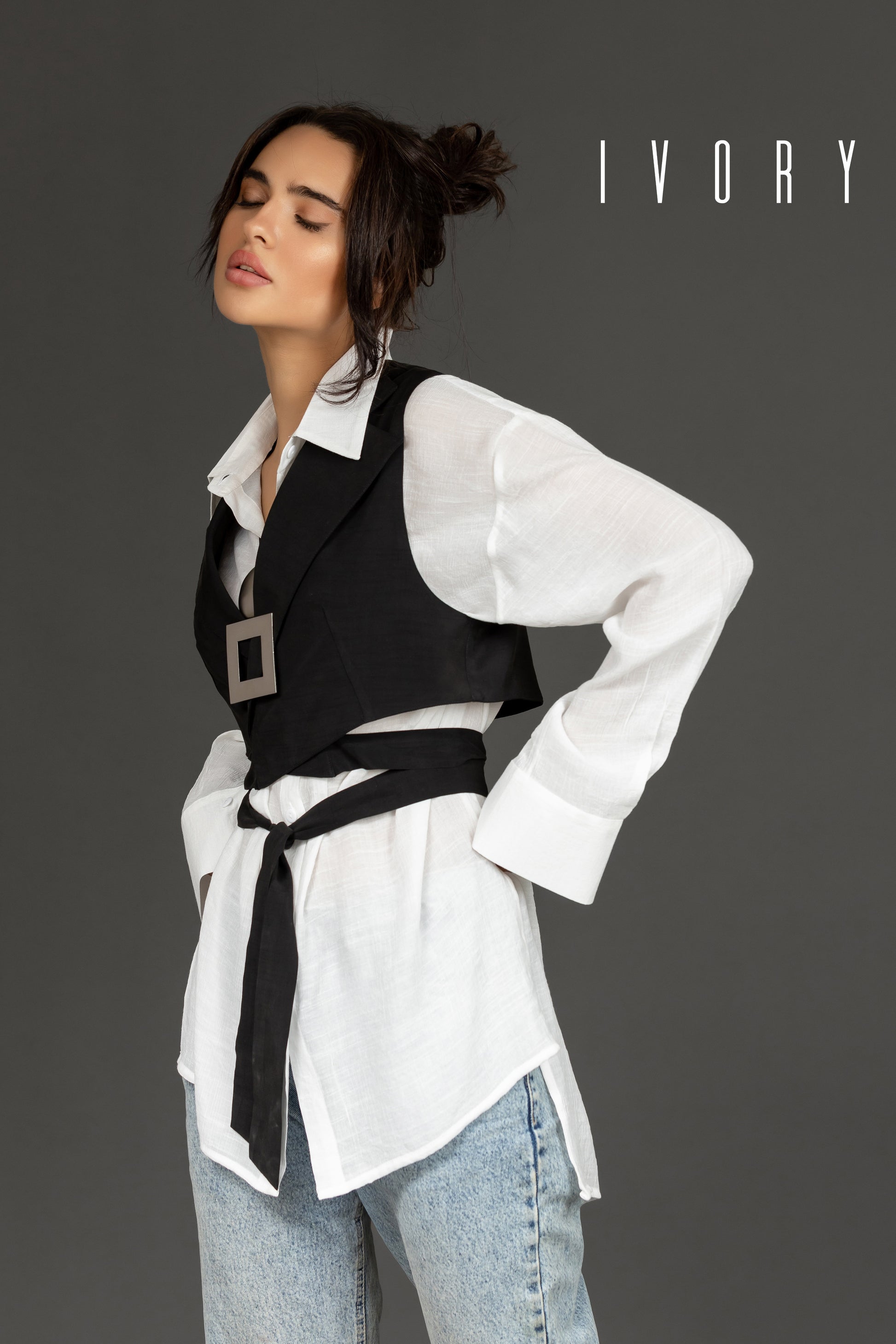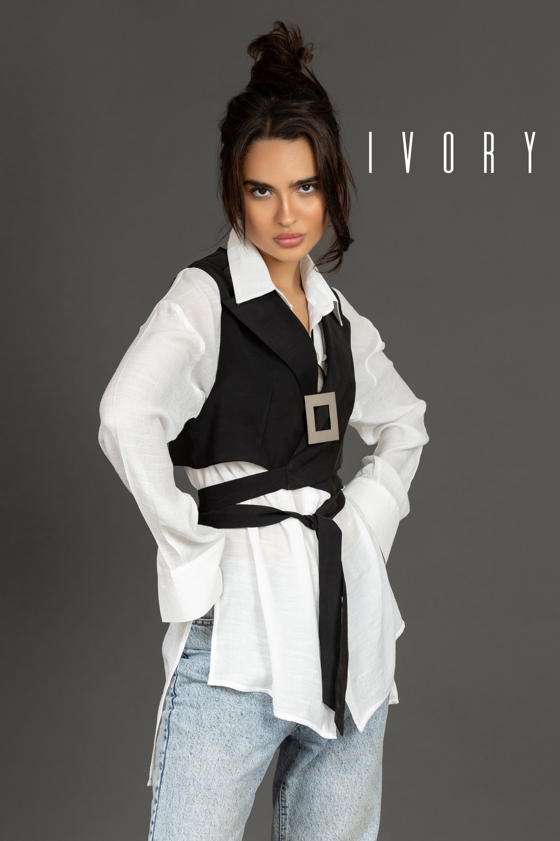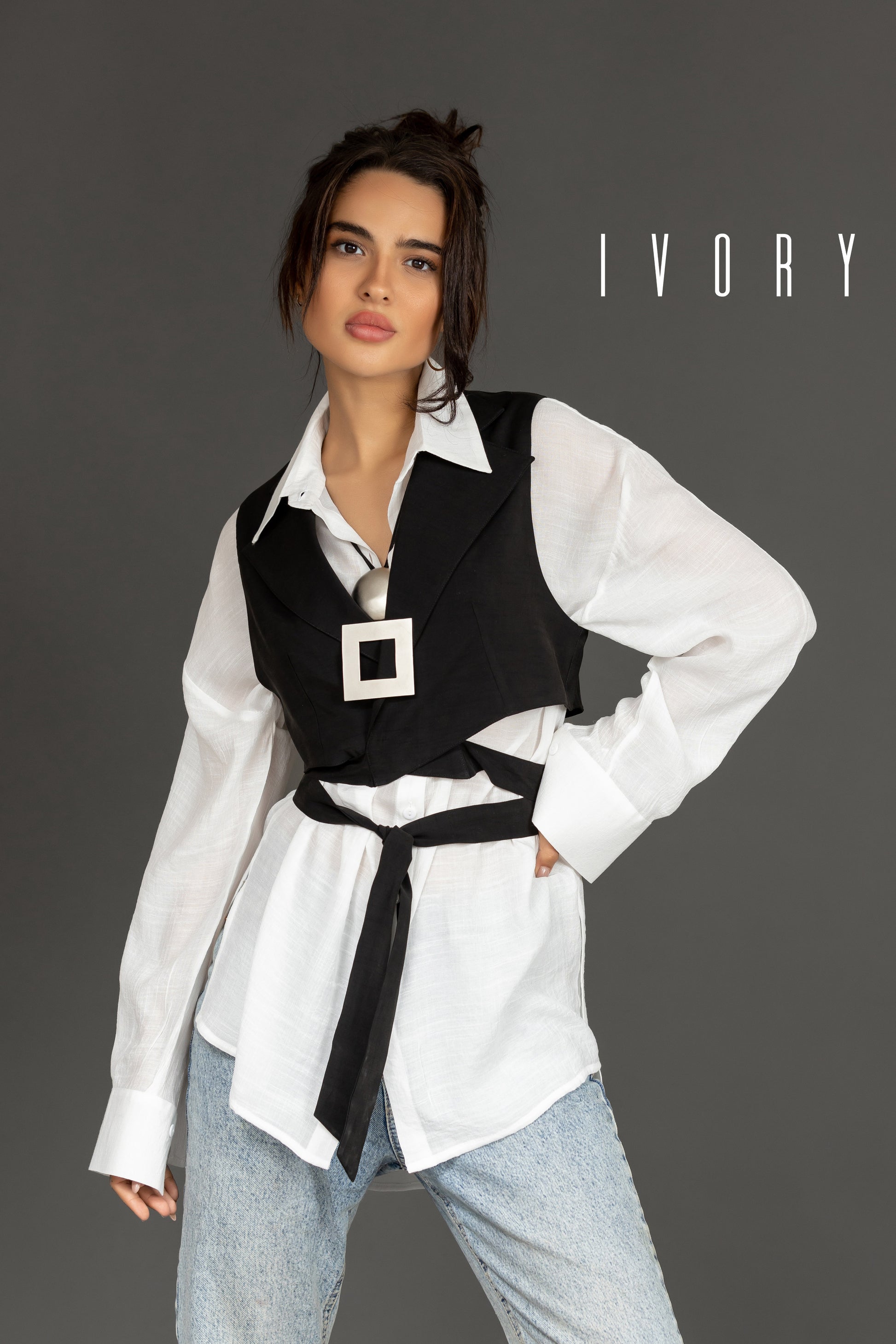 A cropped vest featuring a long tie that wraps around the waist.