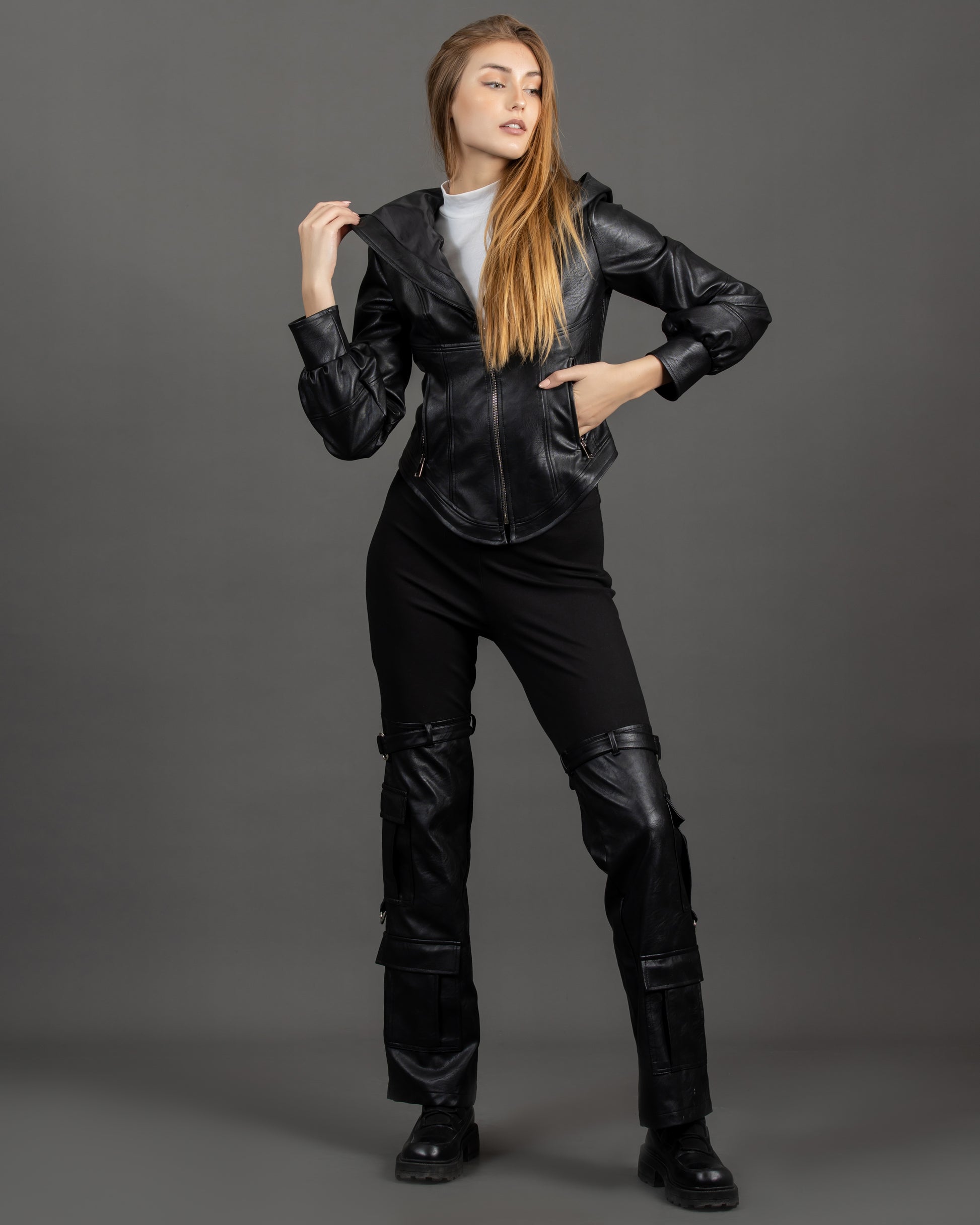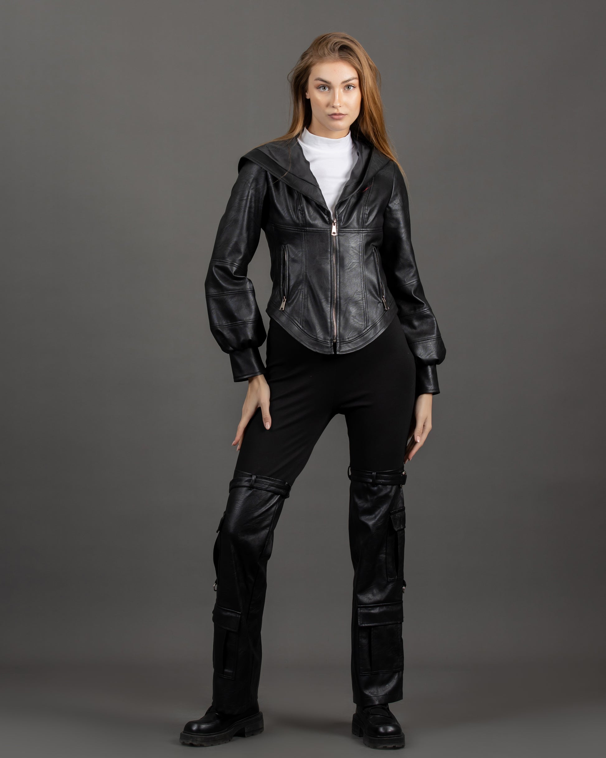 Jacket with corset-like body, featuring an imported faux-leather fabric and a hood.