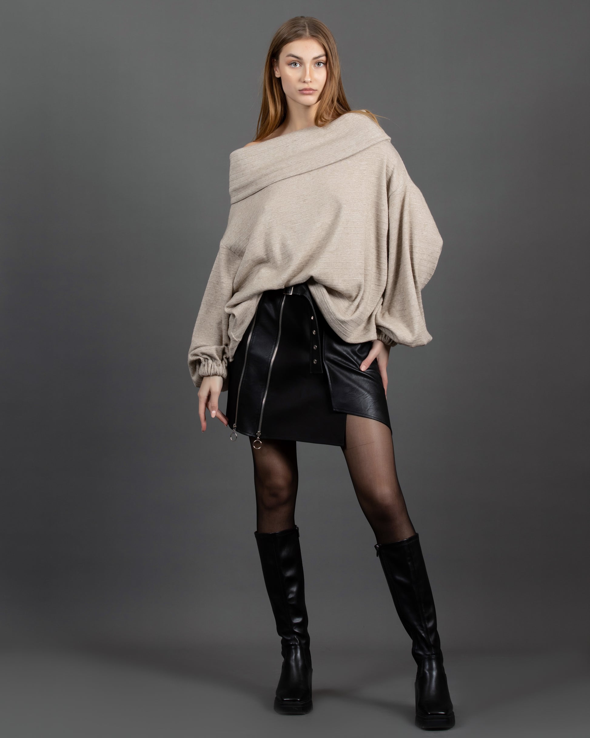 Miniskirt featuring layers, leather paneling and silver front zippers.