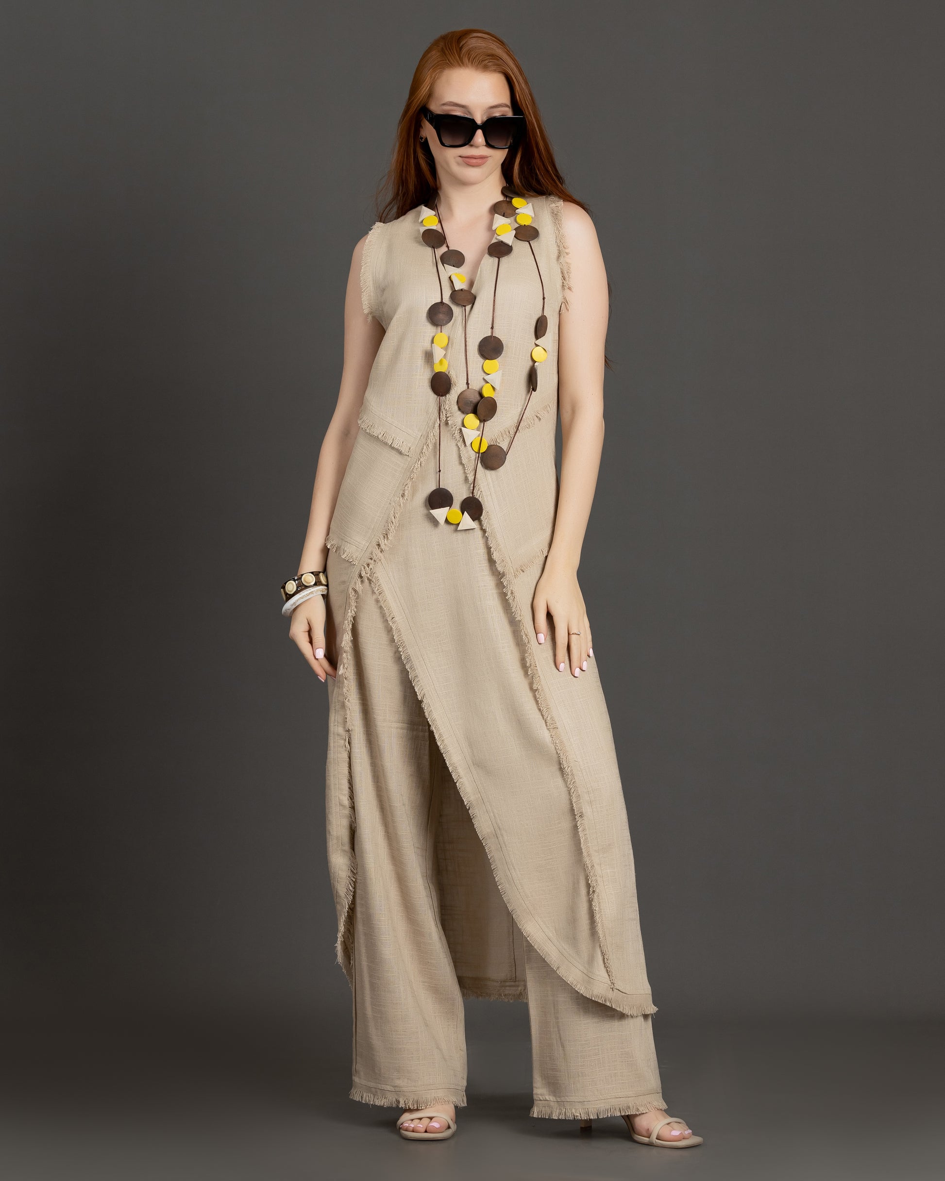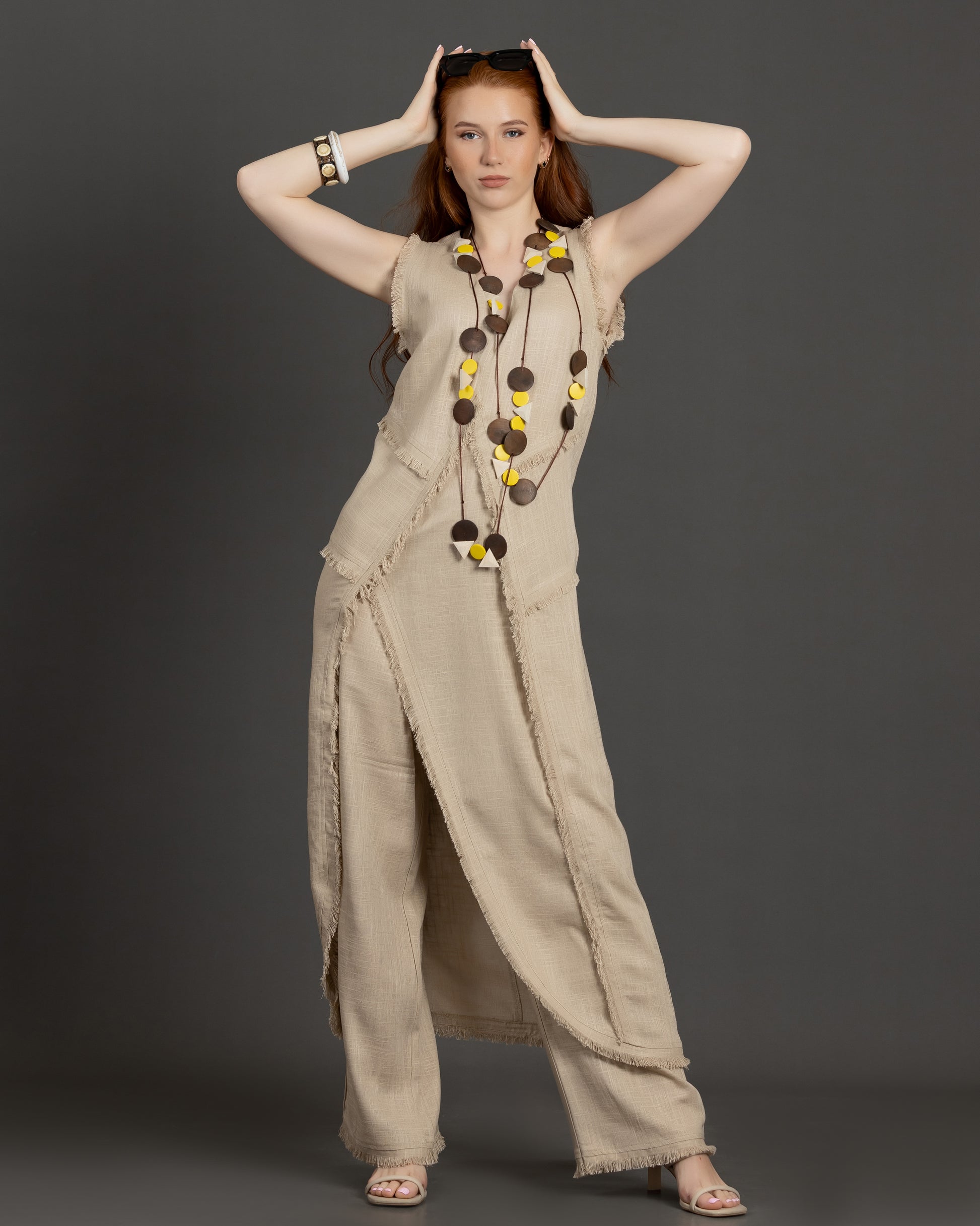 A long, flowy linen top featuring fringe detailing, a side slit, as well as an imported soft linen fabric.